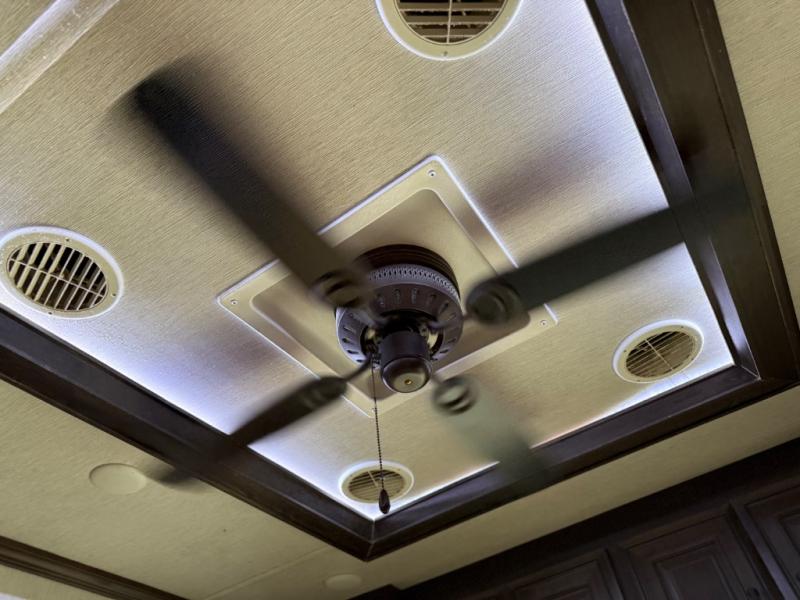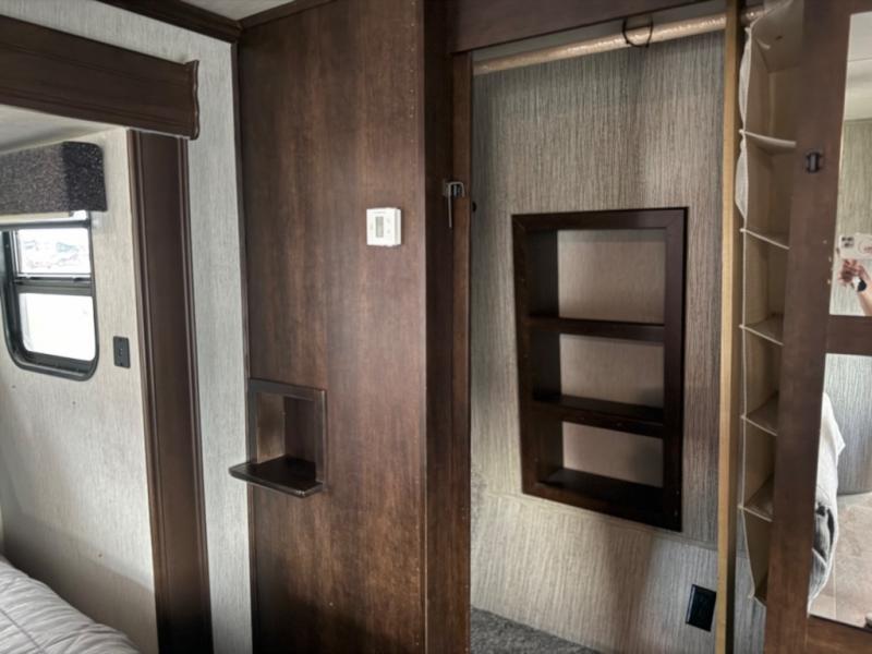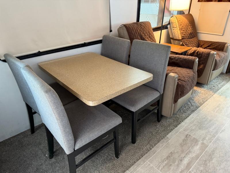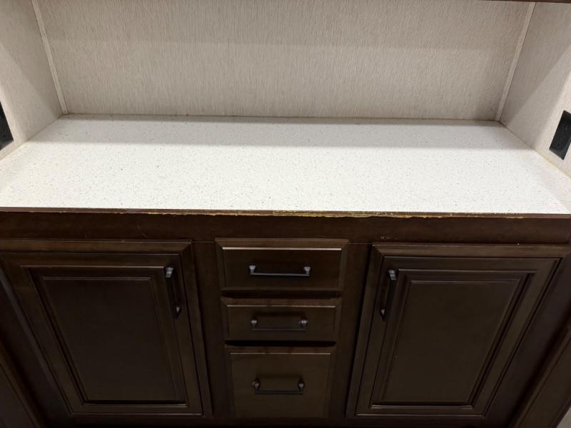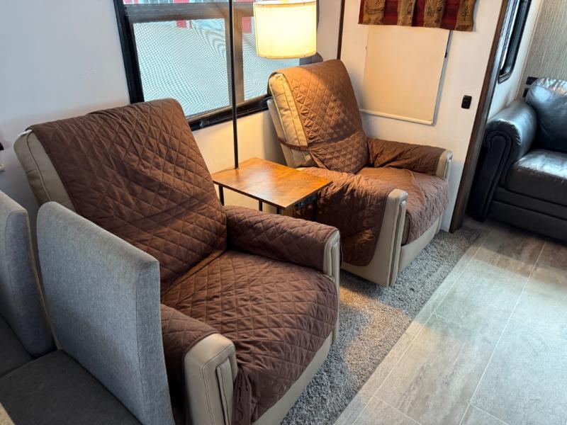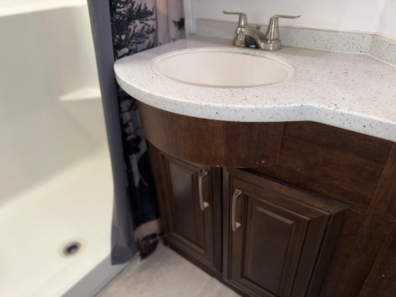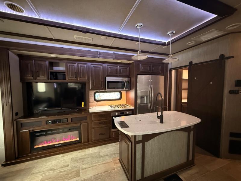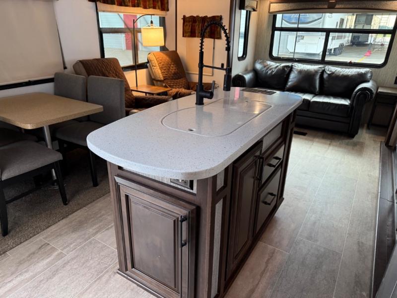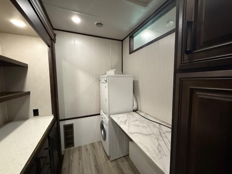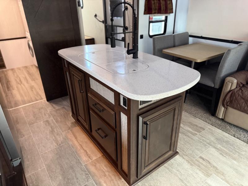 This unique fifth wheel includes its own laundry room and pantry with a large sink, a closet for a washer and dryer if you choose to add that option, plus counter space and plenty of cabinets for storage. The full-timer will love this layout! Just imagine making meals in a spacious kitchen with a center island while watching the 55" LED HDTV and visiting with camping friends relaxing at the legless dinette or on the living room furniture. Afterwards you can visit outside under the awning before getting ready for nighttime. The full bathroom includes a shower with a seat, and the master bedroom allows you to store plenty of clothes, plus your outdoor gear has space in the exterior storage. Start living clean!