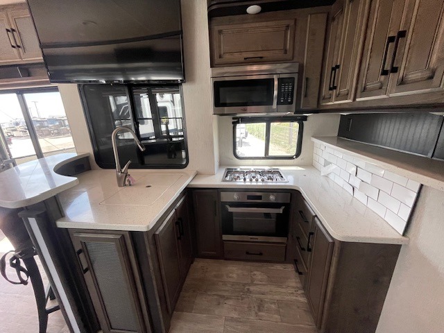 The Cyclone toy hauler fifth wheels by Heartland RV are not your ordinary toy hauler. These models have beautiful cabinets and plenty of comforts throughout such as high quality residential furniture, a 55” LCD HDTV flat screen TV, cable TV and satellite hook-ups, plus a separate DVD/CD/MP3 Bluetooth stereo for the garage and exterior. Along the exterior there are stunning graphics and you will enjoy the view out of the large bedroom picture windows. The two side awnings with LED lights provide plenty of shade during the day, and at night you can grab a snack, your camp chair, and enjoy visiting outdoors just a bit longer. The ultra-light ramp door allows you to easily load your off road toys. In the garage you will also find an electric rear screen, decorative chair rail, plus built-in overhead cabinets with an entertainment center and more! You may even want to add the S5 Package which includes a 2nd fuel cell, 40" garage TV, solid surface counter top in the bedroom, central vacuum, 32" bedroom TV, and upgraded furniture with USB ports and built-in tables.
