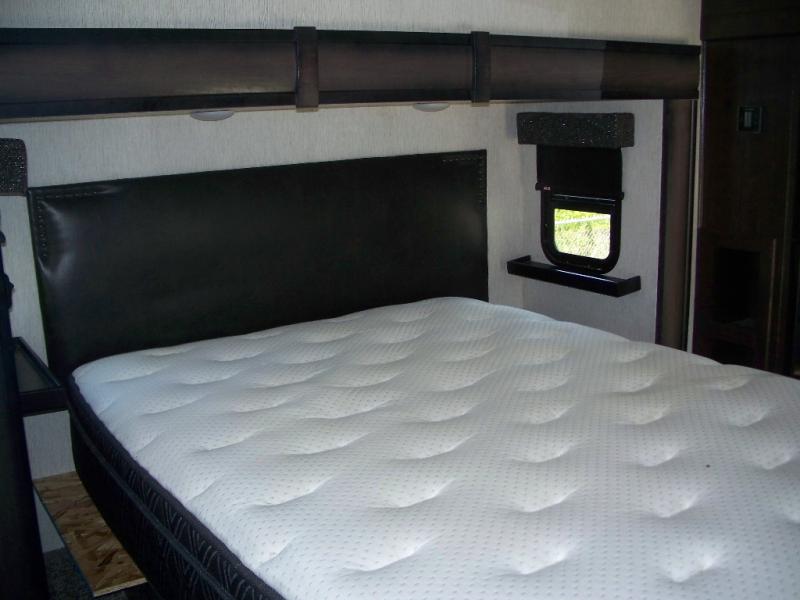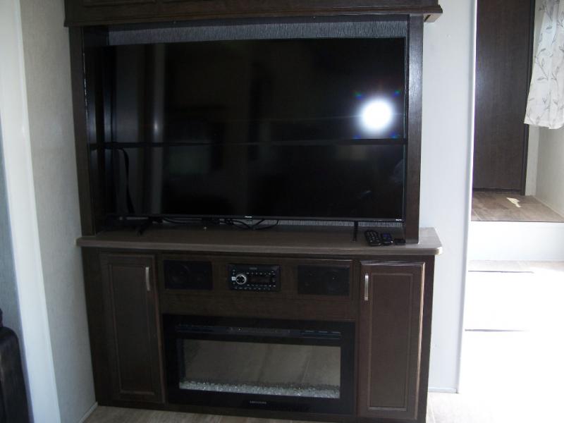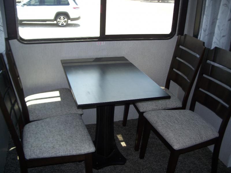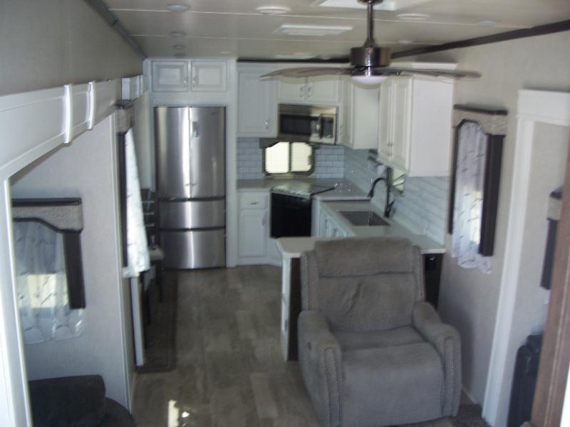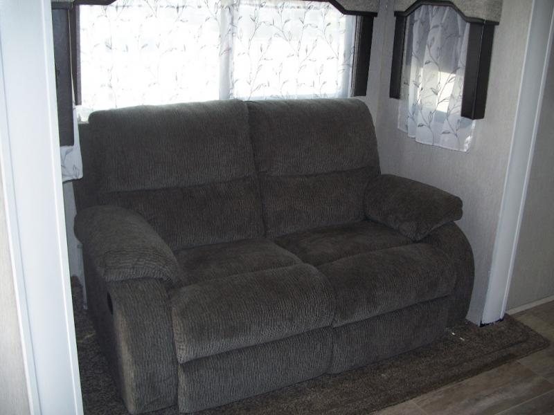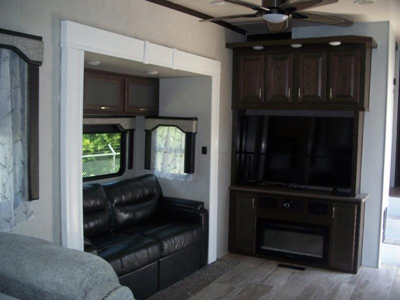 For an enjoyable weekend getaway or long trip across the country, this Elkridge fifth wheel is what you need to get you there. Whether you're lounging on one of the opposing tri-fold sofas or the theater seats with heat and massage capabilities, you will love the comfort and relaxation found throughout this trailer. Playing a game of cards on the free-standing table with chairs while dinner is being prepared on the three-burner range top in the adjoining kitchen will make you feel like you're in your own home, and the private bedroom will deliver the seclusion you are accustomed to.