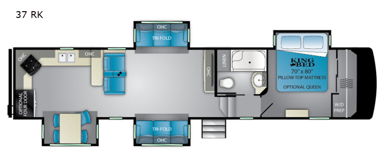 For an enjoyable weekend getaway or long trip across the country, this Elkridge fifth wheel is what you need to get you there. Whether you're lounging on one of the opposing tri-fold sofas or the theater seats with heat and massage capabilities, you will love the comfort and relaxation found throughout this trailer. Playing a game of cards on the free-standing table with chairs while dinner is being prepared on the three-burner range top in the adjoining kitchen will make you feel like you're in your own home, and the private bedroom will deliver the seclusion you are accustomed to.