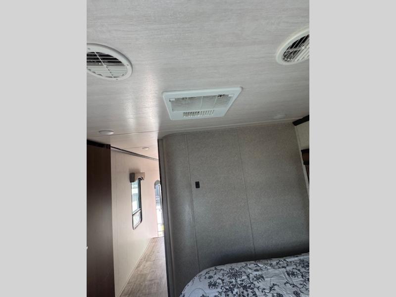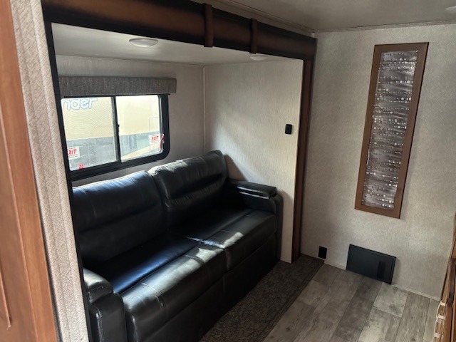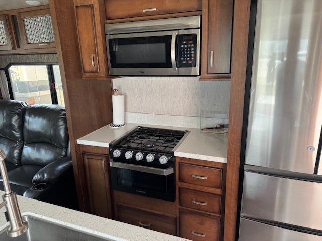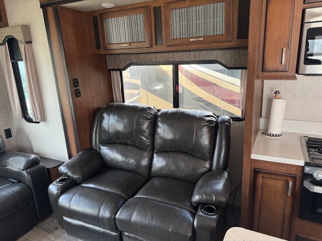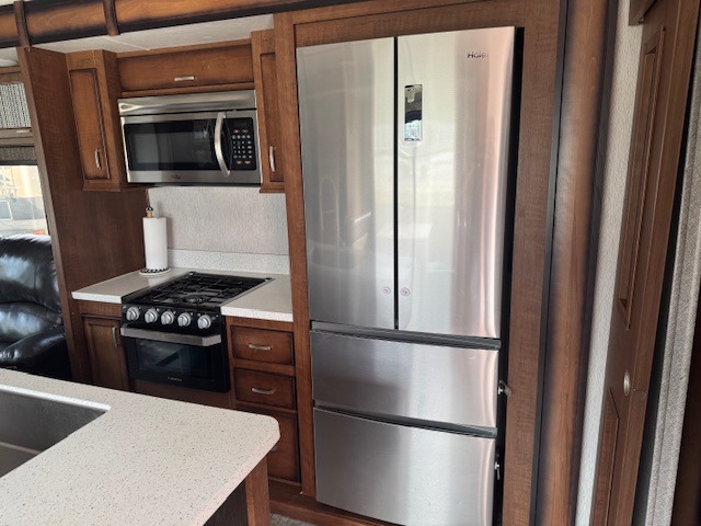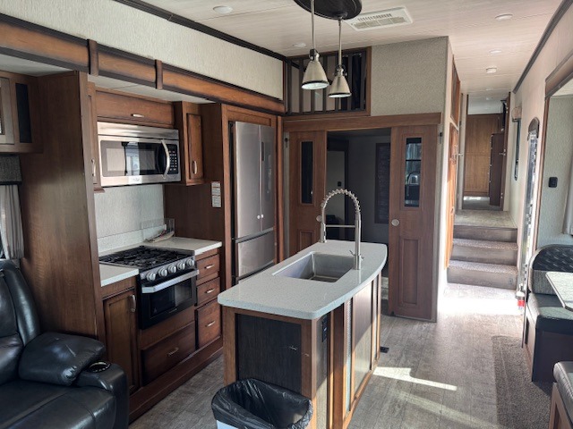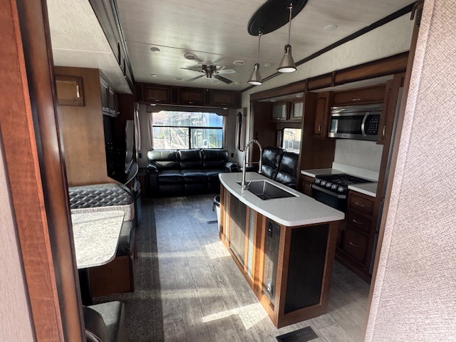 Whether you enjoy lounging by the lakeside or hiking in the forest, this Elkridge fifth wheel is the perfect addition to each of your upcoming adventures. With its impressive amount of interior space that is made possible because of four slides and its many different sleeping accommodations, like the loft and two private bedrooms, this trailer is a gem to have no matter where you travel. The interior kitchen is packed out with loads of amenities to make your meal preparations run smoothly, like the 13 cubic foot refrigerator and three-burner range top, and the outdoor kitchen will come in handy when you want a cool beverage after playing outside on a hot afternoon.