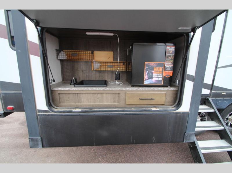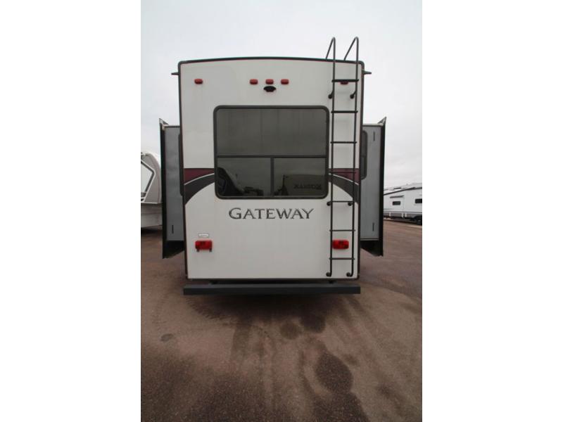 Get ready for any camping trip with this triple-slide Gateway fifth wheel. The cook of the family is going to love this kitchen space! There is a U-shaped countertop that will give you plenty of space for prepping meals, cooking, and cleaning up. In the rear living area there is a sofa which will give you added sleeping space if you need it. Not only will the cook be in love with the indoor kitchen space, but they also have the opportunity to do a little bit of cooking outside. There is an outdoor kitchen, and if you need a little bit of shade while you cook, you can simply open up the electric awning with LED lights and enjoy the great outdoors.