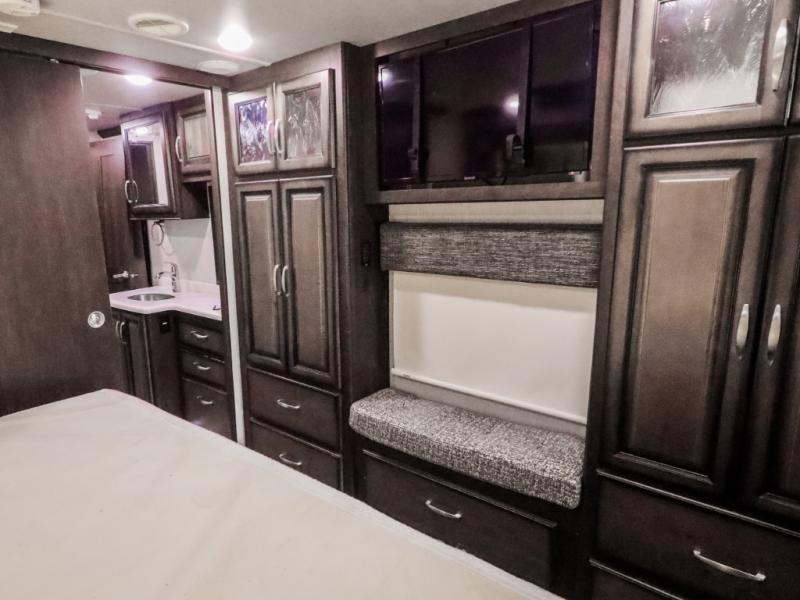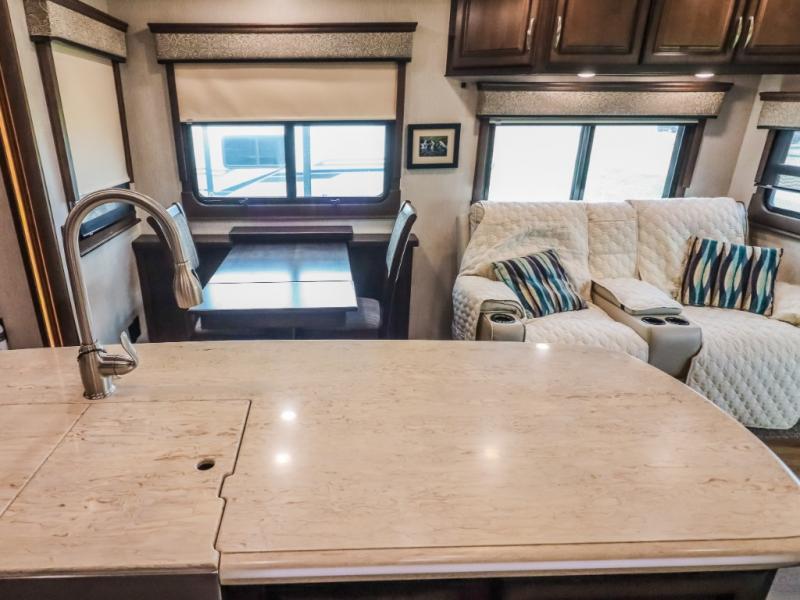 Enjoy spending time away from home and in the comfort of this Heartland Landmark 365 Newport. Throughout this model you will find plenty of features that you would expect from home. As you step inside you will love the LED lighting throughout, plus be sure to notice the edge lit solid surface countertops. When you are ready to watch a little TV then come enjoy the rear living area where you will find a TV with a soundbar, a comfortable sofa, and theater seats. While you are relaxing in the living room you can also charge your electronic devices from the USB ports at the sofa table plus so much more!