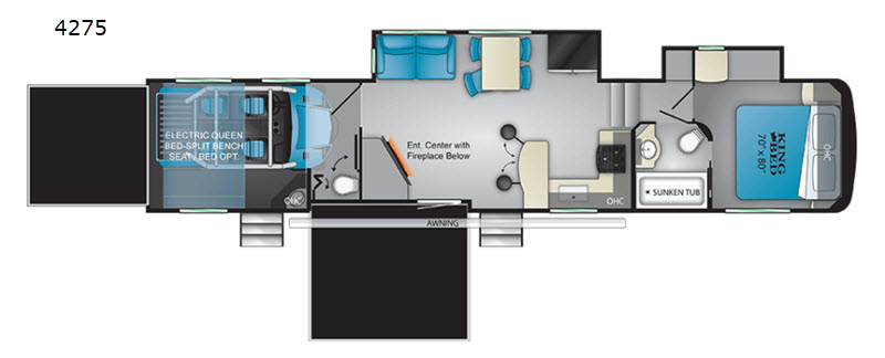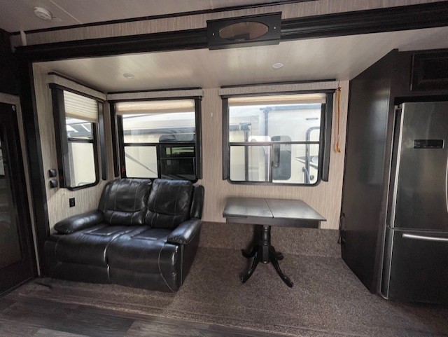 Do you desire a luxurious weekend getaway, but want to bring along your favorite off-road toys with you? Well, come check out this Heartland Road Warrior toy hauler! With 13' of garage space, you will have plenty of room to bring them along. After you've unloaded your toys, you can enjoy the comforts this unit provides, including the bath and a half, the LED TV in the living room, and two swivel stools at the kitchen counter. What better way to relax after a fun filled day than to sit on the sofa in front of the fireplace with your favorite beverage. The table with chairs is the perfect spot to enjoy your meals at or play a card game. And when you're read to hit the sack, head into the front private bedroom for a good night's rest on the king bed!
