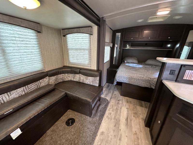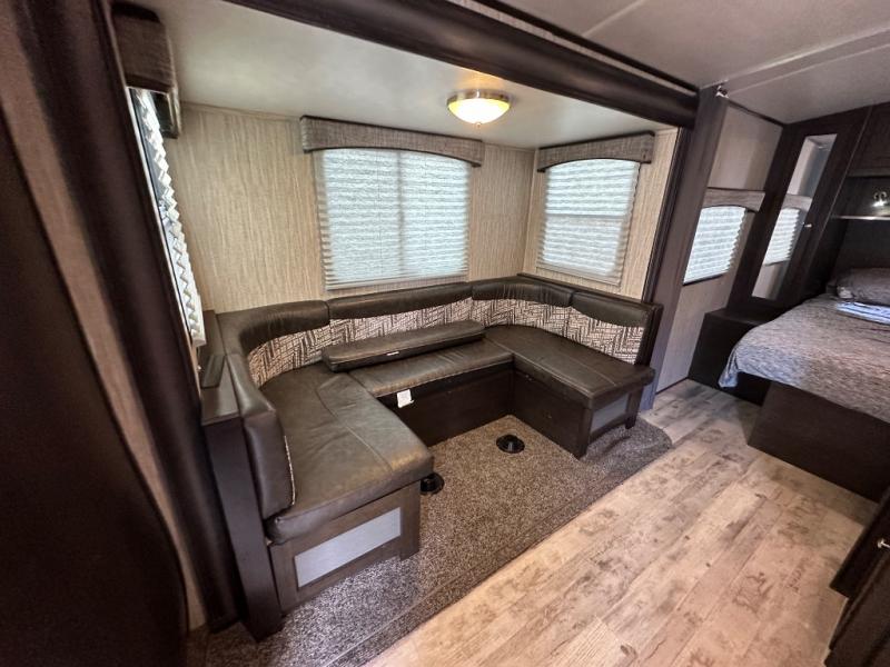 Are you ready for a relaxing time away from home? Well, load up your family, your camping gear, and head out to your favorite quiet retreat with this single slide out travel trailer. The convenience of the rear bathroom near the entry door allows you to quickly get outside for more fun. You will find everything that you need to adequately get ready for the day from the radius shower to the bathroom sink. Everyone can eat meals at the U-dinette and at night this area easily converts into additional sleeping space. In the kitchen area there is plenty of counter space for meal prep, and when you are ready to turn in for the night head to the front where you will find a queen bed and more! This is a perfect travel trailer for a couple or smaller family.