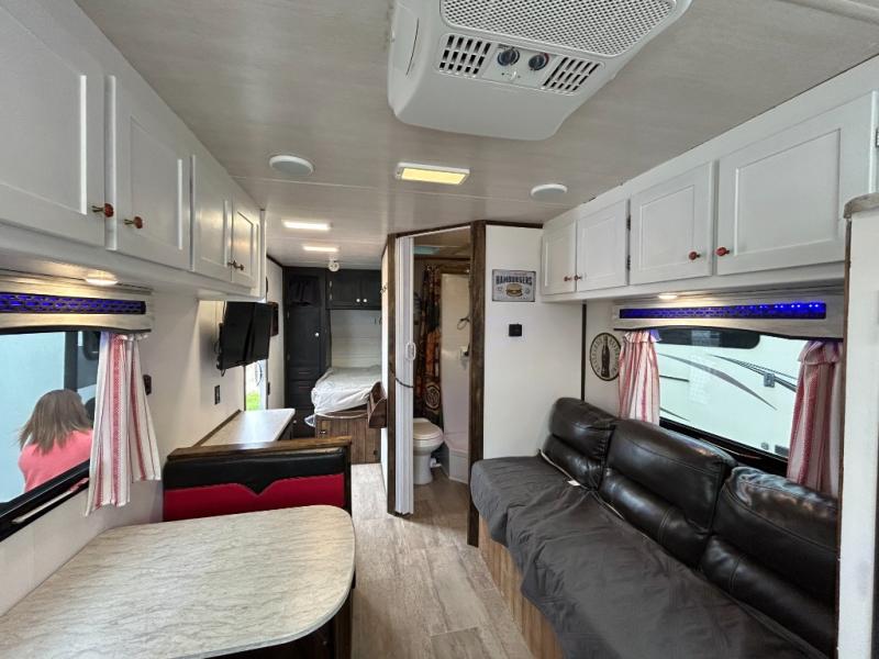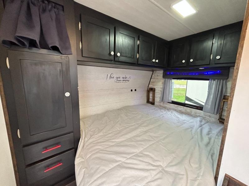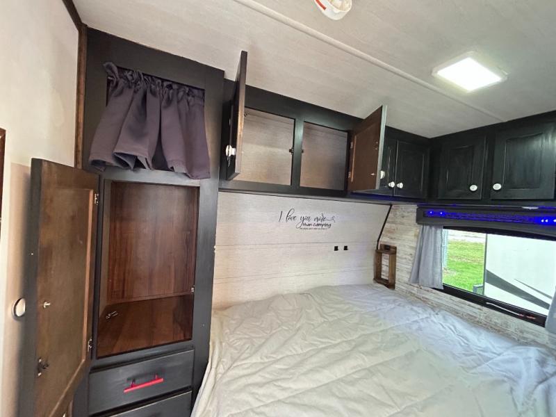 Load up your family of four, your camping gear, and head out for a long weekend with this V22 Terry Classic travel trailer by Heartland RV in tow. This model is lightweight, yet packed full of modern conveniences. The front kitchen features stainless steel appliances such as a 6 cu. ft. refrigerator and a two burner range. There is plenty of counter space which makes meal prep easy, plus you will enjoy the view out the front window as you work. When you are ready to call it a night, come enjoy the comfort of the rear queen bed where you can rest up for another day of fun! Throughout this model there are plenty of overhead cabinets where you can stow away your personal belongings, plus so much more! Inside you will enjoy LED ceiling lights with cove surround blue accent lights and in the living room there is a 32” LED TV.
