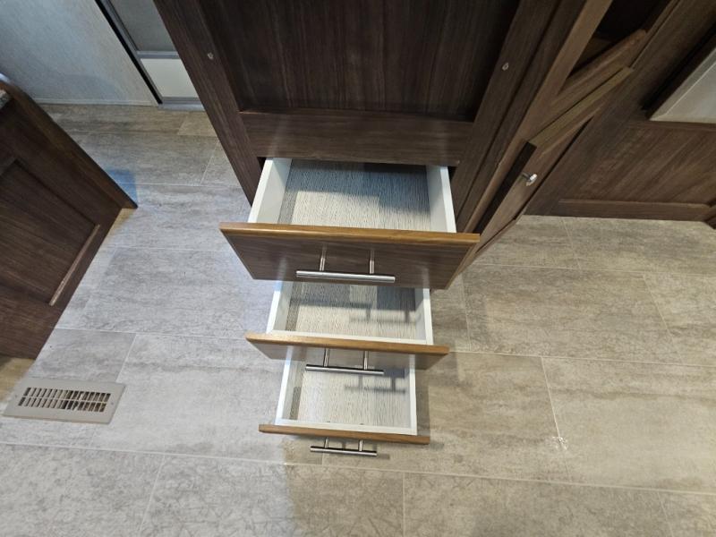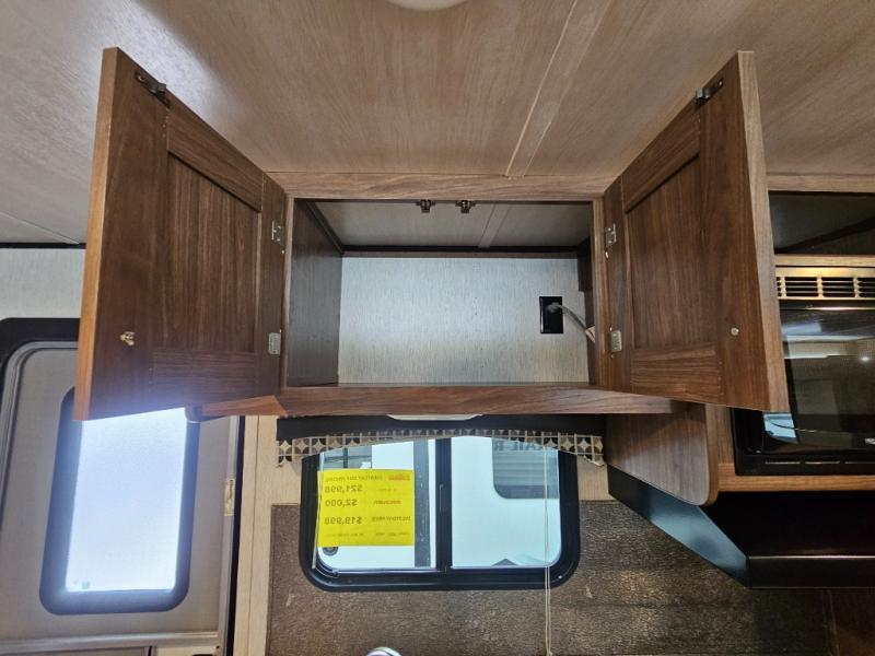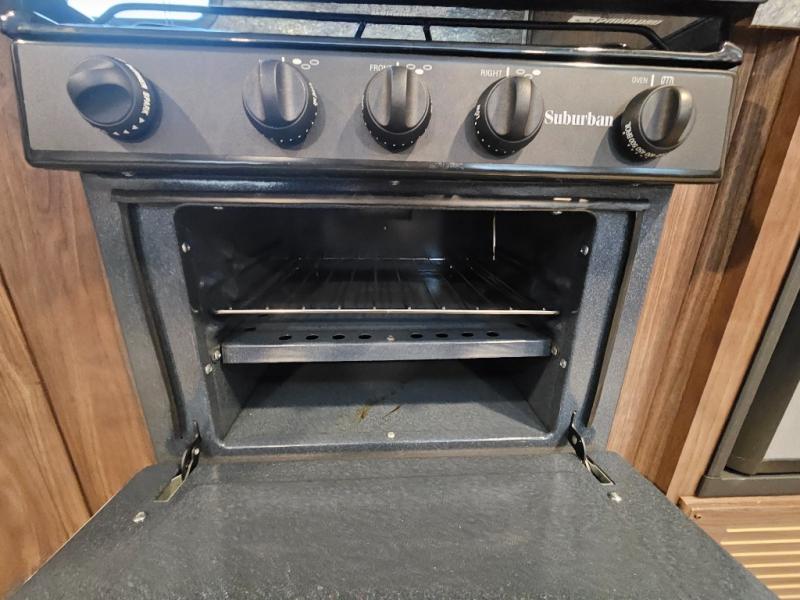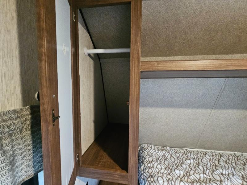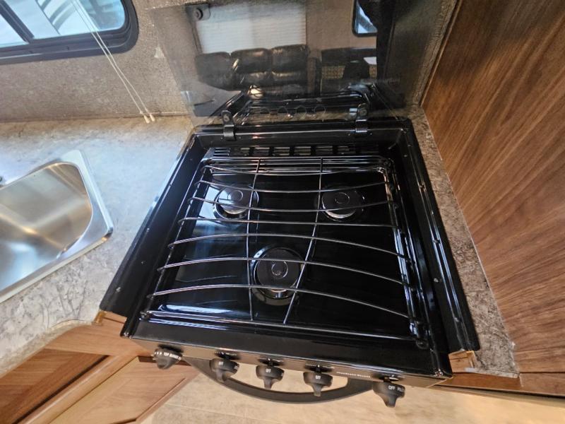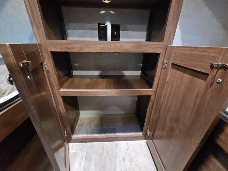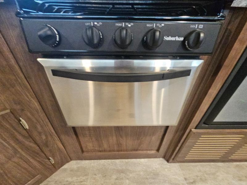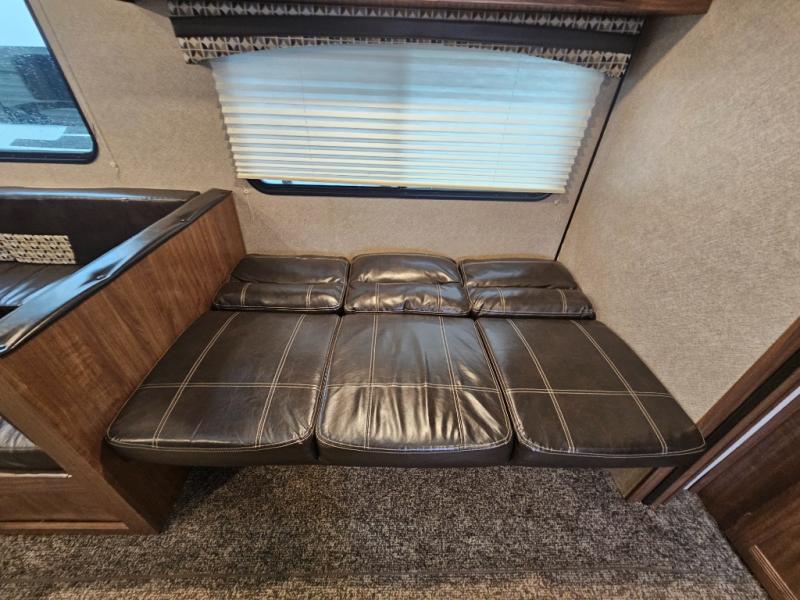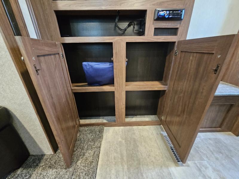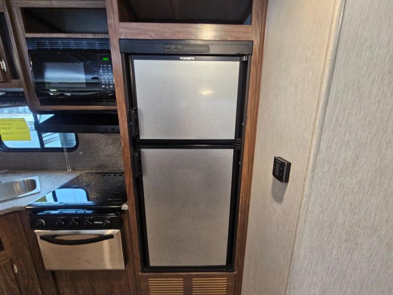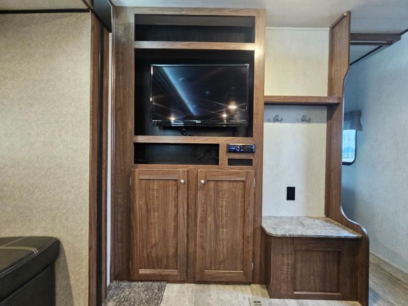 The Trail Runner SLE is lightweight and easy to tow behind almost any vehicle. Along the outside there is an aluminum front and an aerodynamic radius front profile. There are also upgraded Dexter axles with electric brakes and tinted safety-glass windows. In the evening you may even want to sit outside and listen to music with the two exterior LED-lit speakers. Inside there is a USB charging port for your electronic devices and an AM/FM/CD stereo with Bluetooth capability. The innerspring mattress will not only provide a good night's rest, but it will also give you a place to store extra belongings with the under-bed storage.