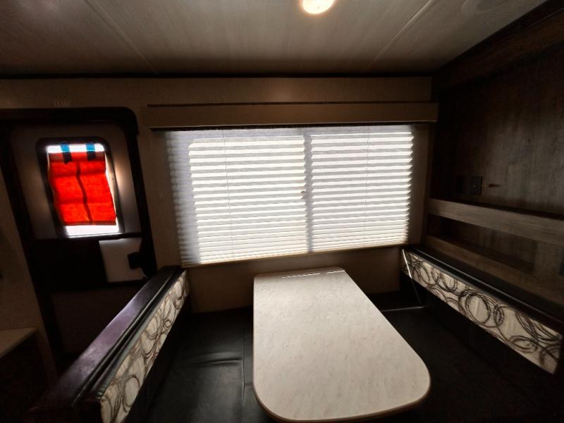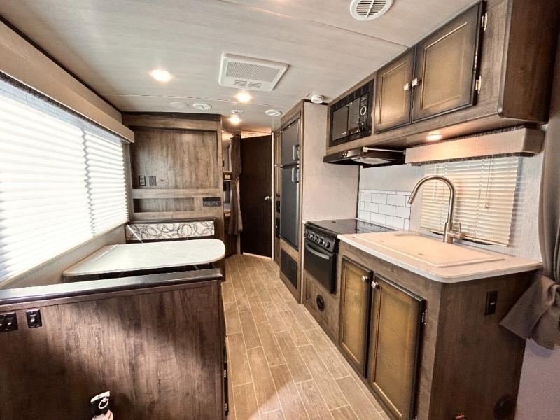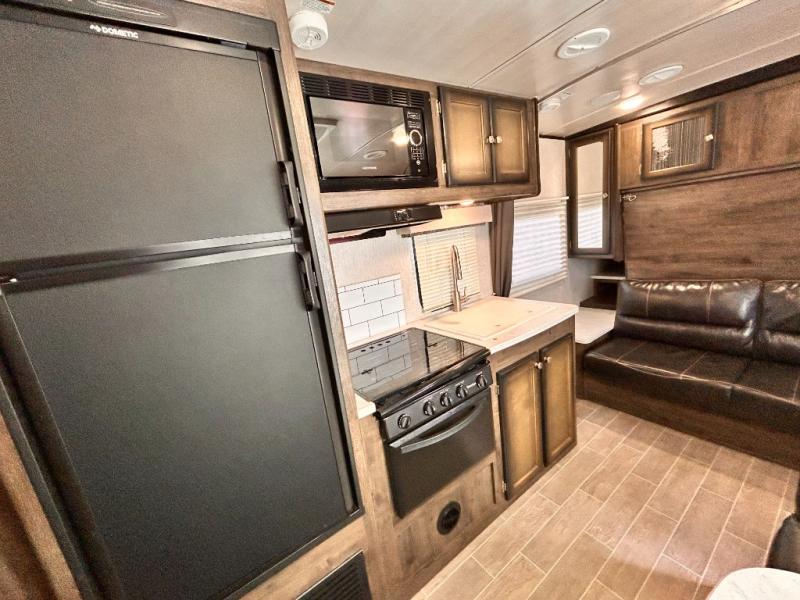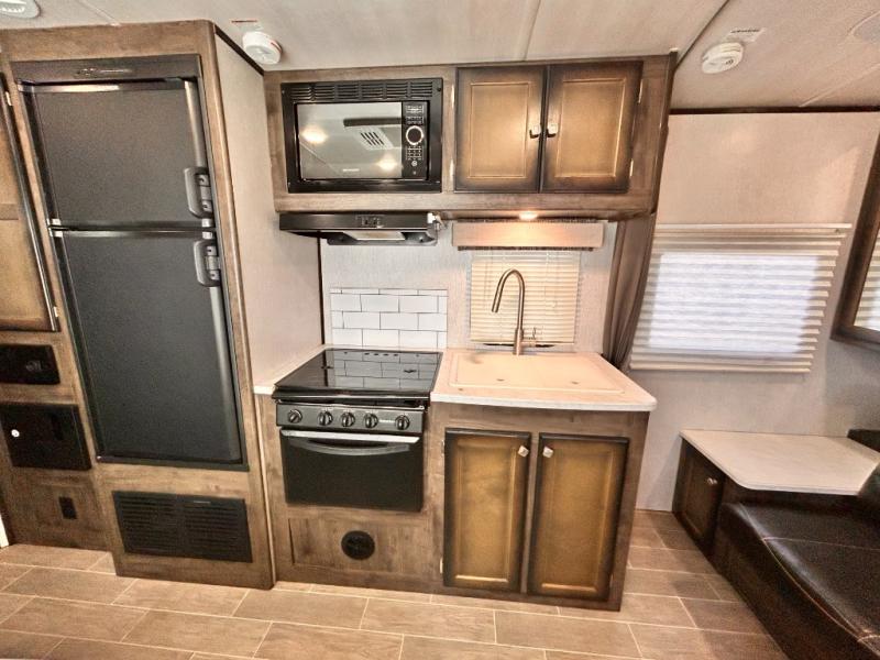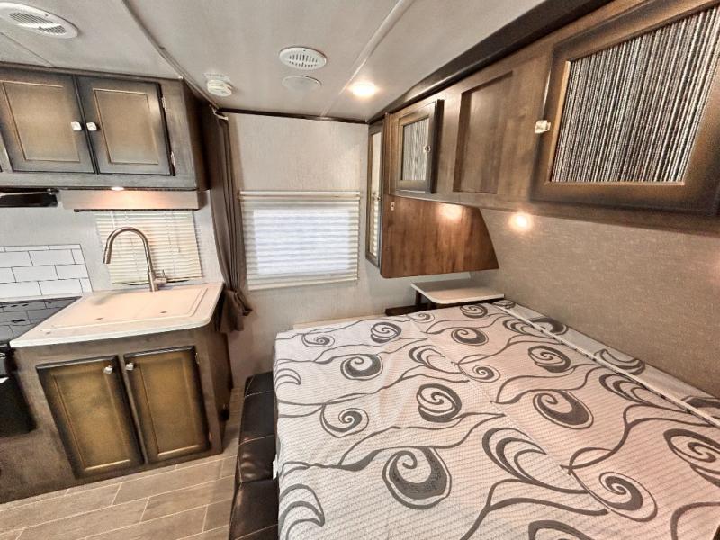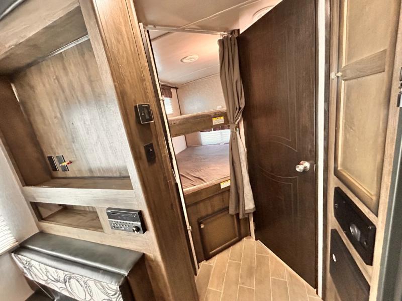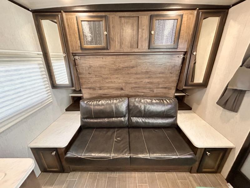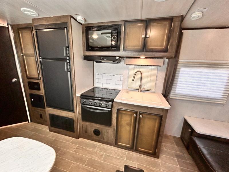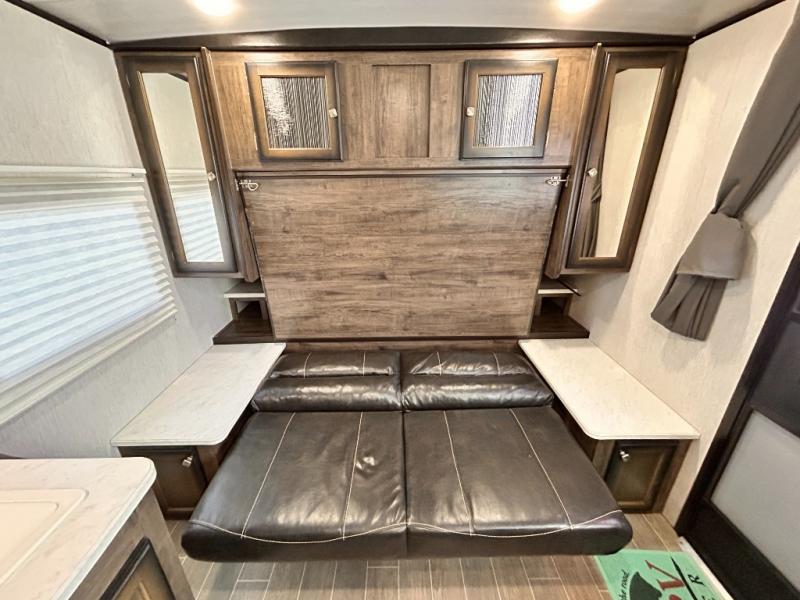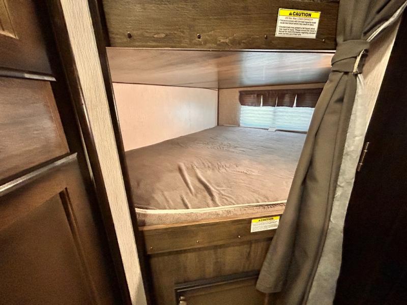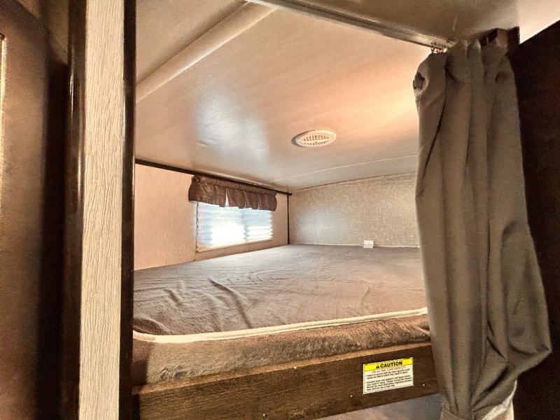 It's time to enjoy the great outdoors at your favorite campsite then return to your own travel trailer with sleeping space for seven, a full bathroom to skip the campgrounds facilities, and a kitchen with appliances to make a warm meal when you aren't cooking over the campfire or on the outside kitchen. The front of this unit includes a sofa during the daytime, and a Murphy bed at night. You can even close the curtain for privacy to create a bedroom away from the queen size bunk beds and dinette. You will also find plenty of storage for your food and clothing.