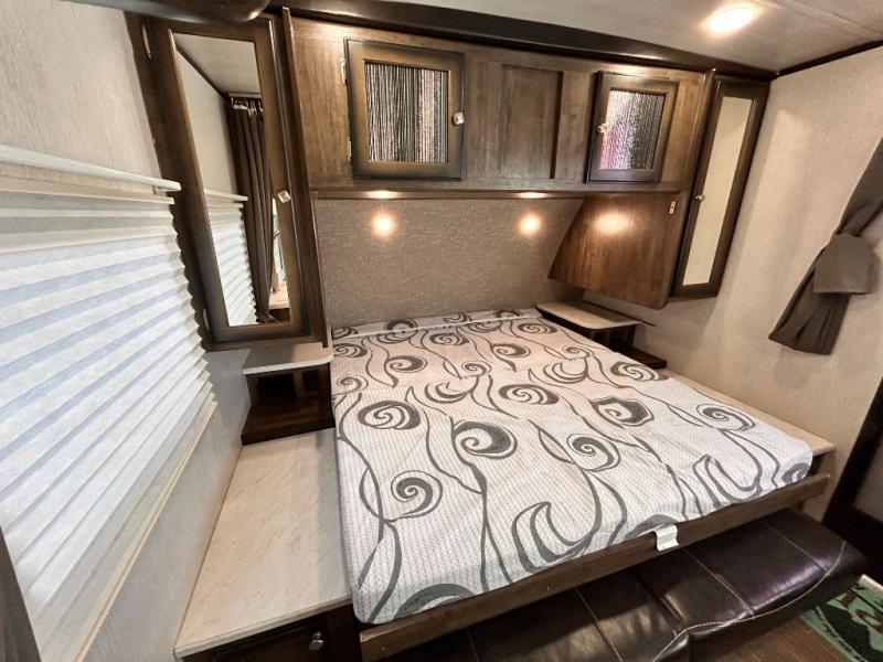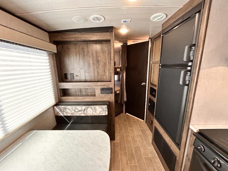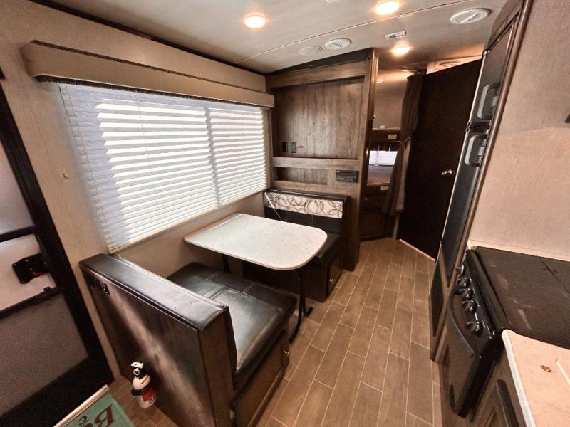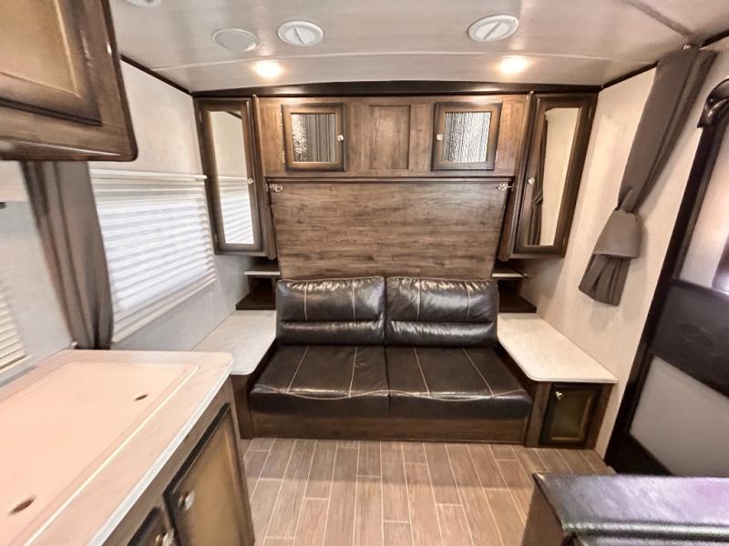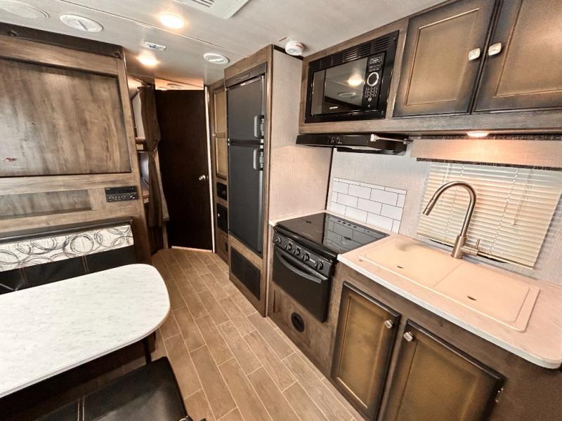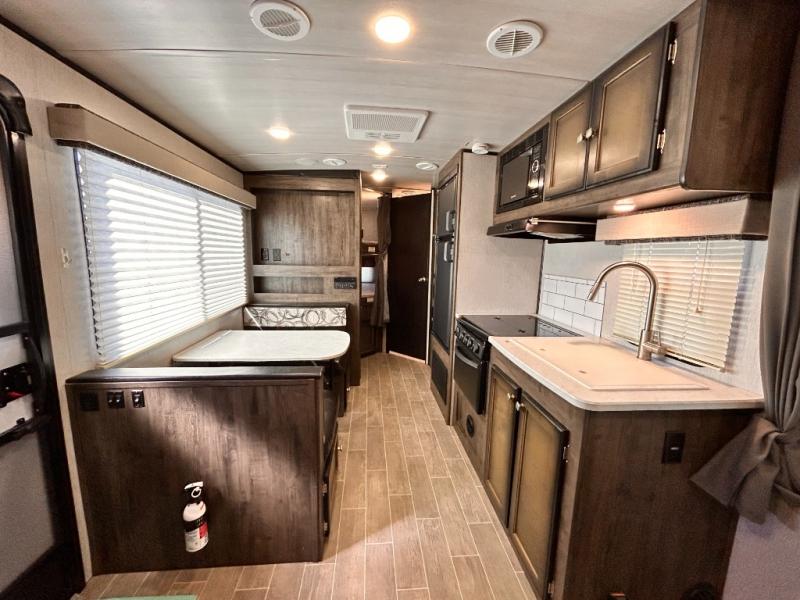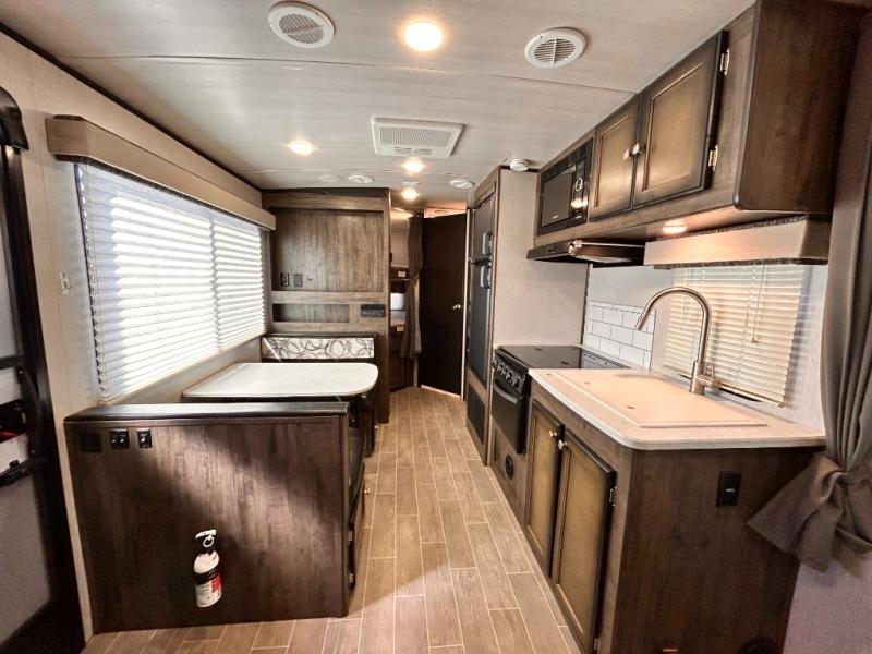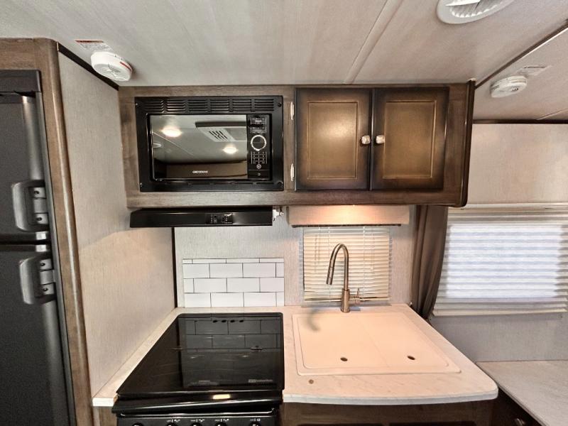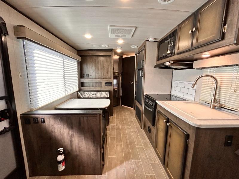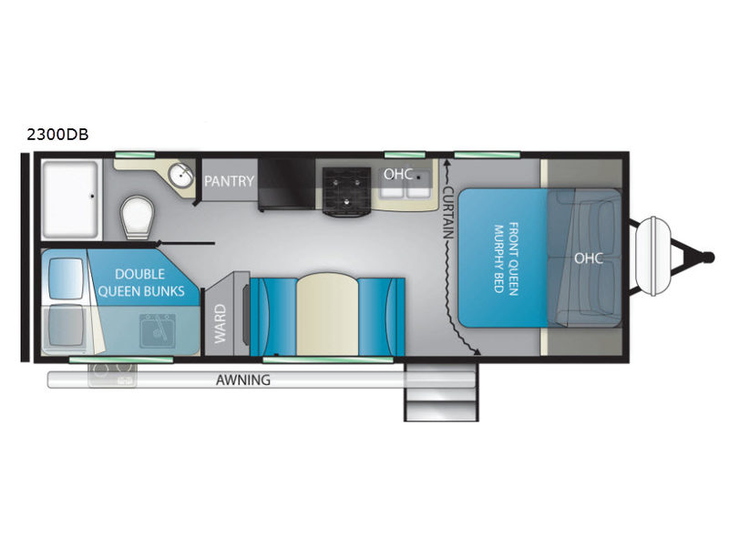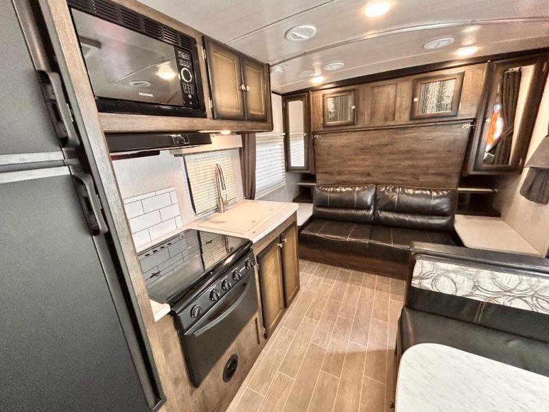 It's time to enjoy the great outdoors at your favorite campsite then return to your own travel trailer with sleeping space for seven, a full bathroom to skip the campgrounds facilities, and a kitchen with appliances to make a warm meal when you aren't cooking over the campfire or on the outside kitchen. The front of this unit includes a sofa during the daytime, and a Murphy bed at night. You can even close the curtain for privacy to create a bedroom away from the queen size bunk beds and dinette. You will also find plenty of storage for your food and clothing.