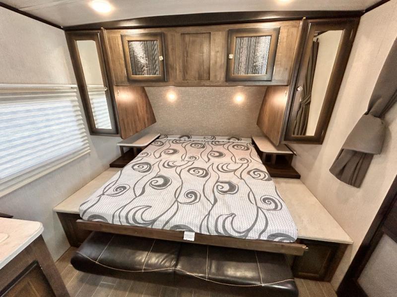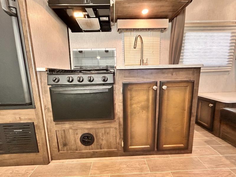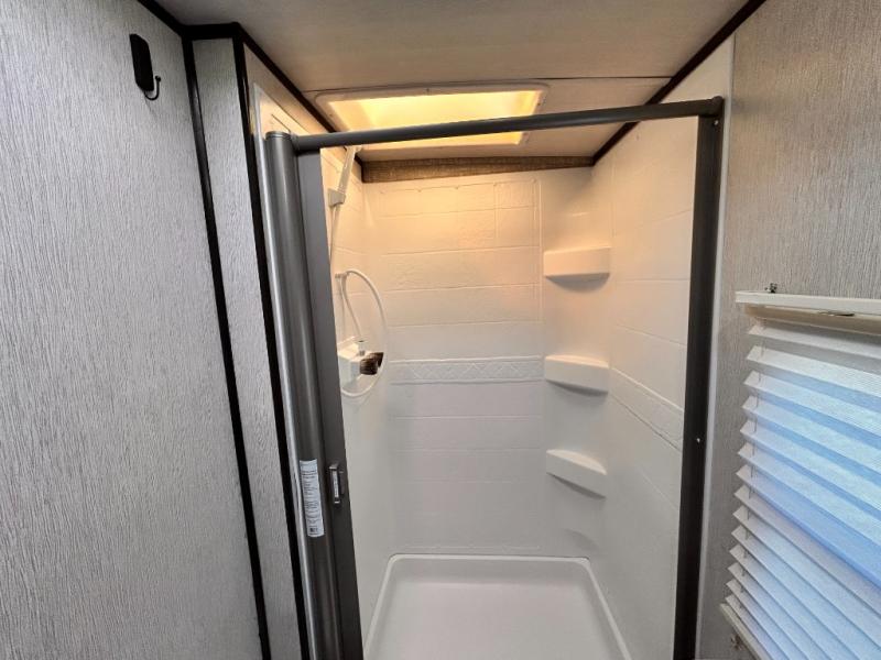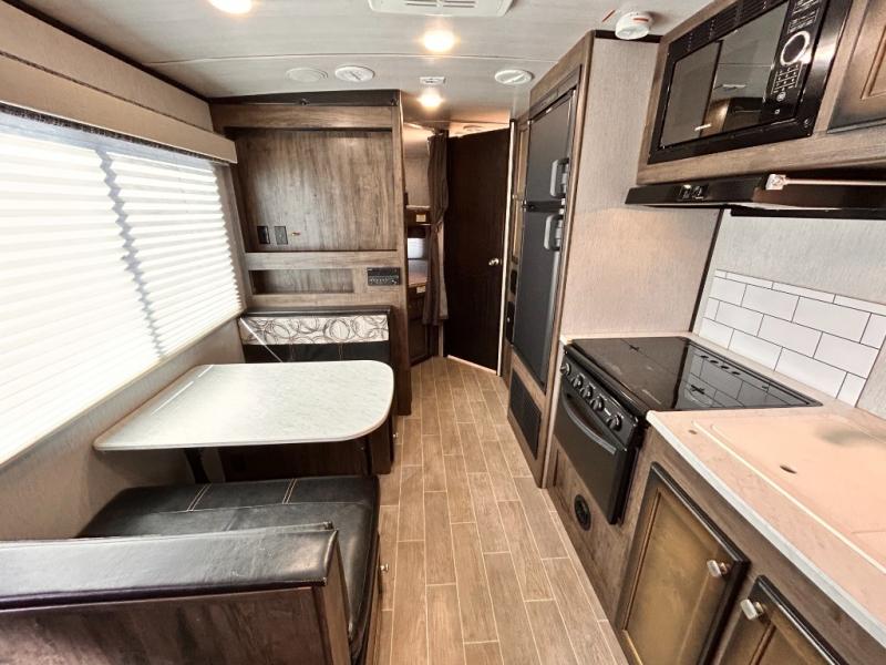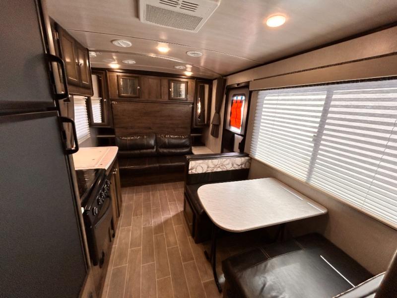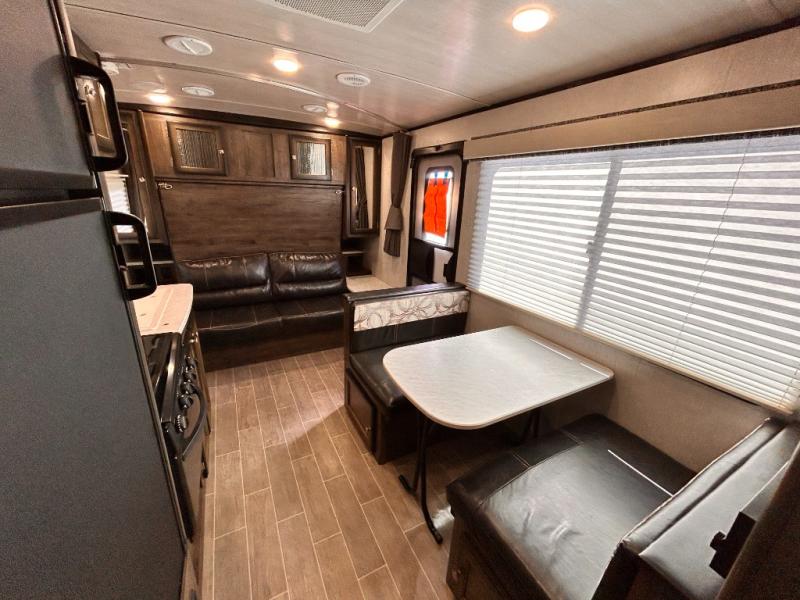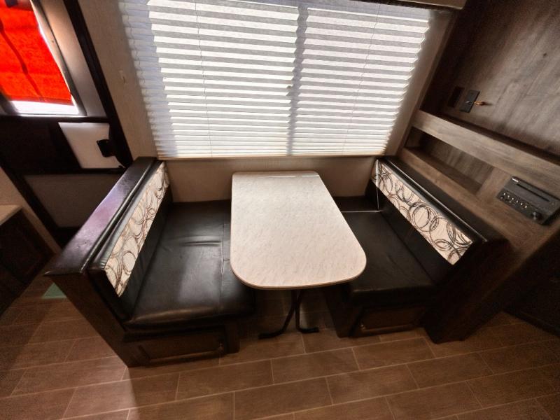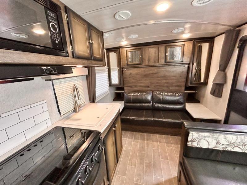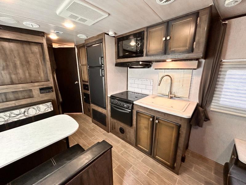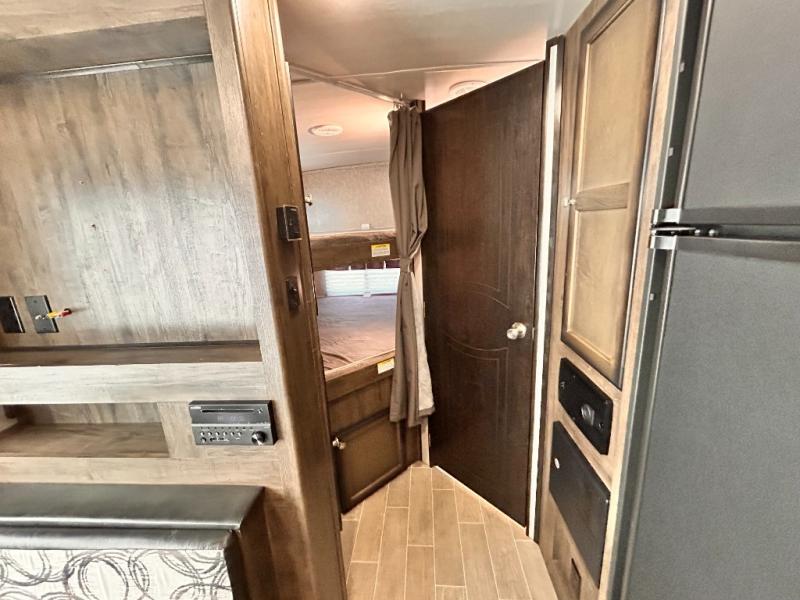 It's time to enjoy the great outdoors at your favorite campsite then return to your own travel trailer with sleeping space for seven, a full bathroom to skip the campgrounds facilities, and a kitchen with appliances to make a warm meal when you aren't cooking over the campfire or on the outside kitchen. The front of this unit includes a sofa during the daytime, and a Murphy bed at night. You can even close the curtain for privacy to create a bedroom away from the queen size bunk beds and dinette. You will also find plenty of storage for your food and clothing.