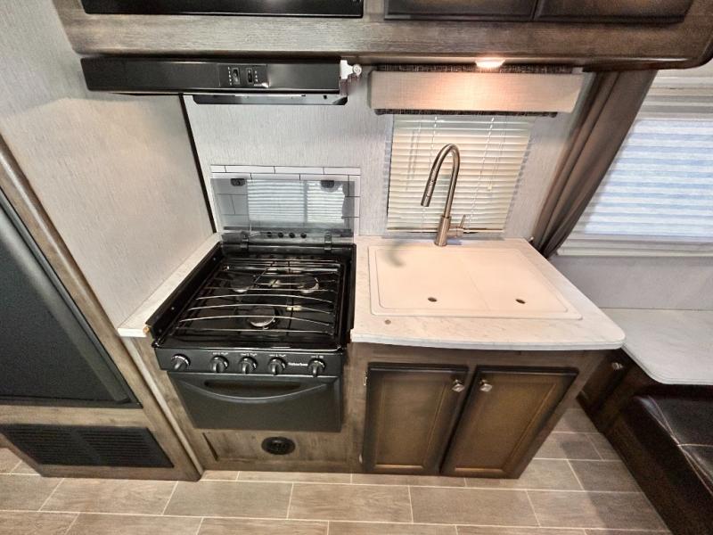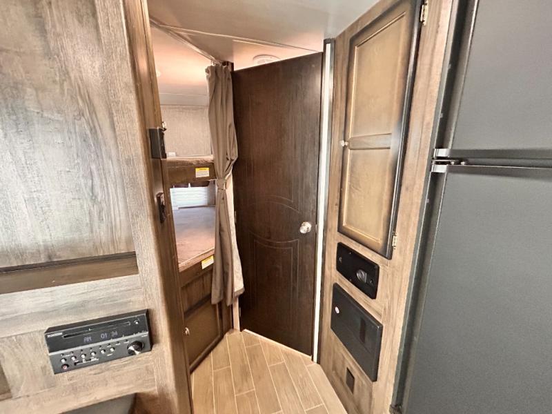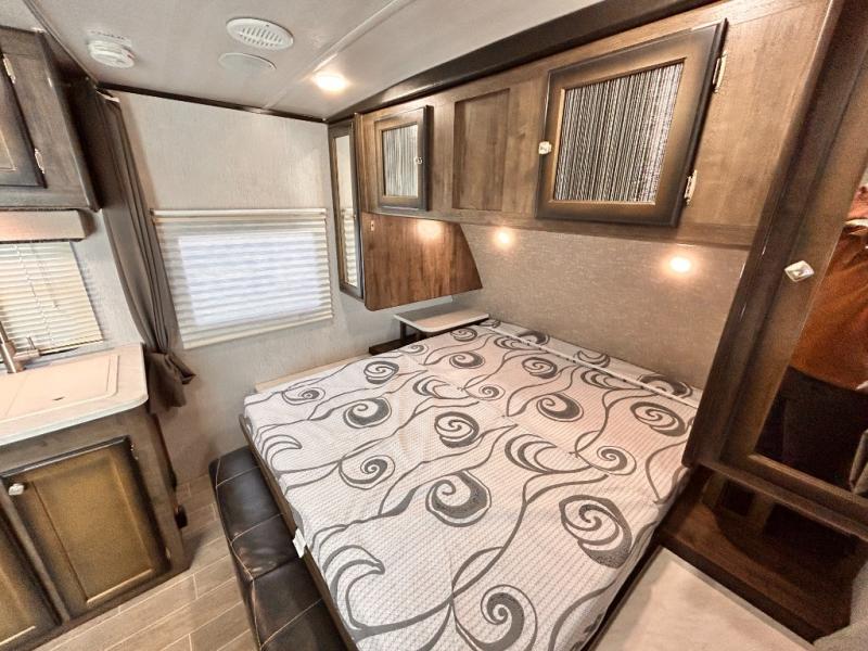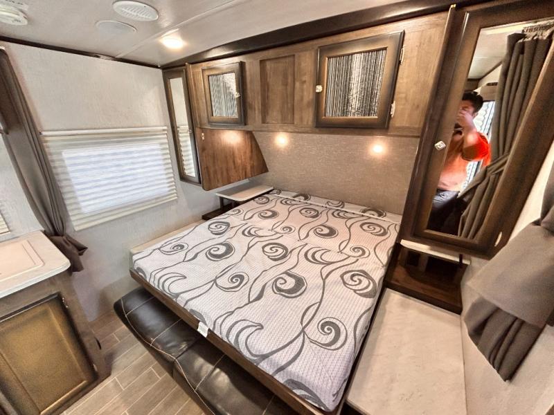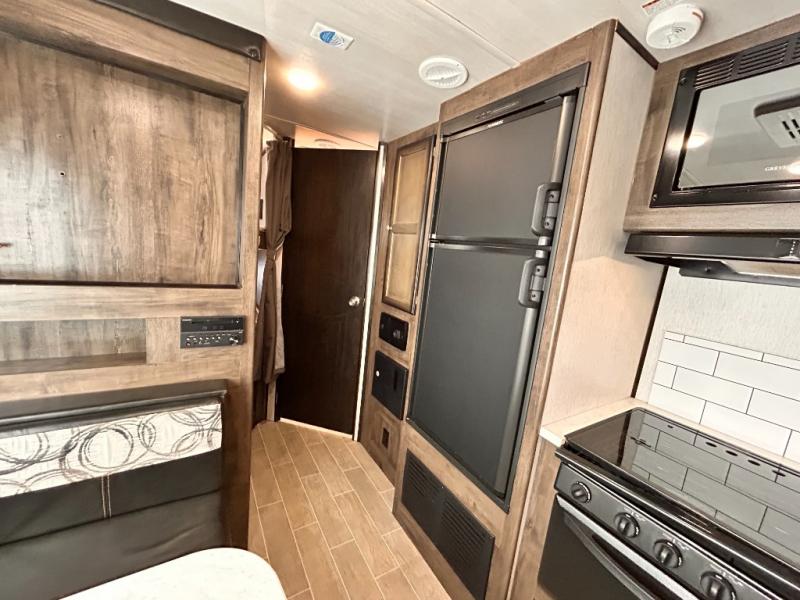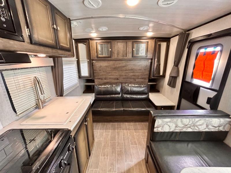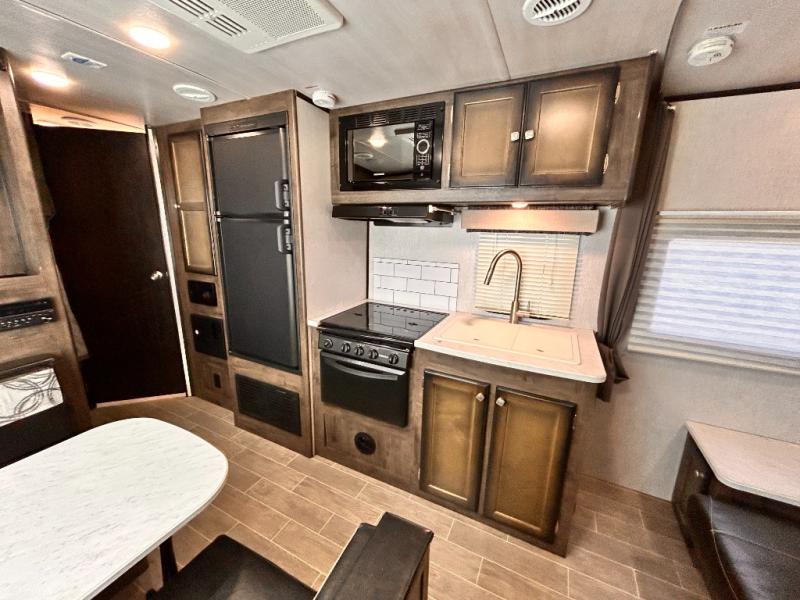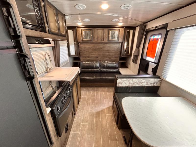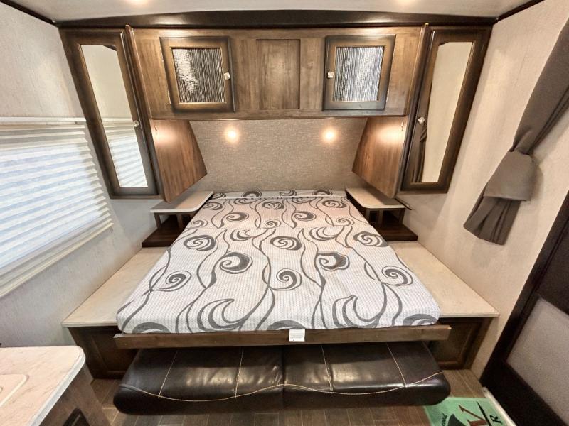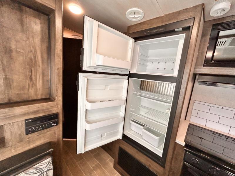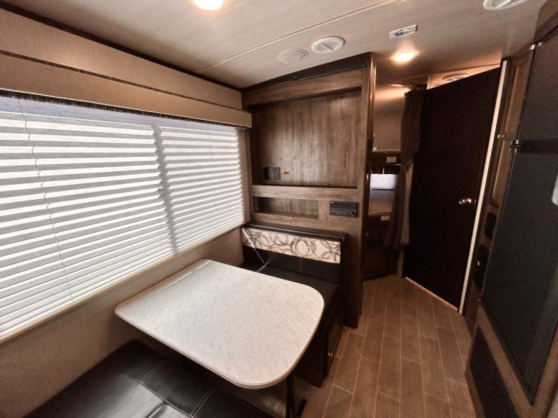 It's time to enjoy the great outdoors at your favorite campsite then return to your own travel trailer with sleeping space for seven, a full bathroom to skip the campgrounds facilities, and a kitchen with appliances to make a warm meal when you aren't cooking over the campfire or on the outside kitchen. The front of this unit includes a sofa during the daytime, and a Murphy bed at night. You can even close the curtain for privacy to create a bedroom away from the queen size bunk beds and dinette. You will also find plenty of storage for your food and clothing.