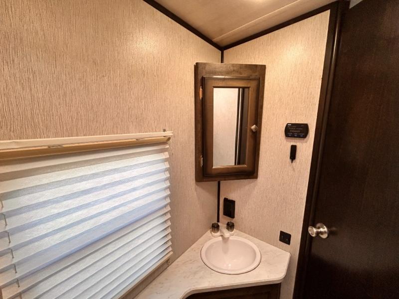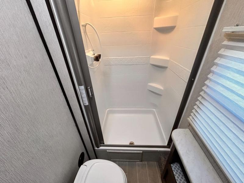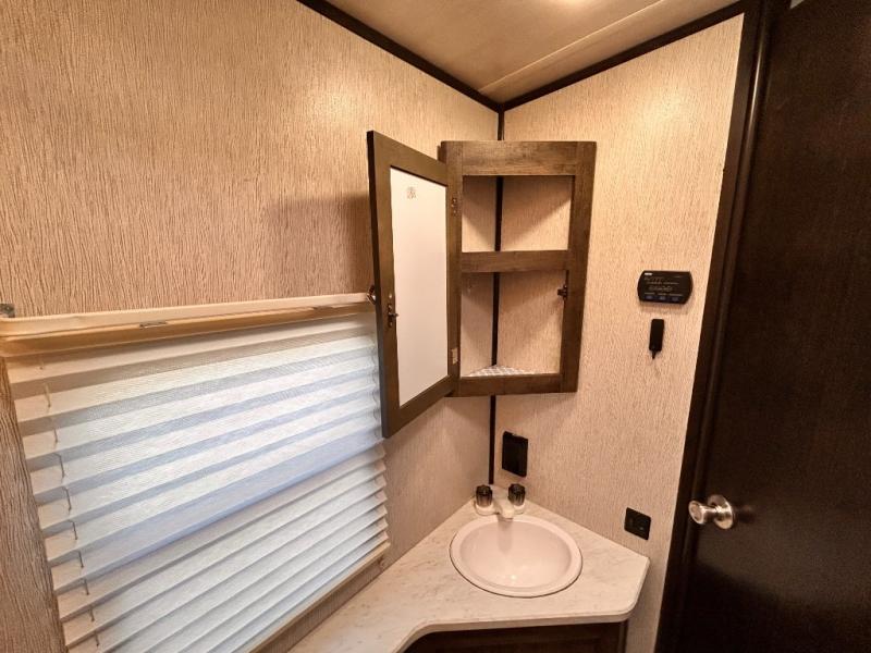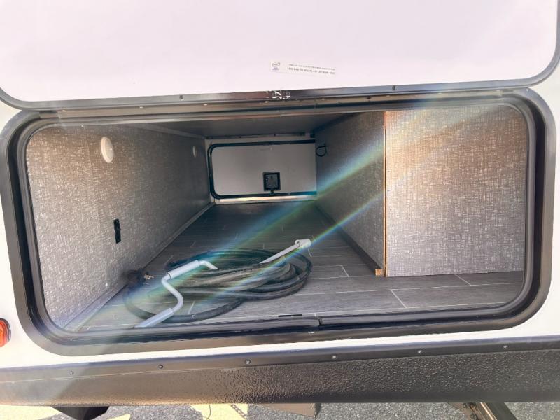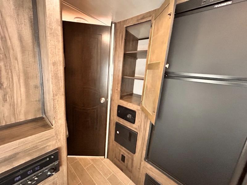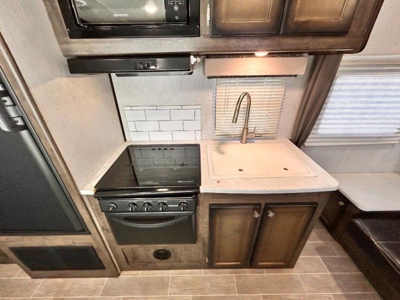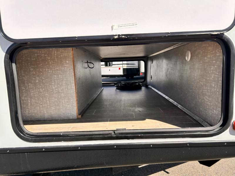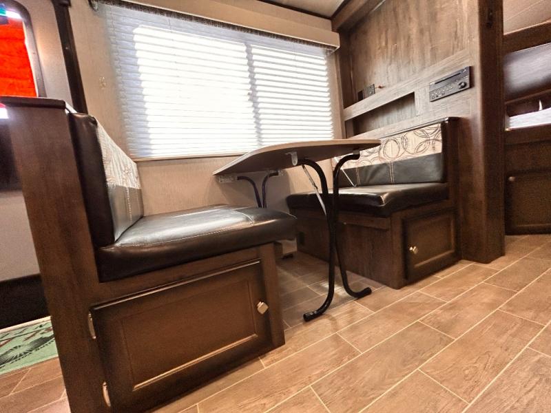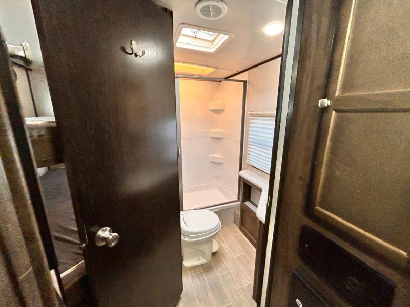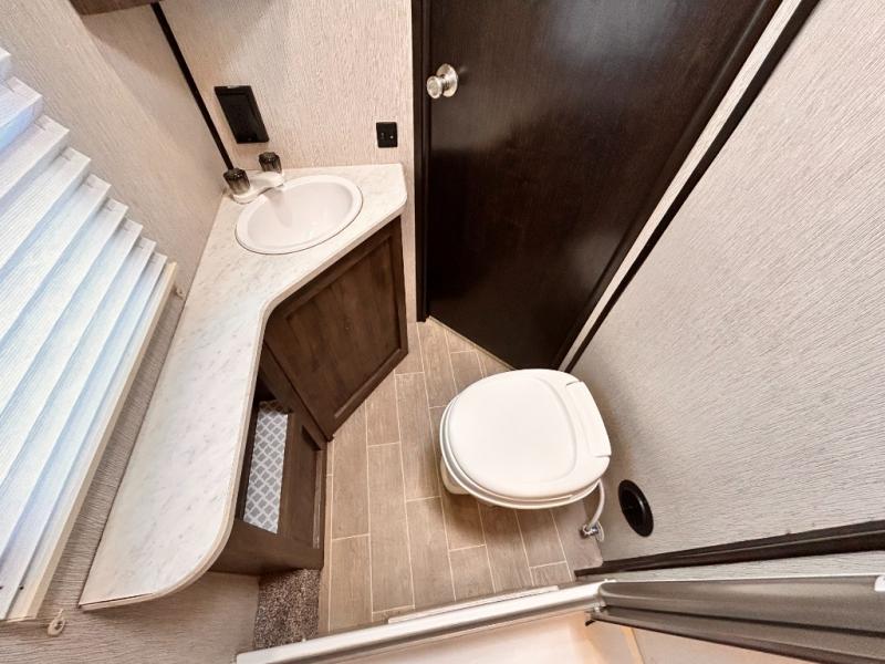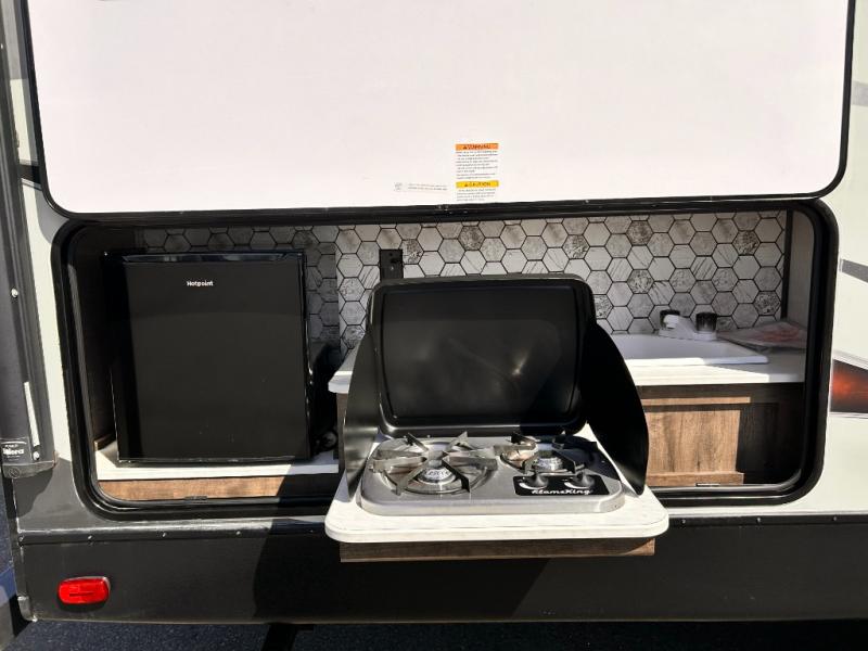It's time to enjoy the great outdoors at your favorite campsite then return to your own travel trailer with sleeping space for seven, a full bathroom to skip the campgrounds facilities, and a kitchen with appliances to make a warm meal when you aren't cooking over the campfire or on the outside kitchen. The front of this unit includes a sofa during the daytime, and a Murphy bed at night. You can even close the curtain for privacy to create a bedroom away from the queen size bunk beds and dinette. You will also find plenty of storage for your food and clothing.