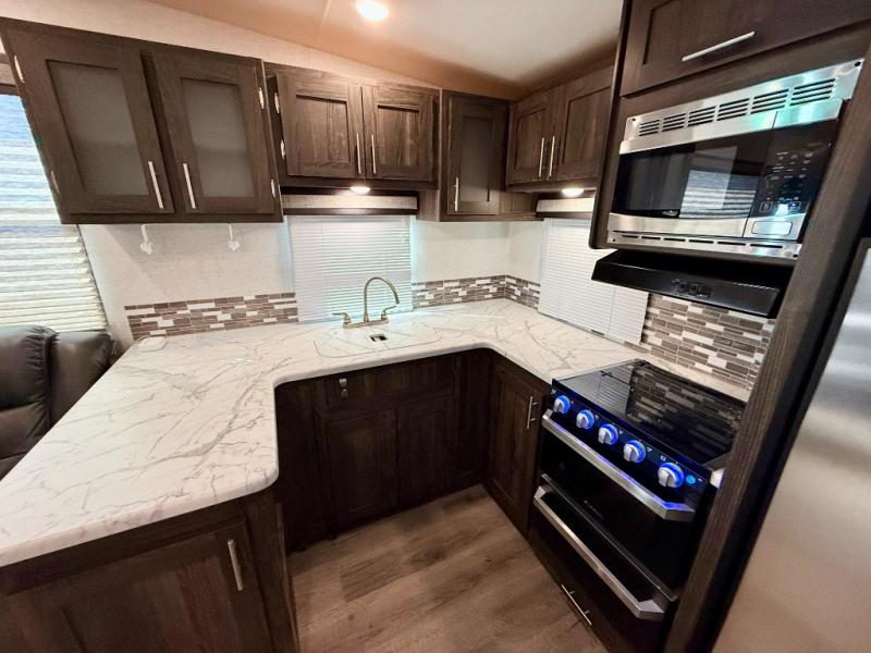 Just imagine the scenery you will see when this Mesa Ridge Lite fifth wheel is parked at your favorite campsite. You can relax under the awning, or at the U-shaped dinette and theater seats while visiting with the cook in the rear kitchen. The U-shaped countertop gives the chef plenty of room to prepare and serve meals, plus the stainless steel farm sink is a "must have" feature. You might even choose to cook outside on the outdoor kitchen. Come see what else makes this model the right choice for you!