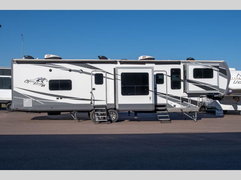 It's time to stop imagining all the fun you will have away from home, and hitch up this Open Range 3X fifth wheel and hit the road. Model 3X387RBS offers a separate living area from the kitchen and dining space. The cook will surely love all the appliances, and floor space with the dual slides, and the guest will enjoy the openness in the living area with dual slides. The walk-through bedroom offers privacy in the rear bath for yourself as the guest use the half bath. The motion sensor light in the bedroom and hallway allow you to sneak to the kitchen or half bath without falling over shoes that might have been left out overnight. The dinette table includes a flip down extension leaf if you need more table space, and a pullout drawer to store additional items. Come see what else will provide you luxury and comfort each time to leave home.