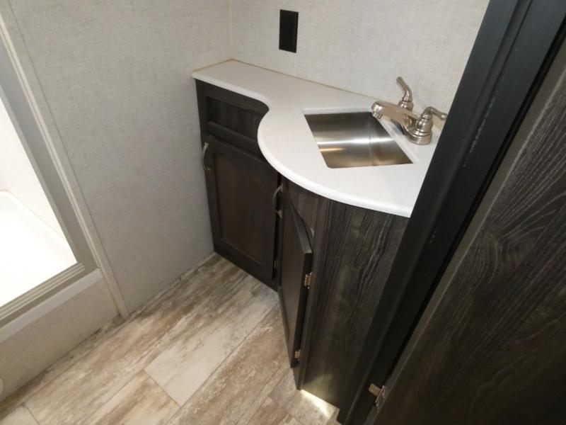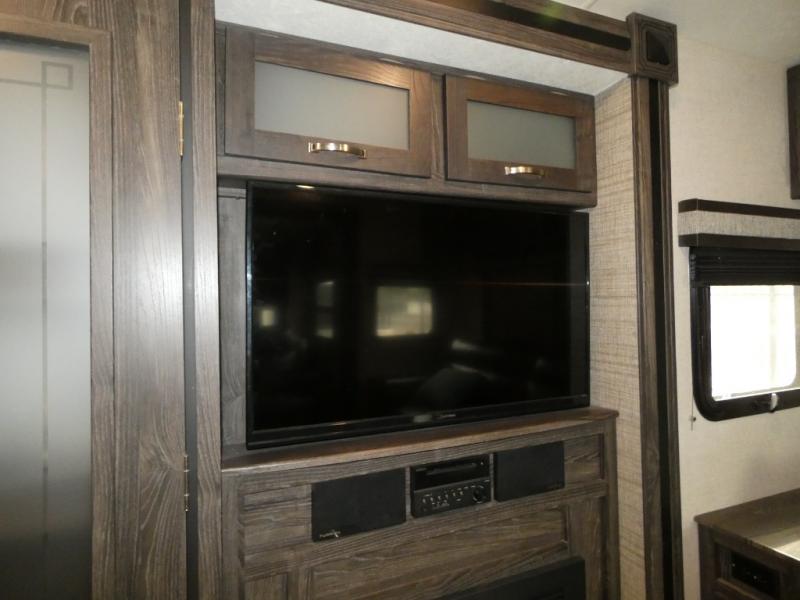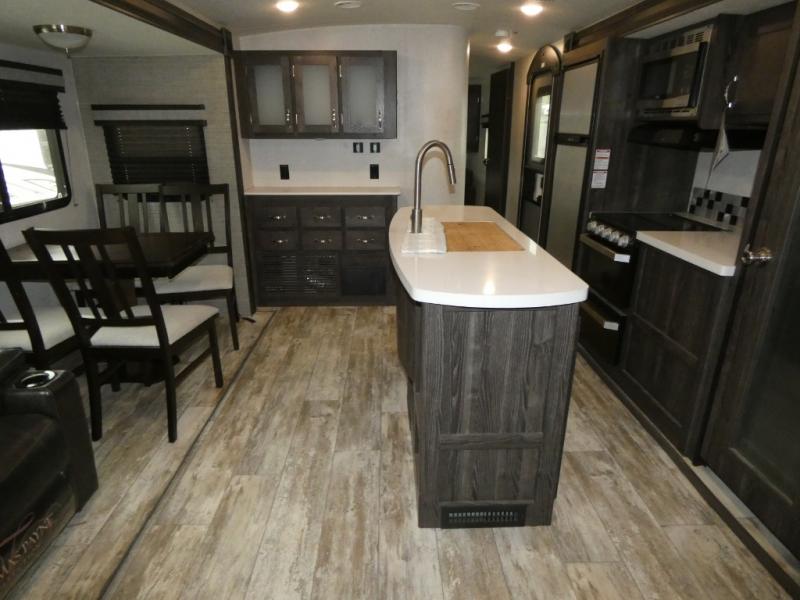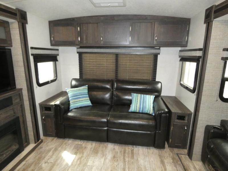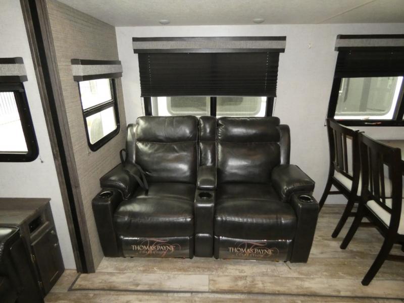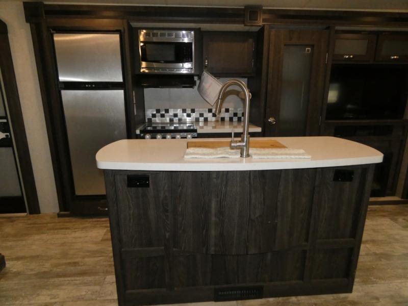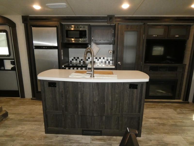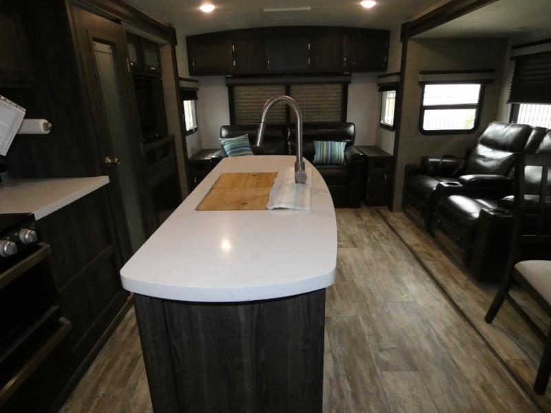 This travel trailer provides lots of interior floor space thanks to the dual slide outs in the main living and kitchen area. Just imagine relaxing, or entertaining guests with all the seating choices including the theater seats with heat and massage for watching the big game on the 39" LED TV. The kitchen island allows the cook extra counter space to serve appetizers, and they can wash everything afterwards in the large stainless steel sink. If you need to take the party outside so your spouse can sleep, the outdoor kitchen will come in handy, plus there is a power awning with LED lights and integrated speakers. Take a look!