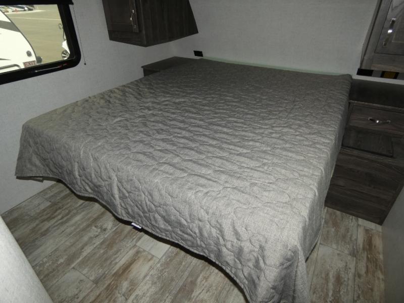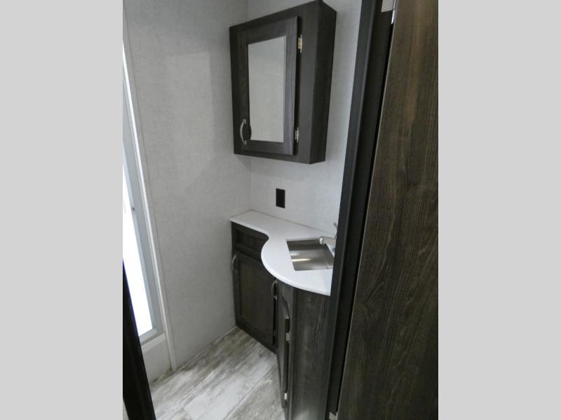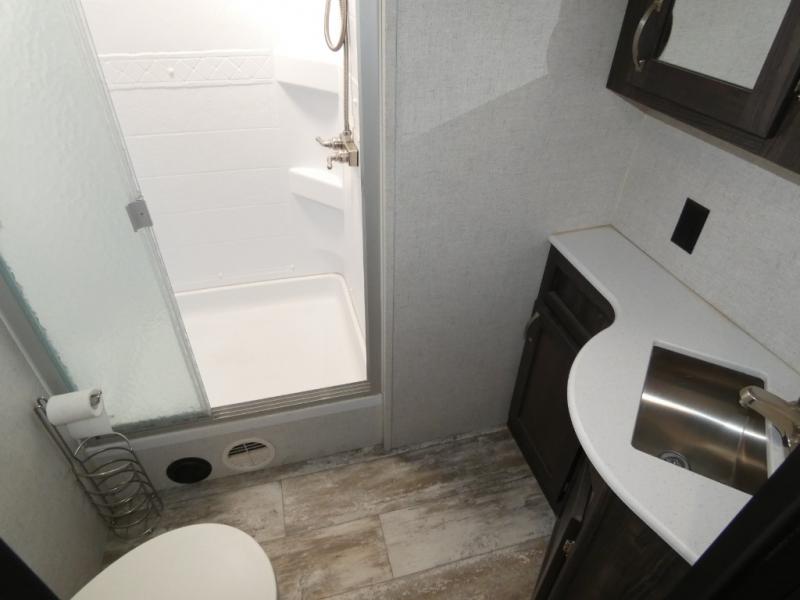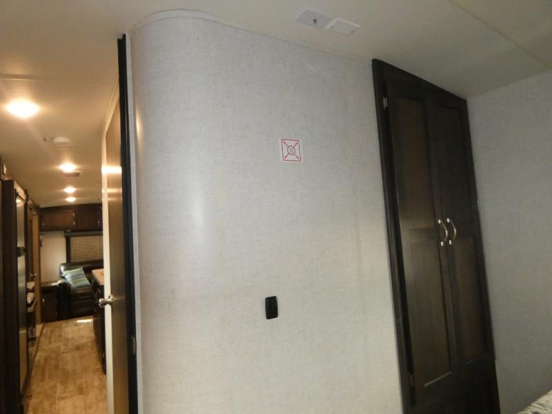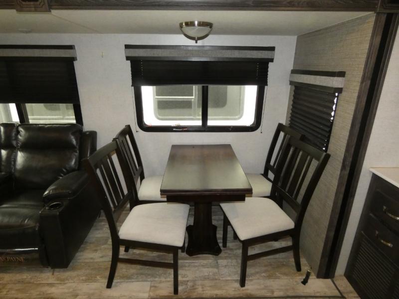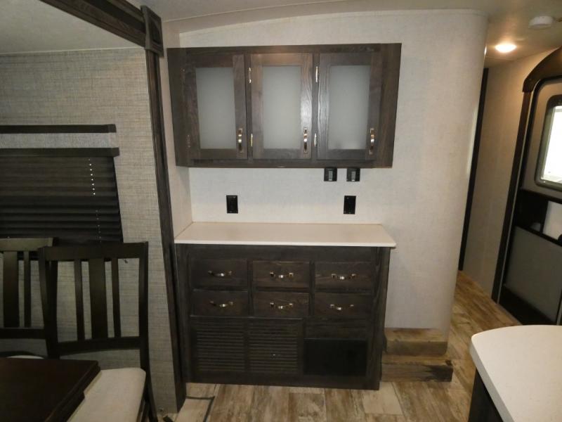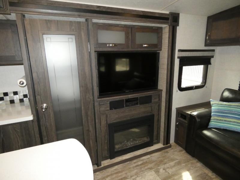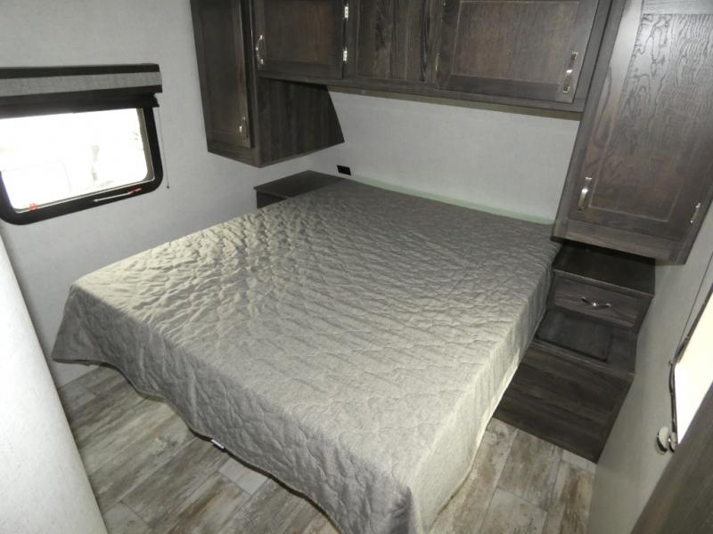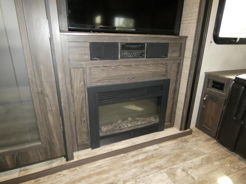 This travel trailer provides lots of interior floor space thanks to the dual slide outs in the main living and kitchen area. Just imagine relaxing, or entertaining guests with all the seating choices including the theater seats with heat and massage for watching the big game on the 39" LED TV. The kitchen island allows the cook extra counter space to serve appetizers, and they can wash everything afterwards in the large stainless steel sink. If you need to take the party outside so your spouse can sleep, the outdoor kitchen will come in handy, plus there is a power awning with LED lights and integrated speakers. Take a look!