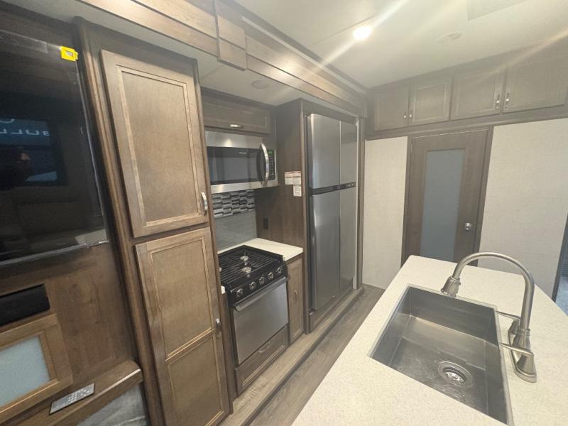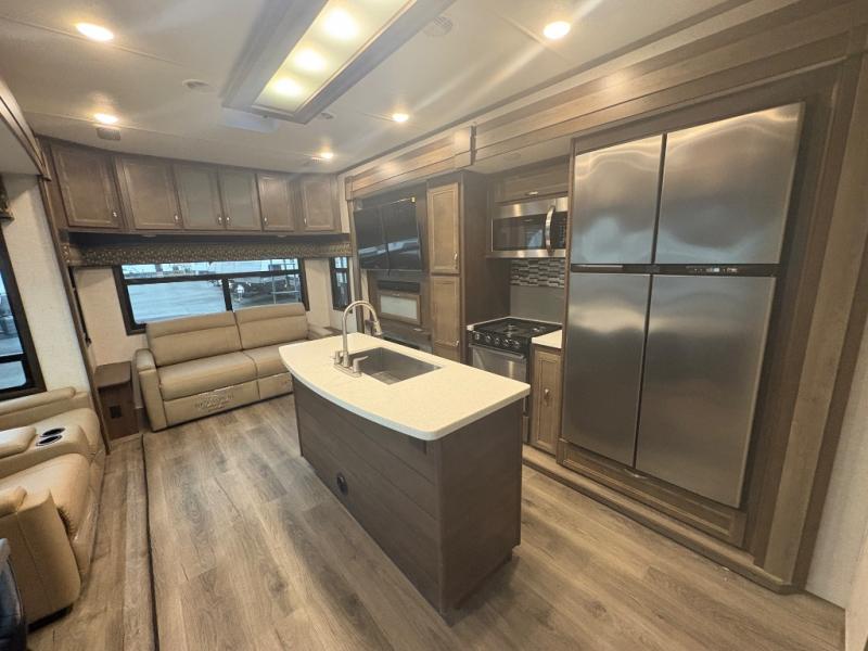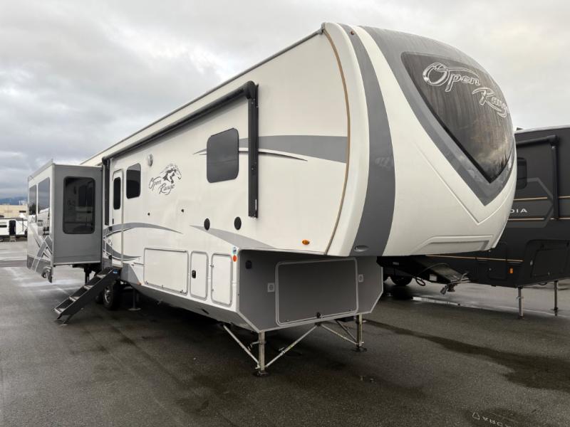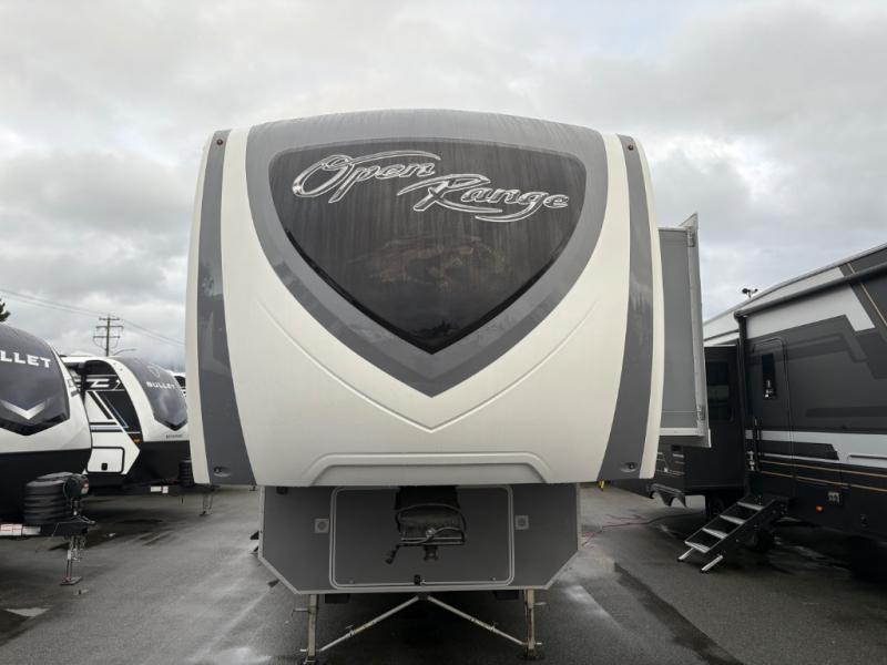 The Highland Ridge RV Open Range is designed for extended use during any season. Each fifth wheel offers inside comforts such as stainless steel appliances, ball bearing full extension drawer guides, a motion sensor light in the bedroom and hallway, as well as a USB/12V charging port that charges your portable electronics even when you are not hooked up to a power source. You will experience a quick and easy way to set up your fifth wheel with the 6-Point automatic leveling system or 4-point leveling system depending on the model you choose, and the JT Strong Arm stabilizers helping to eliminate movement while inside the unit. Choose your favorite Open Range today!
