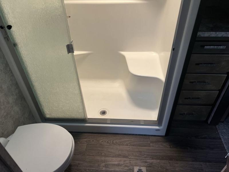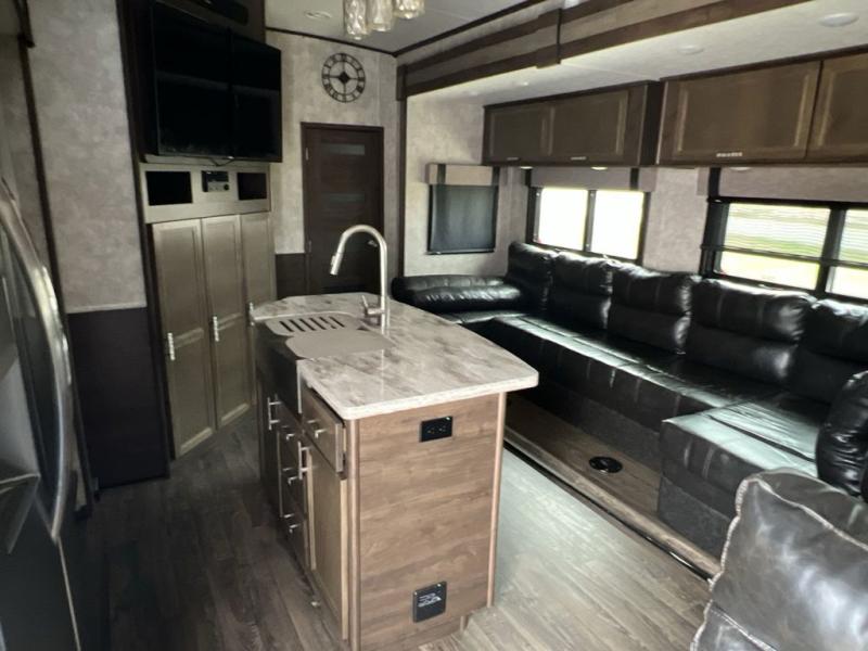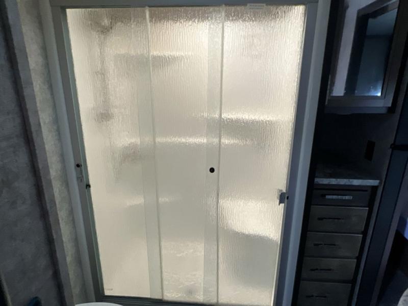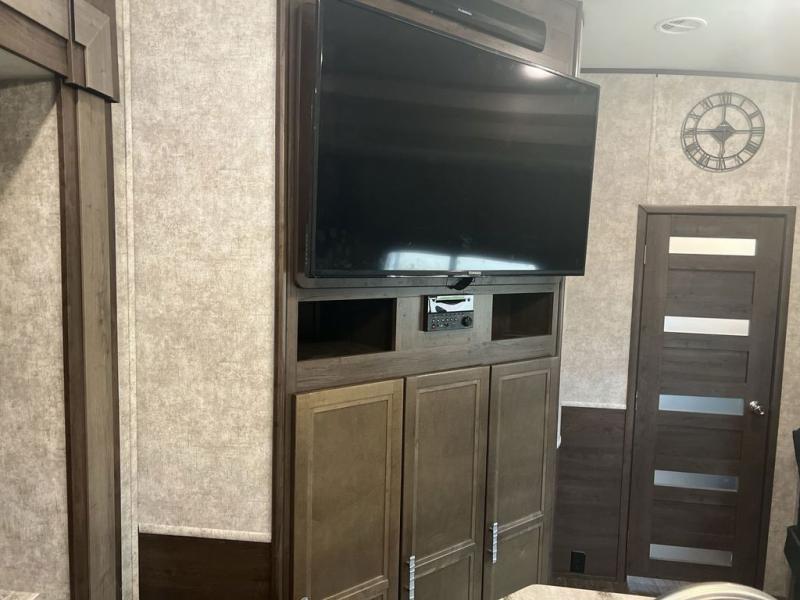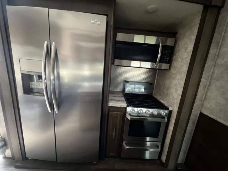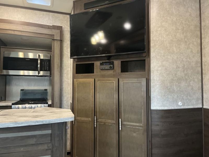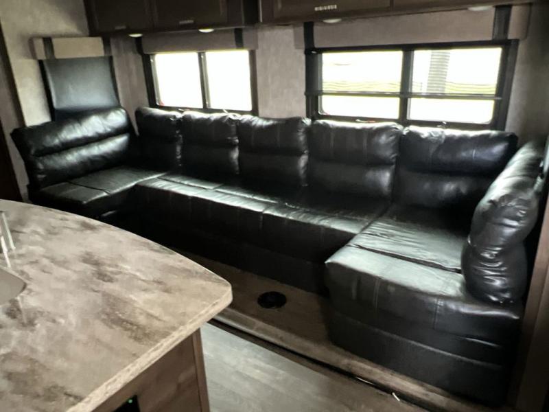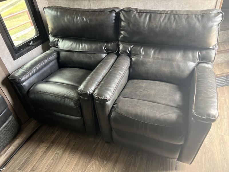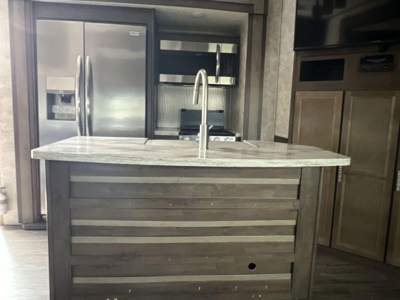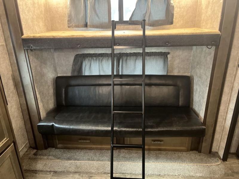Envision all of the floor space you will enjoy thanks to the separate bunkhouse with a half bath and dual slides, and your own master suite with dual access to the full bathroom and a slide out queen bed, plus a kitchen and living area with two slide outs. Now imagine you are camping at your favorite state park with your family. You can make a meal on the outside kitchen while watching the kids run around the campsite, or cook inside will all the appliances provided including a kitchen island for convenience. You might even decide to take a break while sitting on one of the two chairs or reclining in the theater seats with heat and massage features. From five total slides, two exterior entry doors, and loads of storage, you will lack nothing in this fifth wheel!