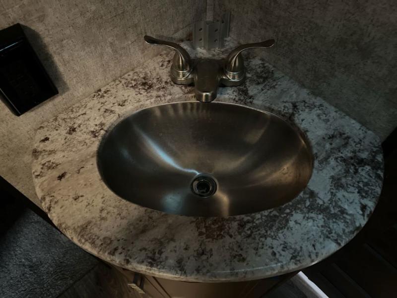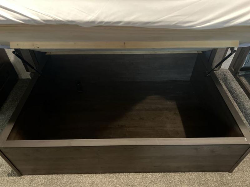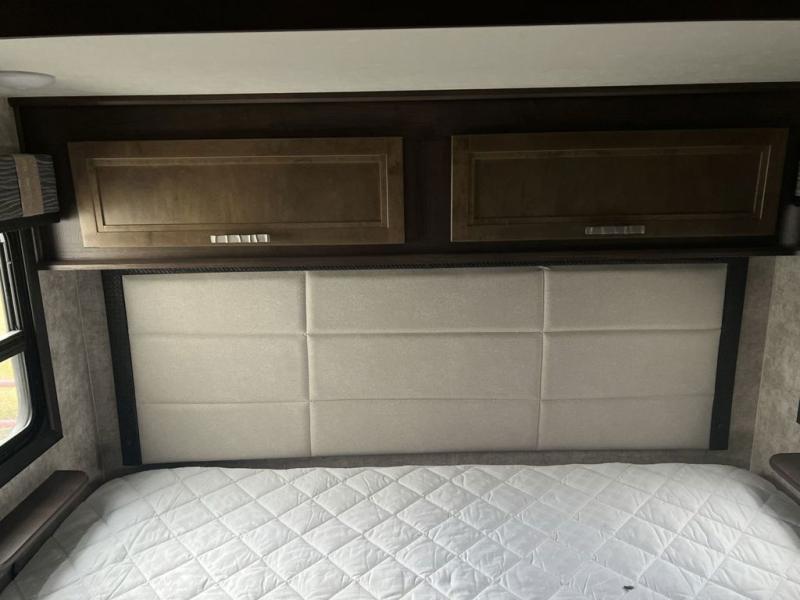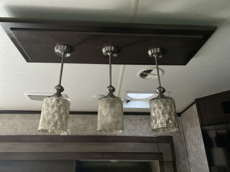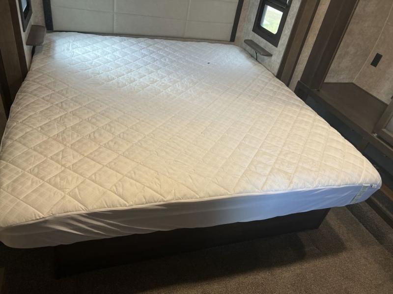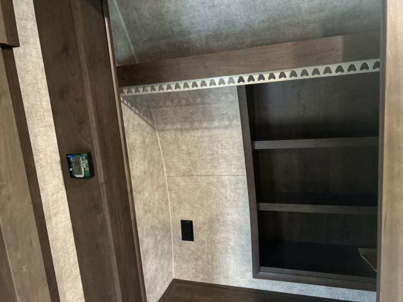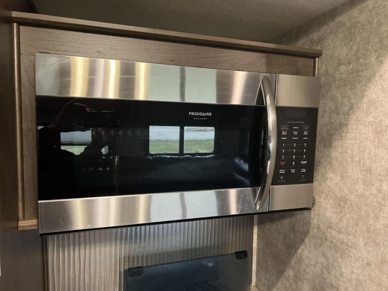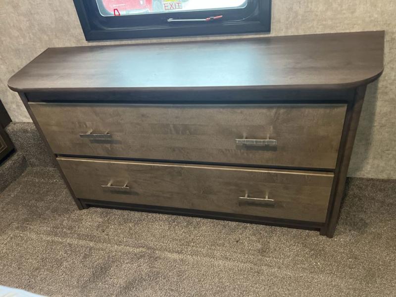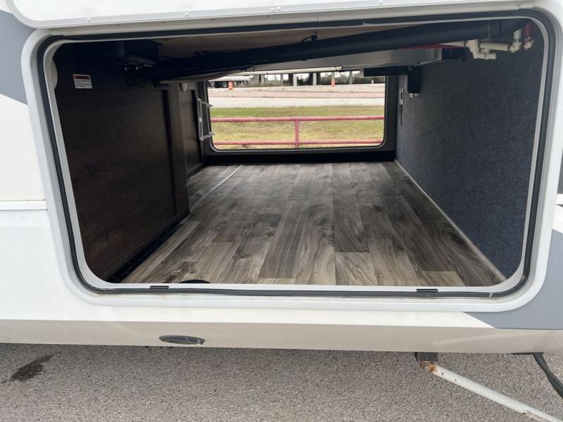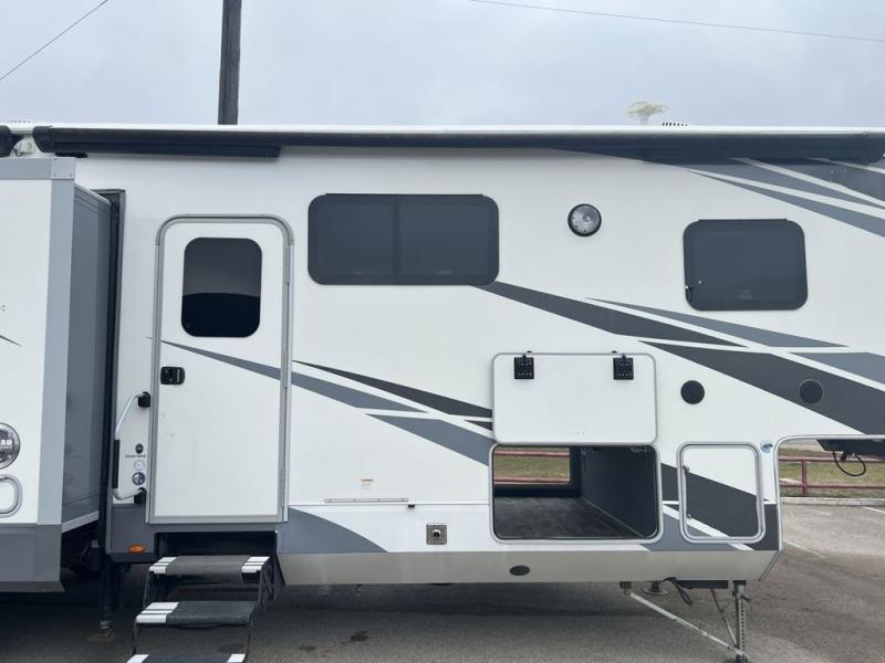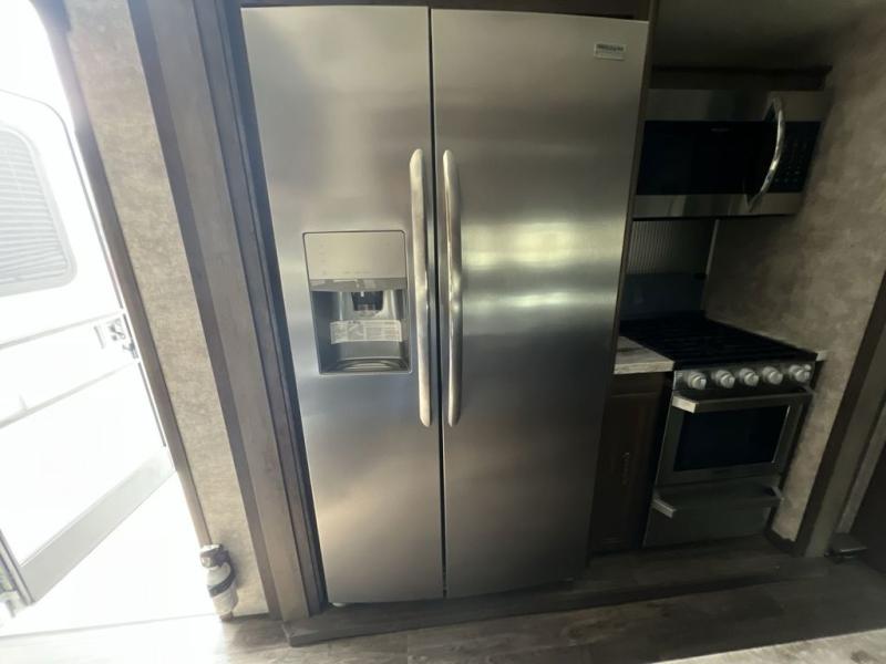 Envision all of the floor space you will enjoy thanks to the separate bunkhouse with a half bath and dual slides, and your own master suite with dual access to the full bathroom and a slide out queen bed, plus a kitchen and living area with two slide outs. Now imagine you are camping at your favorite state park with your family. You can make a meal on the outside kitchen while watching the kids run around the campsite, or cook inside will all the appliances provided including a kitchen island for convenience. You might even decide to take a break while sitting on one of the two chairs or reclining in the theater seats with heat and massage features. From five total slides, two exterior entry doors, and loads of storage, you will lack nothing in this fifth wheel!