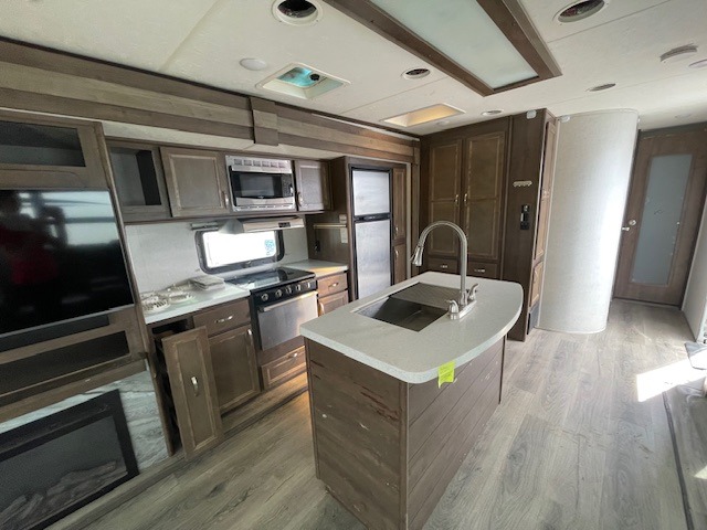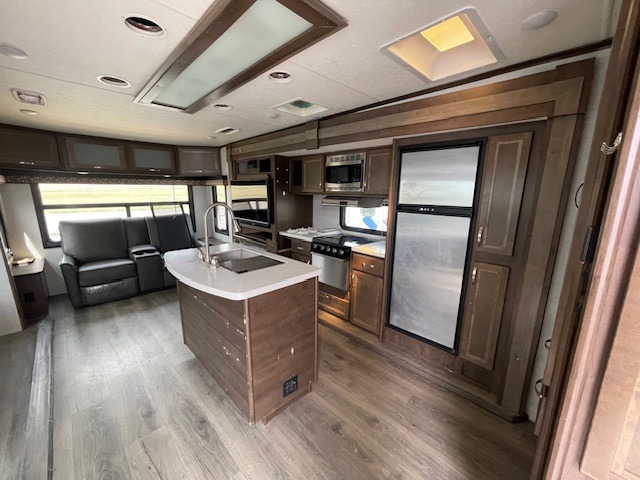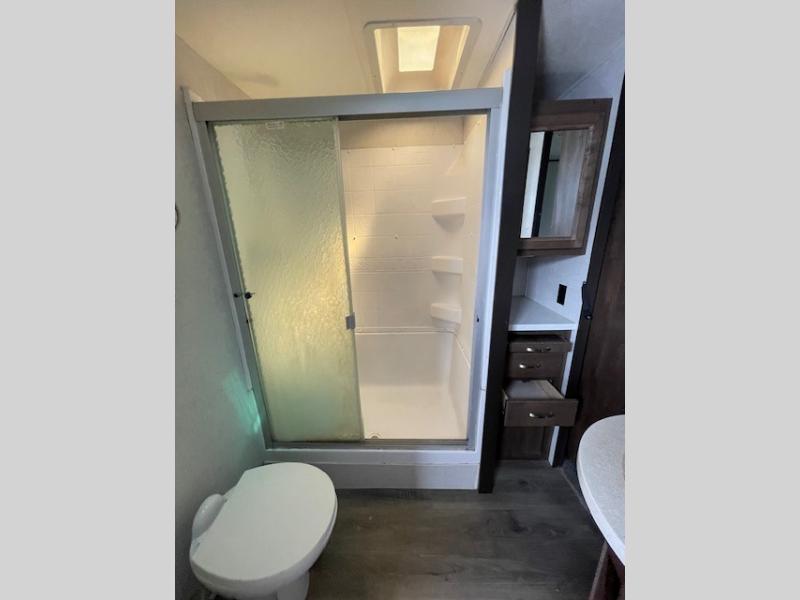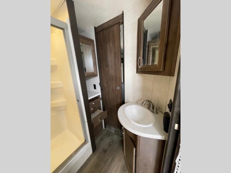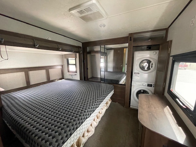 Just imagine your own bedroom and kitchen amenities where ever you decide to travel when you are in this travel trailer. The chef will enjoy the kitchen including an island to wash dishes and prepare food, the stainless steel appliances to make meals, as well as having a place to eat and relax. The sofa even doubles as extra sleeping space when you have overnight guests. Now imagine getting a good night's rest in the master bedroom which also includes a mirrored wardrobe and quick access to the double entry bathroom, and doing it all over again tomorrow at a new campground. Step inside, you will love it!