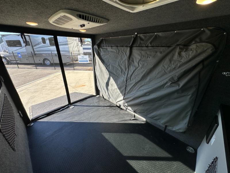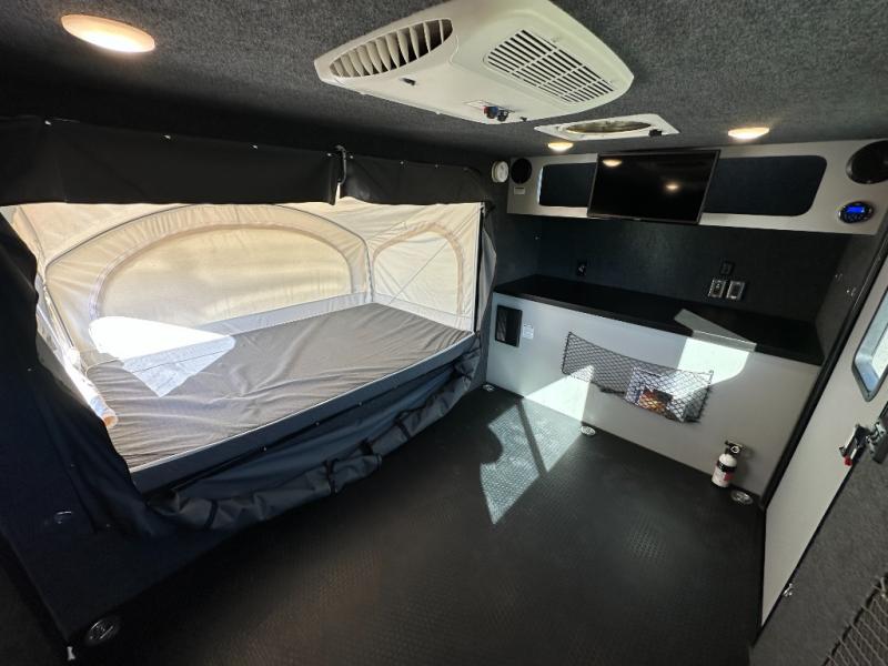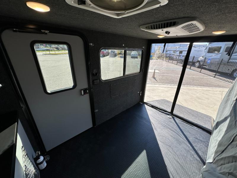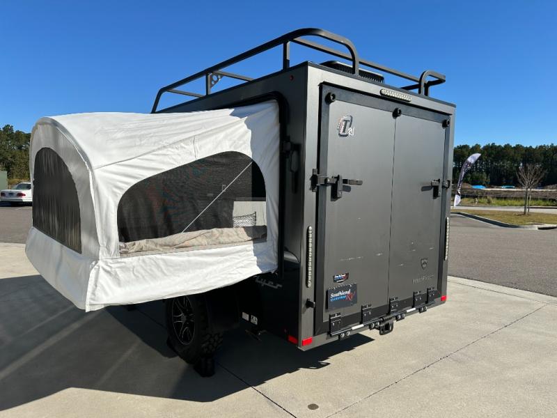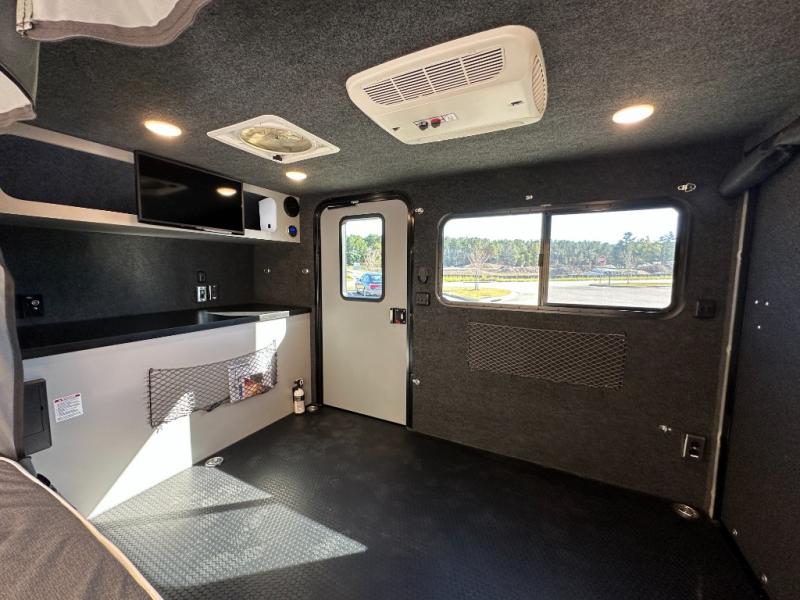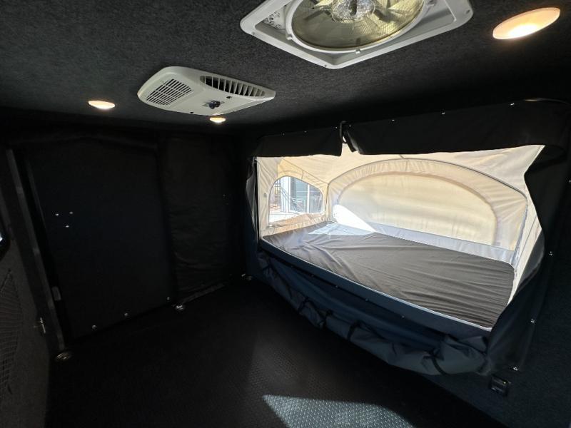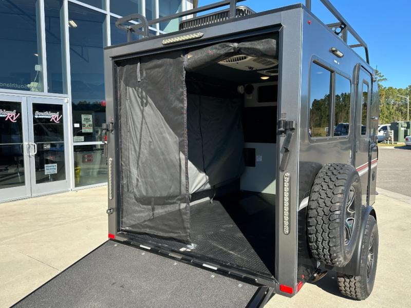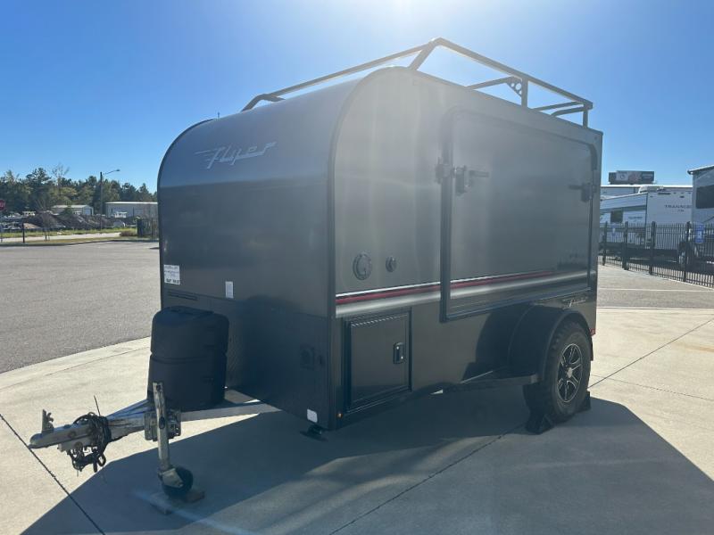 Not only is this Flyer toy hauler built to go where most traditional RVs cannot, but it is also built with a standard rear ramp or optional double rear doors, and six tie-down rings so that it can also serve as the perfect cargo transport too! The interior is spacious with its 46" x 81" tip-out bed, and if you add the second optional tip-out bed, you'll have an amazing amount of space on the inside. This expandable toy hauler is very functional, but you can make it even more enticing by adding the optional kitchen slide to the exterior. This will allow you to cook wherever you choose to camp. The interior also has black coin flooring and a MaxxAir vent fan. The dry weight for this unit ranges from 1,450-2,020 LBS, and the tongue weight ranges from 240-410 LBS. The net carrying capacity also ranges from 970-1,540 LBS.