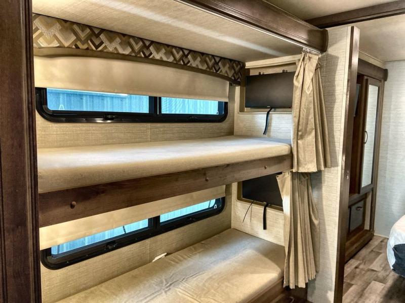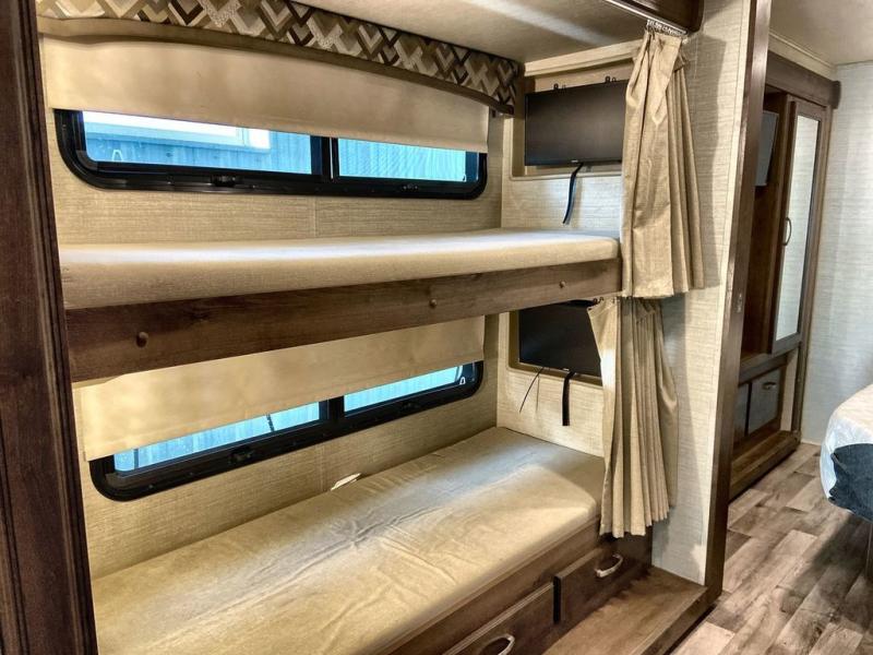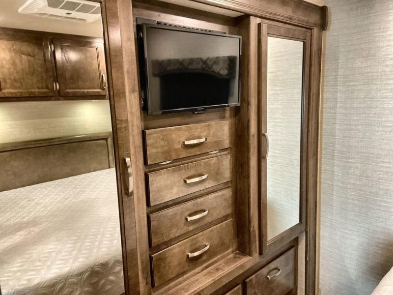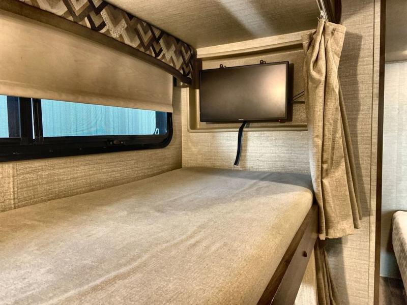 Imagine driving down the road in comfort and staying where ever you like in luxury. Now imagine yourself in this Alante motorhome with your family. From the two slides allowing plenty of floor space for everyone to move around, to the bunk beds with TVs for the kids, you will enjoy every time you take this RV out of storage. You will find seating as well as extra sleeping space on the living room furniture. And the walk-around queen size bed in the private bedroom gives you a place to call your own. The outside entertainment center with an LED TV mounted on a swivel bracket, the DVD/AM/FM radio and speakers, plus the awning offer an outdoor gathering space protected from the elements. If you need more sleeping space, add the drop down overhead bunk option. This could be the one!