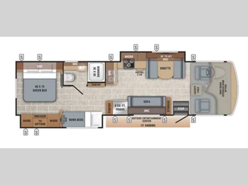 | TV Info | LR 39" Lift LED, Bunk (2) TVs, Ext. TV, BR TV Option |
