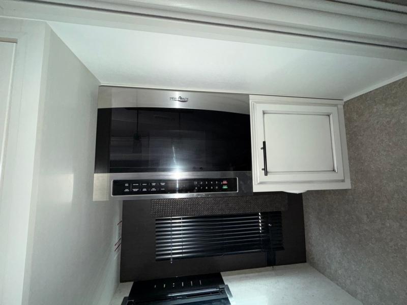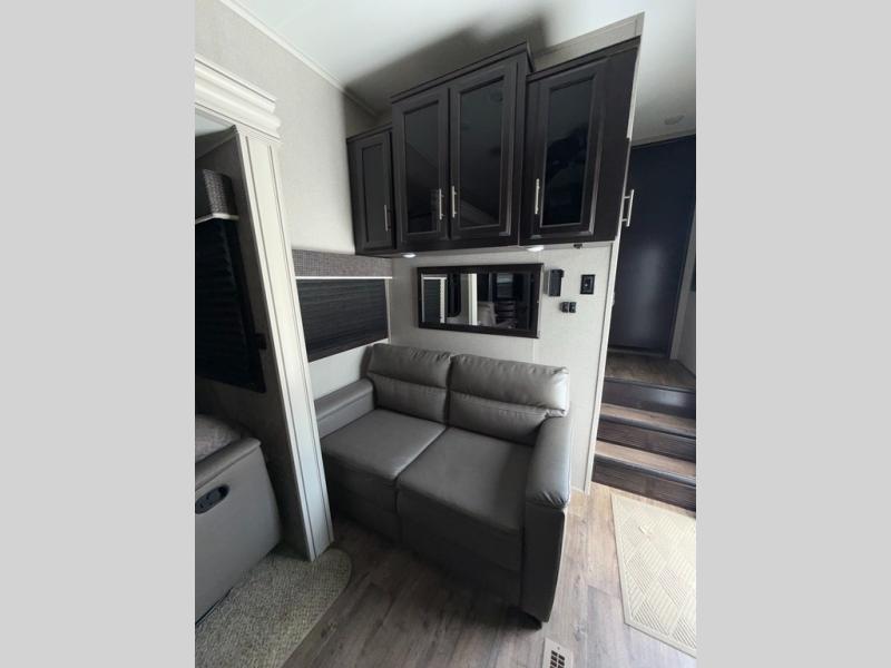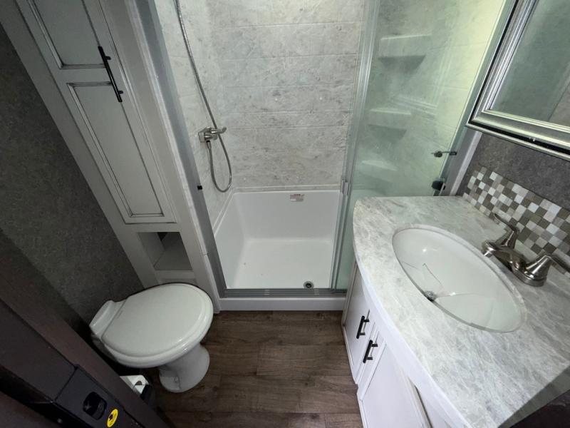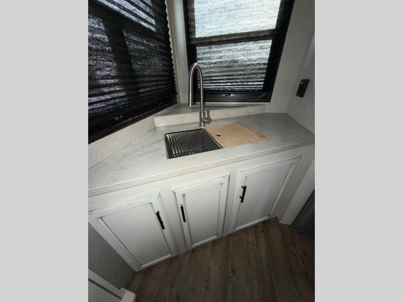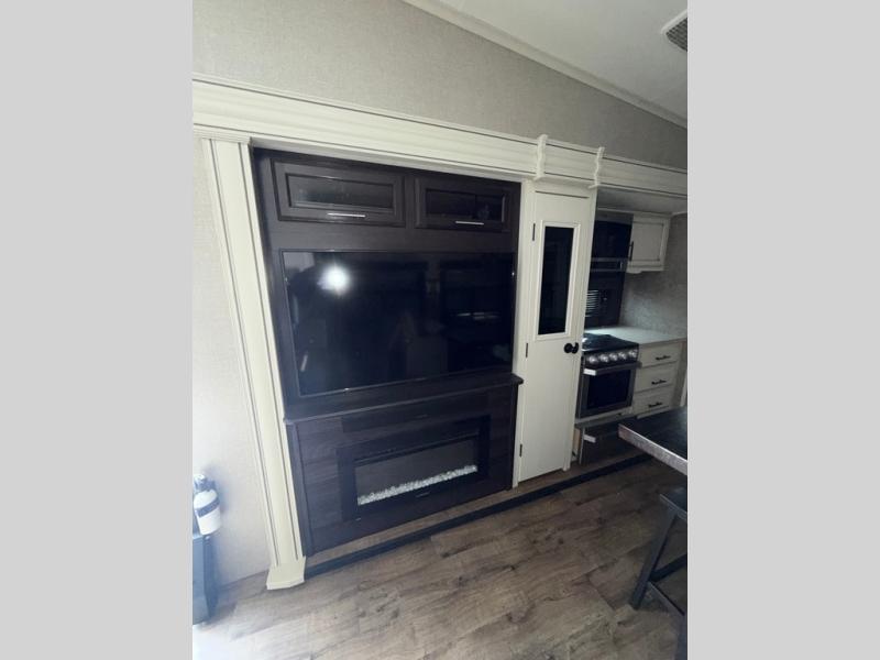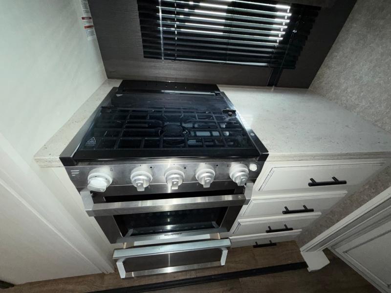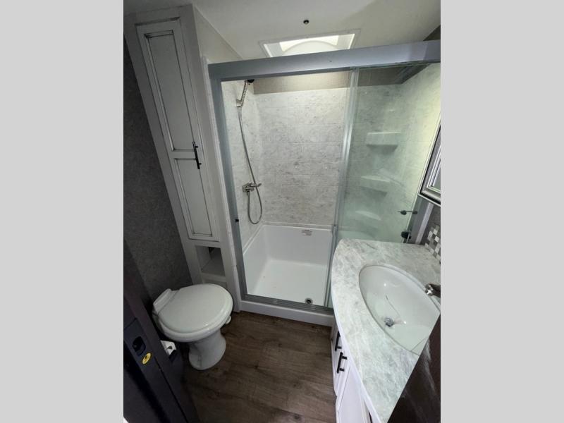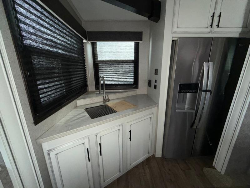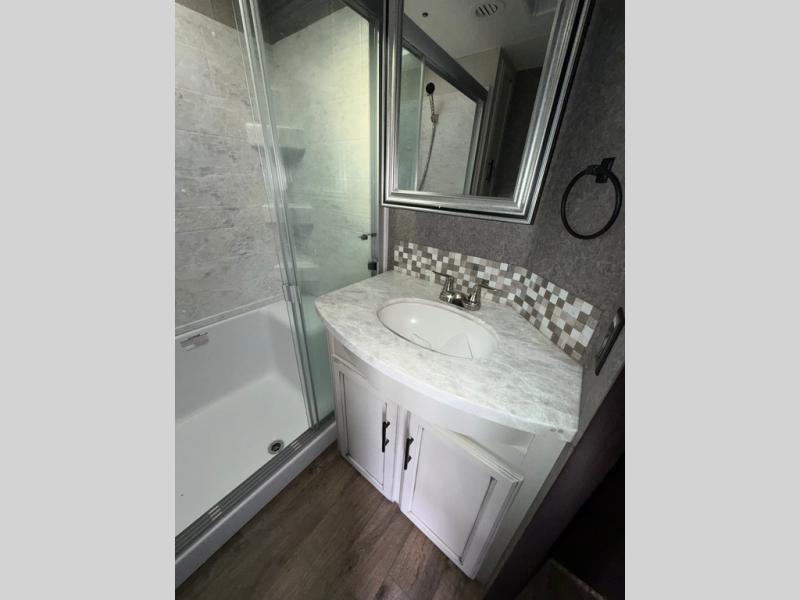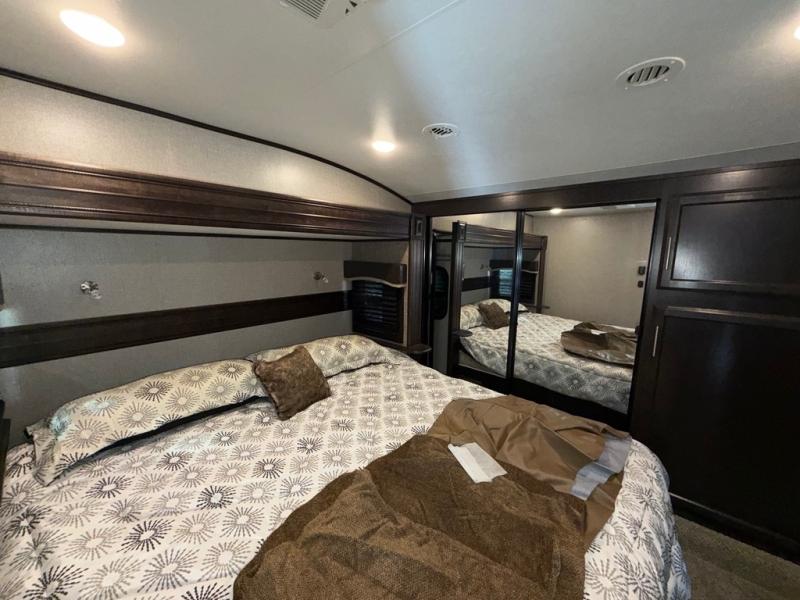 You won't believe the amount of luxurious features that have been included in this Eagle fifth wheel! You will feel completely pampered each time you step foot into the full bathroom. The LED-backlit medicine cabinet with custom-framed mirror has been included as an industry exclusive, and the stone and glass tile backsplash will look even more radiant underneath the brilliant light shining in from the skylight. You will also appreciate the many modern conveniences that have been included to enhance every getaway, like the LED HDTV with an integrated sound bar.