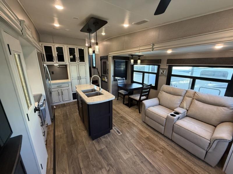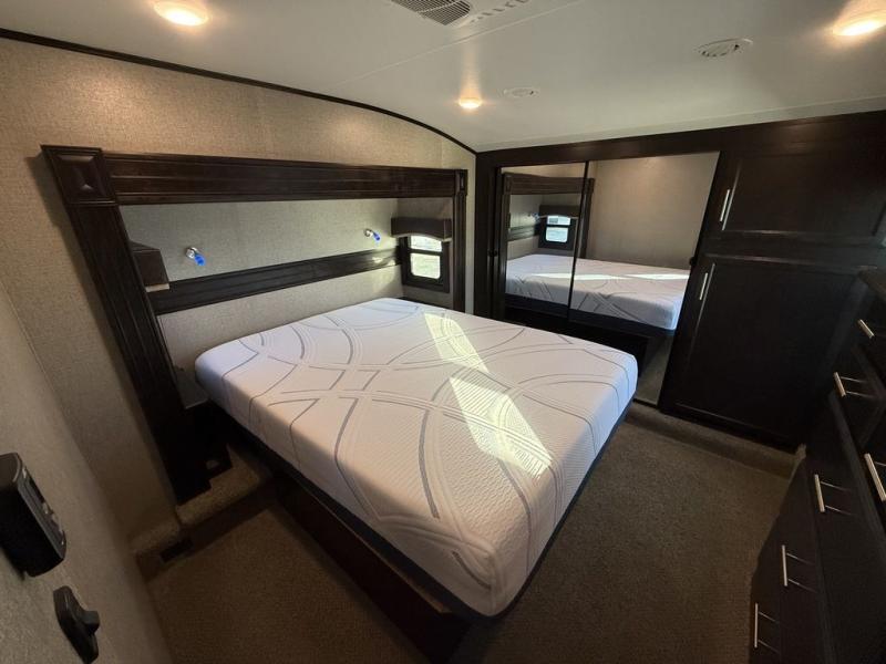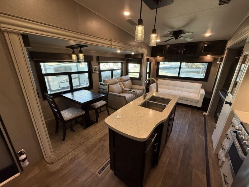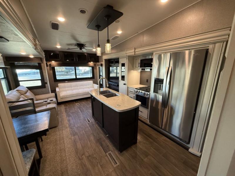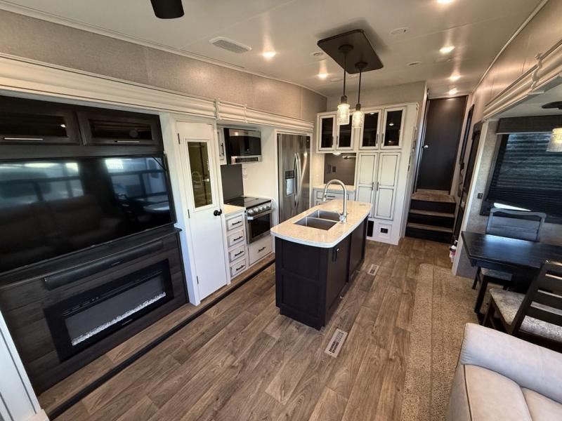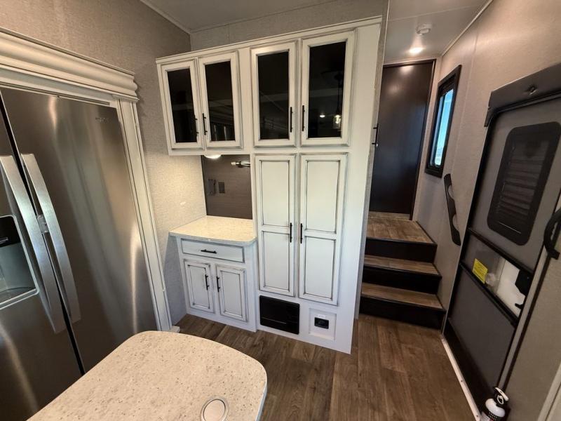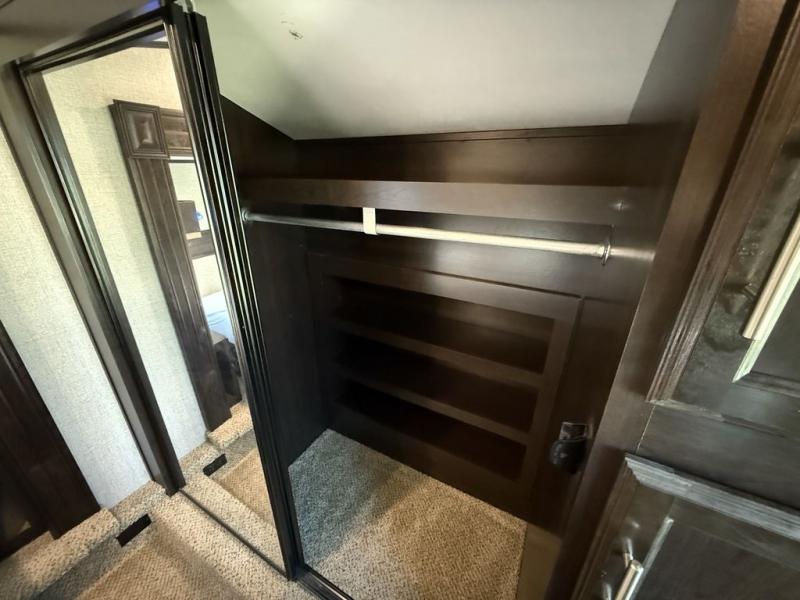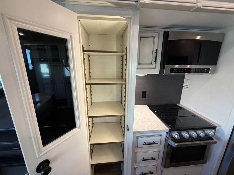 If you only like to travel in luxury, take a step inside this Eagle fifth wheel to find what you have been looking for. From its completely elegant kitchen with a residential walk-in pantry, a large island with a stainless steel under-mounted sink, a roll-up metal strainer, and a bamboo cutting board, to its peacefully accommodating private bedroom with a slide out queen bed, and a large closet, this unit is packed out with all of the features you could possibly need. There has even been a space prepped to add a washer and dryer if you choose!