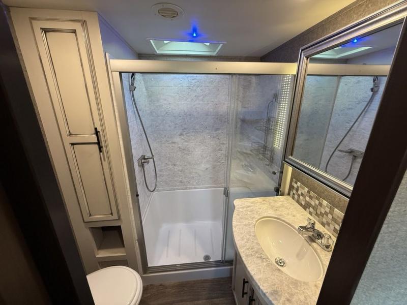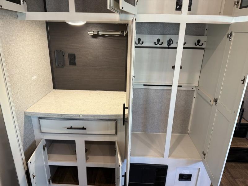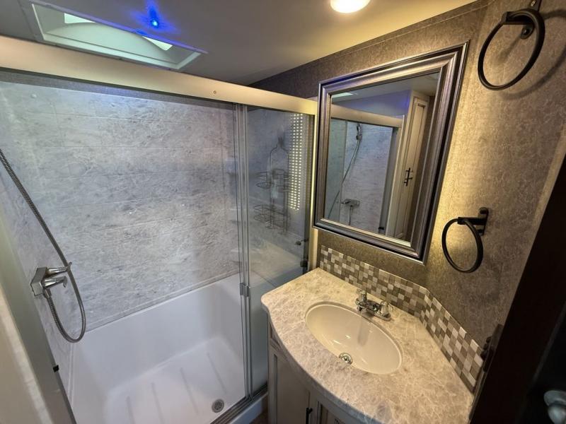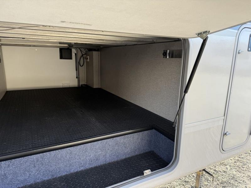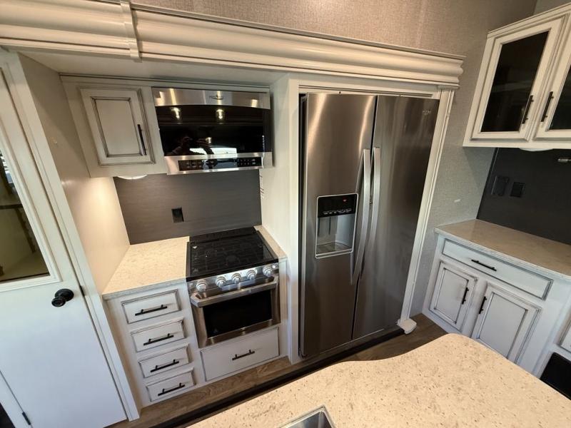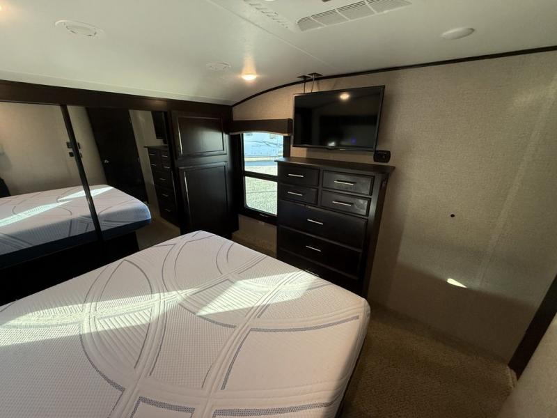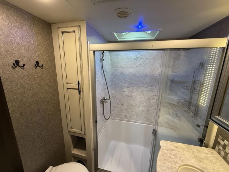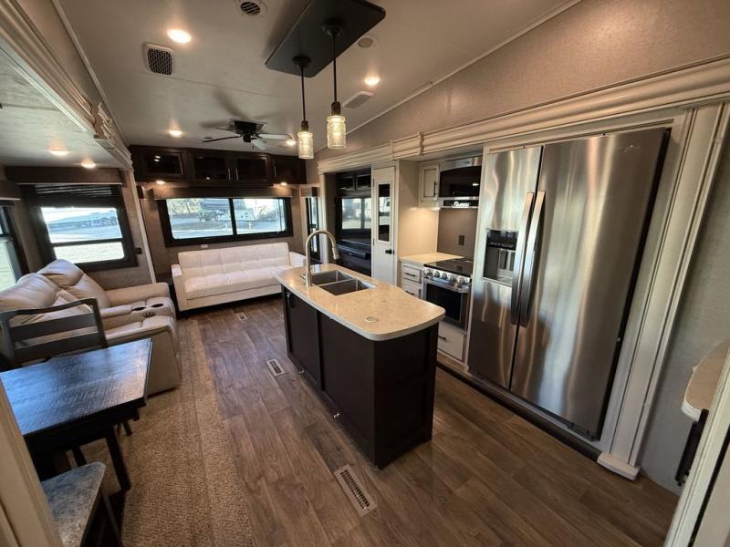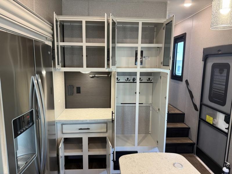 If you only like to travel in luxury, take a step inside this Eagle fifth wheel to find what you have been looking for. From its completely elegant kitchen with a residential walk-in pantry, a large island with a stainless steel under-mounted sink, a roll-up metal strainer, and a bamboo cutting board, to its peacefully accommodating private bedroom with a slide out queen bed, and a large closet, this unit is packed out with all of the features you could possibly need. There has even been a space prepped to add a washer and dryer if you choose!