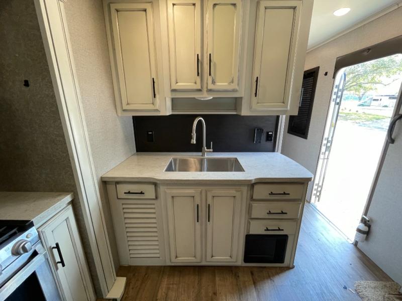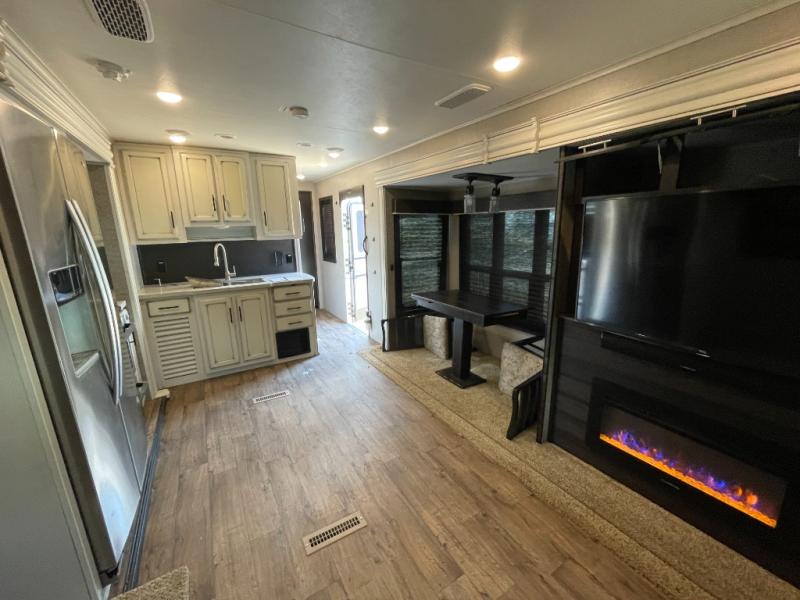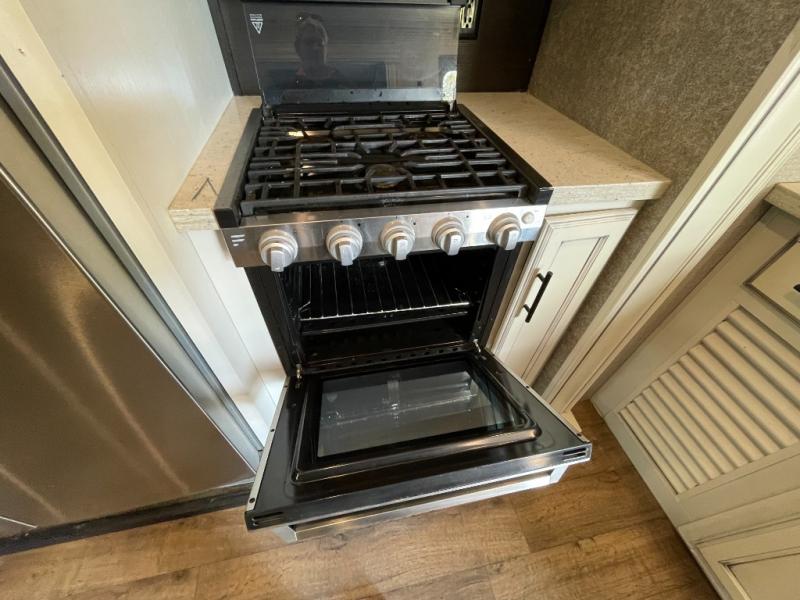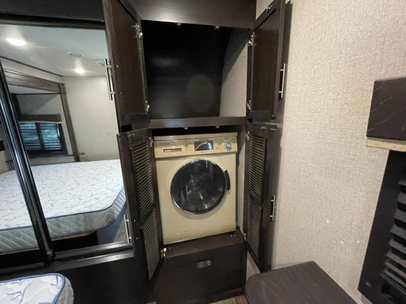 Life just got much more comfortable and luxurious with this Eagle travel trailer. This model offers you a private master bedroom with plenty of storage and a closet prepped for a washer and dryer if you choose to add one. The dual opposing slides in the main living and kitchen area provide enough room to walk around as you prepare dinner on the three burner range or grab a snack from the pantry, and the huge windows that are located next the the free-standing table with chairs will let you bring in the beautiful outdoor scenery while you dine together.