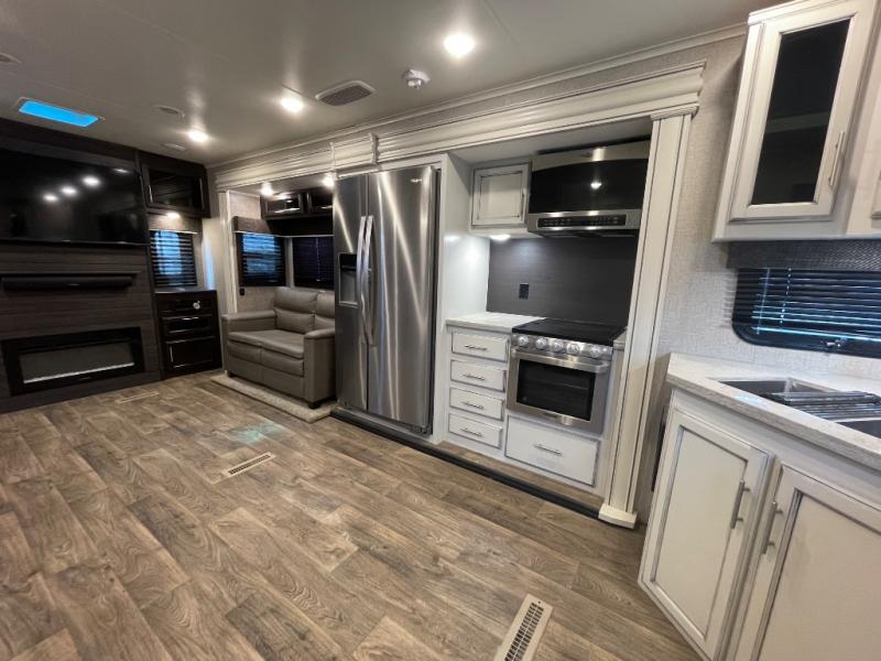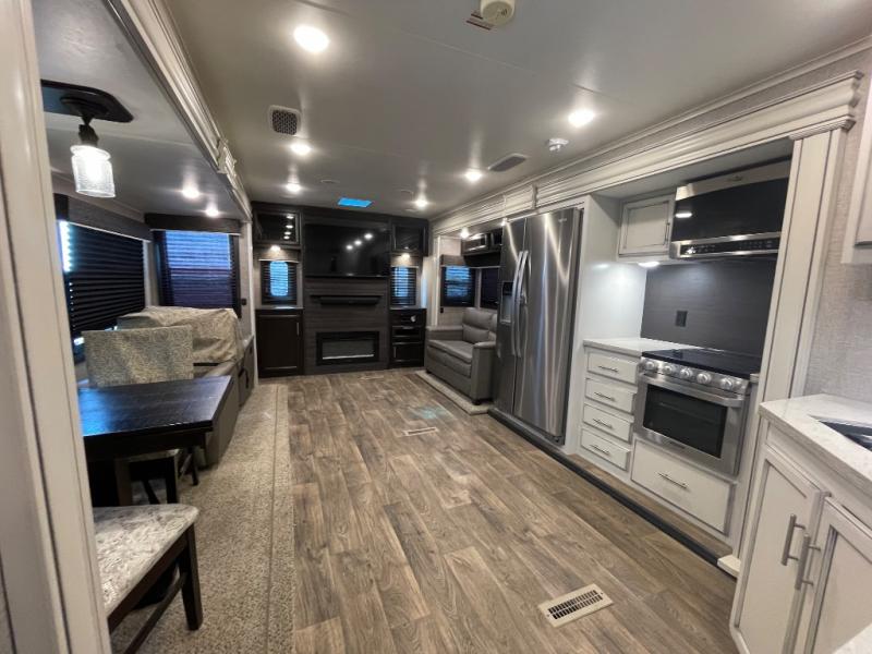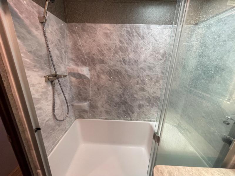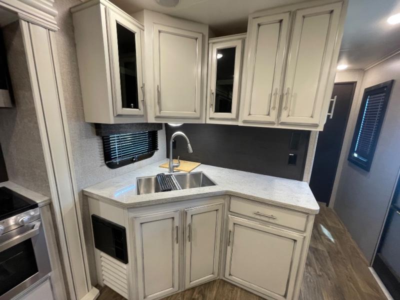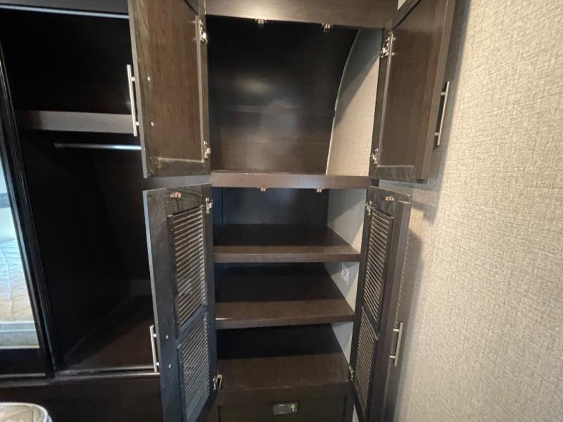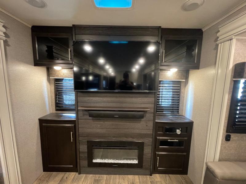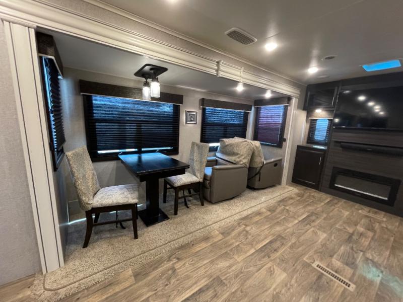 Entertaining friends in this Eagle travel trailer will never be a problem because this unit provides a rear entertainment center with an LED fireplace. Just imagine you and your family relaxing on the tri-fold sofa or dual recliners while you snack on some popcorn and watch a movie on the LED HDTV. With the huge windows in front of the free-standing table, you can take in the beautiful outdoor scenery while you play a card game or eat dinner, and when it's bedtime, you can retire to the slide out queen bed in the private bedroom.