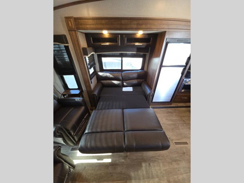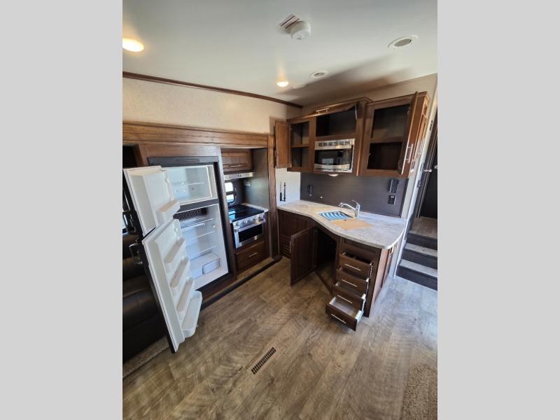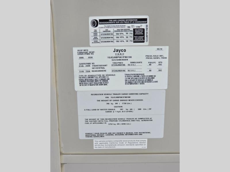 For any camping trip you will want an Eagle HT fifth wheel by Jayco. Along the exterior there is a high-gloss, fiberglass front cap with built-in specialty LED lighting. Inside each model there are handcrafted Sugar Maple glazed drawers. Throughout each model there is Shaw residential carpet with a sound dampening carpet pad plus IVC Trekk wood-plank vinyl flooring. The industry exclusive HELIX cooling system is an added bonus with the Jayco-exclusive insulated duct design, directional and closeable A/C vents, larger return air vents, and the exterior-mounted 15,000-BTU Whisper Quiet A/C unit. The Customer Value Package includes a residential queen Simmons mattress with under-bed storage, an electric patio awning with integrated LED lights, MOR/ryde CRE/3000 rubberized suspension for a smoother ride, a rain proof EZ Breeze bathroom power vent, an industry first Go Power rooftop and ground solar prep, and so much more!