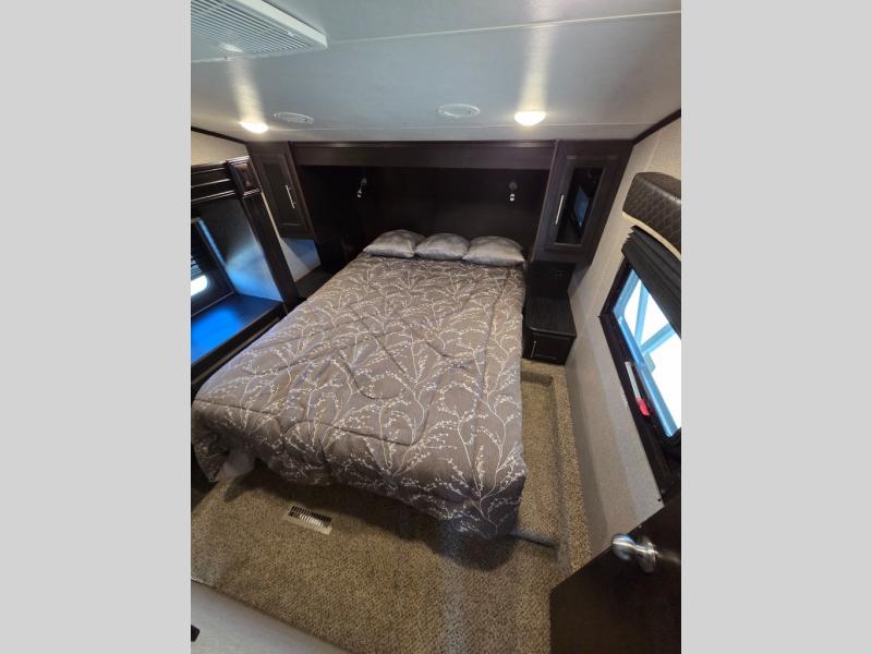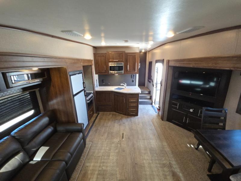 Do you want a camping trip with luxurious features from home? Well then, this Jayco Eagle HT 27SGX fifth wheel has you covered! In the entertainment center, you can choose to sit back in either one of the recliner chairs or lounge on the tri-fold sofa. A double entry bath makes those late night trips a little easier to access. Throughout the fifth wheel there is LED lighting to brighten your trip. When you're ready to hit the sack, you will enjoy jumping into the comfortable queen bed with night stands on either sides or you could keep the night going underneath the 14' electric awning with LED lights.