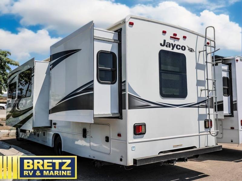 Load up your family and head out on your next road trip with this Greyhawk Prestige Class C gas motorhome by Jayco. Along the exterior you will find plenty of storage compartments for all of your large camping gear, plus there is a 16' electric awning where you can plan to visit with family and friends. If you want to watch a movie, then the 32" TV at the outdoor entertainment center is ideal. Inside this model are two slides which help to open up the floor space. Seating can be found on the booth dinette and the tri-fold sofa, and at night both the dinette and sofa easily convert into additional sleeping space. In the rear bedroom you will find a walk-around RV queen bed, a large wardrobe, and a 24" LED TV.