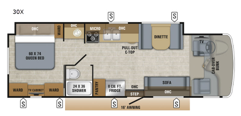 Start your next road trip with this Greyhawk class C gas motorhome. Let this model take you camping near the water or at the base of a mountain! Inside you will find plenty of room to move around with the full wall slide out plus there is ample storage with all of the overhead cabinets. In the rear bedroom there is a walk-around queen bed where you are sure to get a good night's rest. In the kitchen you will find a pull-out counter which provides more space for meal prep. If you are impressed with all of the storage inside, then you should check out the exterior. There are six storage compartments for all of your extra camping gear plus a 16' electric awning provides plenty of shade and maximizes your outdoor living space!