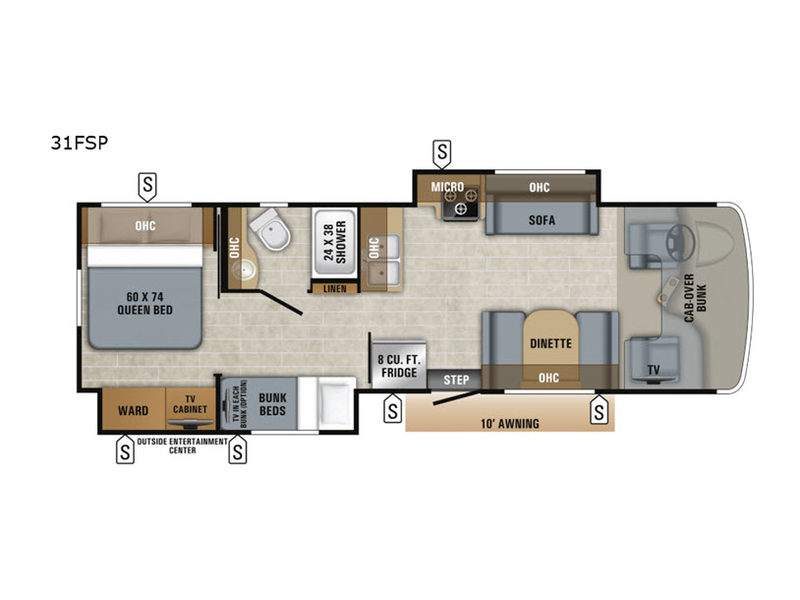 For any road trip whether traveling near or far you will want this double slide out 31FSP Greyhawk Prestige class C motor home. Your kids will enjoy their own space with the bunk beds, plus there is an additional sleeping spot with the bunk above the cab. Mom and dad will enjoy the private rear room which features a queen bed, wardrobe, and a 24" LED TV. With the ample exterior storage you truly can bring along all of your necessary camping items. Also outside you will enjoy the shade from the 10' awning and more!