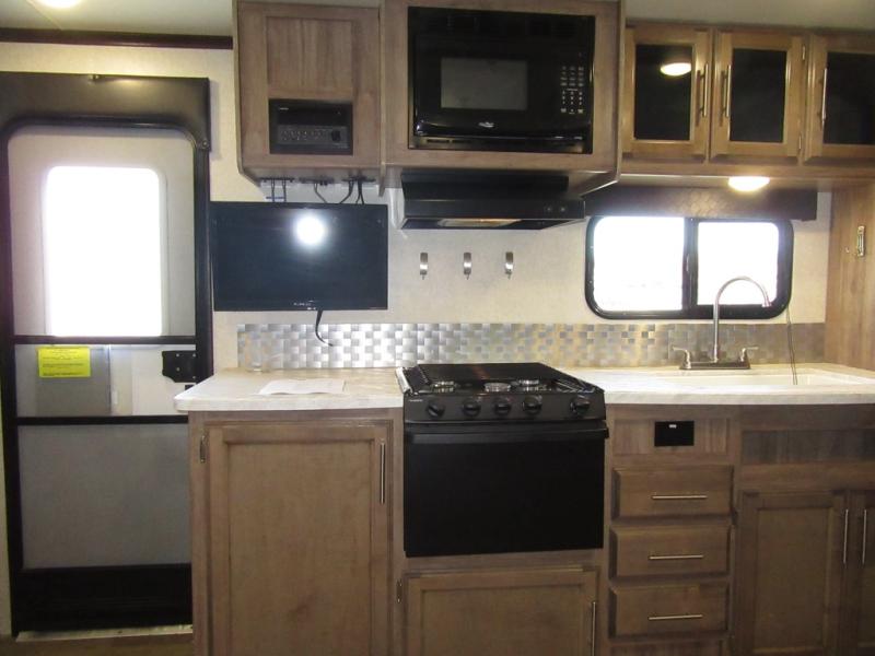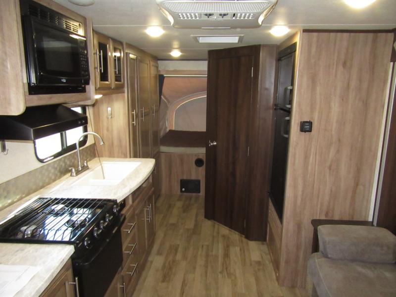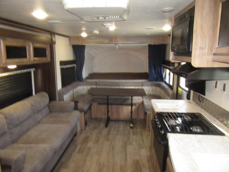 Come see how your family will fit perfectly in this Jay Feather expandable X23B. With the front and rear tent end beds open and the slide pushed out, you will be amazed at how much room everyone can enjoy. After cooking your meals on the three burner cooktop, you can dine around the large U-shaped dinette and sofa or outside under the awning. This model also features a rear corner bath for a bit more privacy. Take a step inside, you will be glad you did.