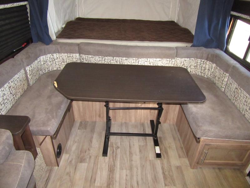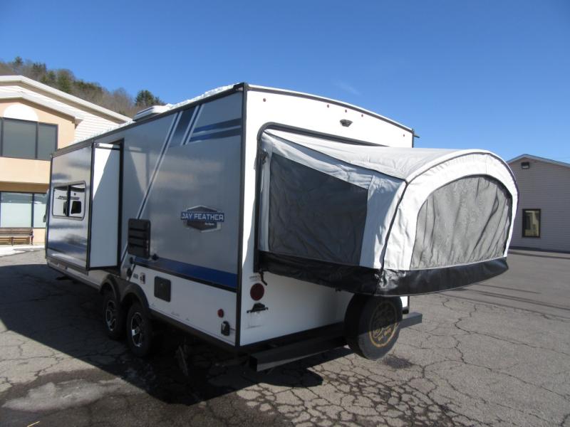 When you choose a Jay Feather expandable you can rest assured that you have chosen quality construction with features such as an aerodynamic, rounded front profile with front diamond plate plus there are vacuum-bonded, laminated bed platforms with reverse-cambered support of 1,000-lb. capacity, plus water-repellent, scratch-resistant Jayco DuraTek vinyl tent material with zipper windows. Inside you will find full kitchen amenities, LED lighting throughout, and ball-bearing drawer glides with 75-lb. capacity. The mandatory Customer Value Package includes features such as American-made nitro-filled Goodyear radial tires with self-adjusting brakes, a power awning with LED lights, an outside shower, plus AM/FM/CD/DVD/Bluetooth stereo and more! For your next camping trip, come choose a Jay Feather expandable!