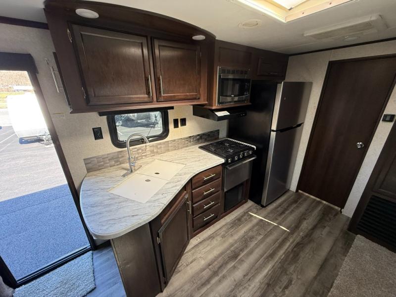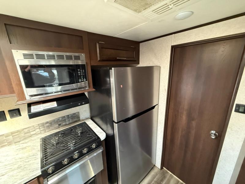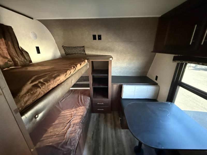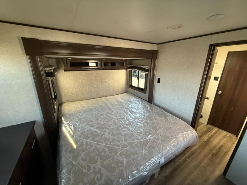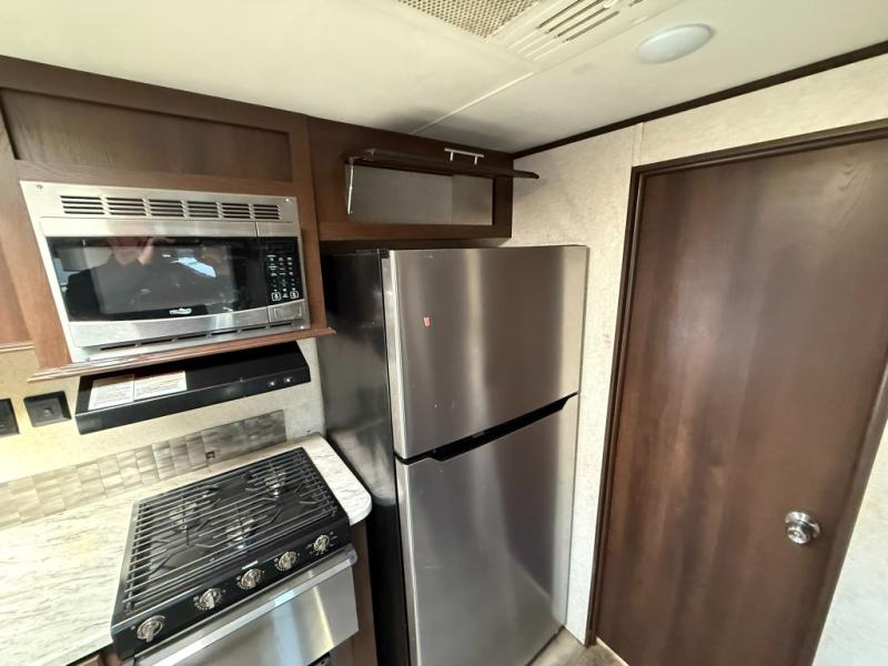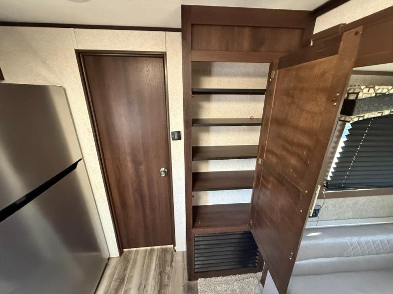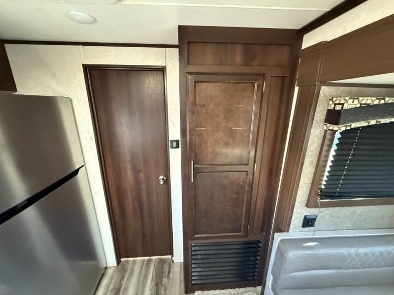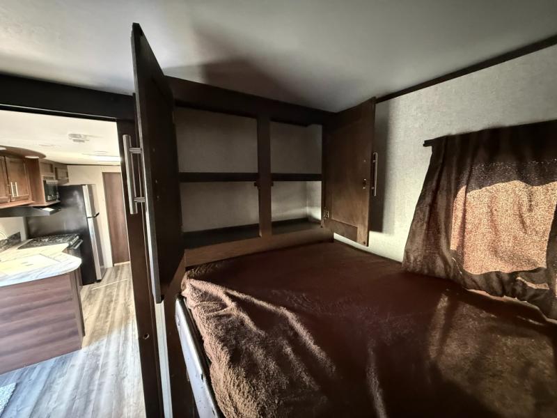 You will surely enjoy everything you find in this Jay Flight travel trailer. Just imagine the owners having their own master bedroom with a second exterior entry door as they walk through the full bathroom from the living area. The kids will have a place to call their own in the front bunkhouse which includes a hamper and dinette. So who will sleep on the top bunk? The main living and kitchen area offers a patio door allowing more sunlight inside, plus provides an amazing view of the great outdoors. You can stock up on perishables thanks to the 18 cu. ft. refrigerator. Come see how this trailer fits your family's lifestyle, plus you may choose a few options to make this the perfect RV for you!