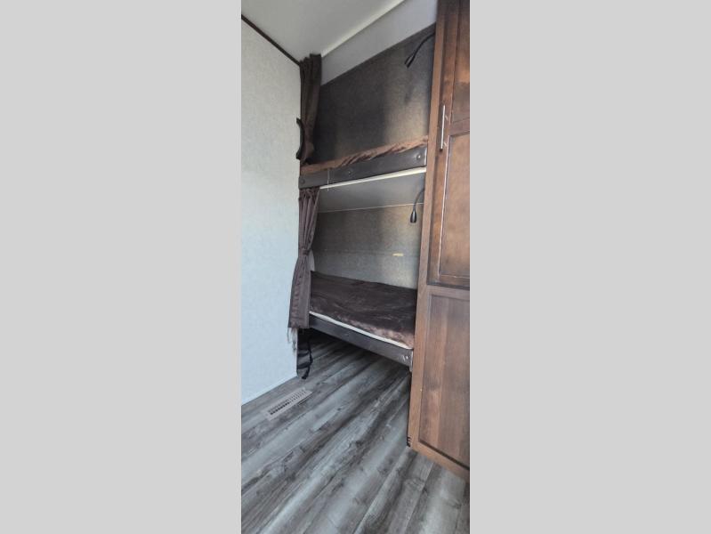 If you can imagine your whole family sleeping in a travel trailer at your favorite campground, take a look at this Jay Flight SLX 8 244BHS. Now imagine you and your spouse sleeping on a queen size Simmons mattress in the semi-private rear bedroom with the second entry while the kids sleep on the bunk beds up front once the bikes are unloaded from the bicycle storage. The bath is conveniently located by the main entrance for quick access when having fun outside. There is much more to find in this trailer that you will love on every trip!