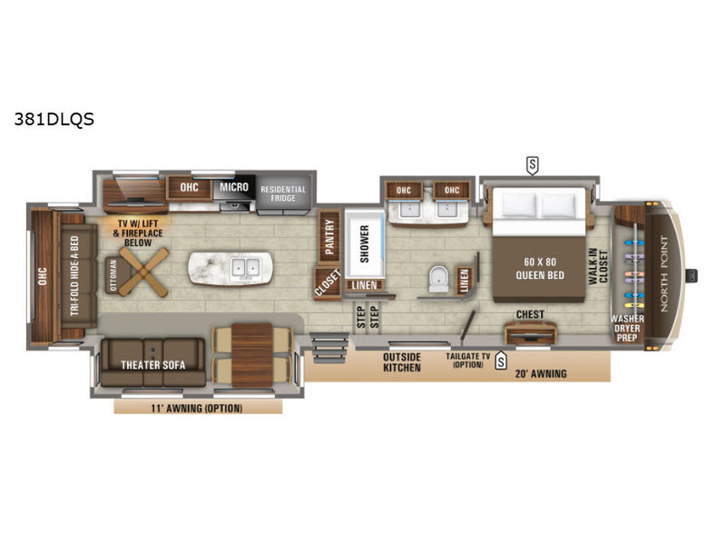 If you are ready to make each of your vacations the very best that it can be, then you need this North Point fifth wheel. With its dual opposing slides and a large kitchen island, you have plenty of room to make meal preparations an easy task, and if you get too warm while frying up some burgers on the three-burner range top, you can simply switch on the ceiling fan to allow a cool breeze to drift through. Your family and friends will thoroughly enjoy gathering together on the hide-a-bed sofa with an ottoman, the theater sofa with heat and massage, or the free-standing table with chairs as you serve up a hot apple pie or ice cream sundaes for dessert, and you will simply adore the large bathroom with an illuminating skylight as you get ready each morning and wash your face at the dual-sink vanity.