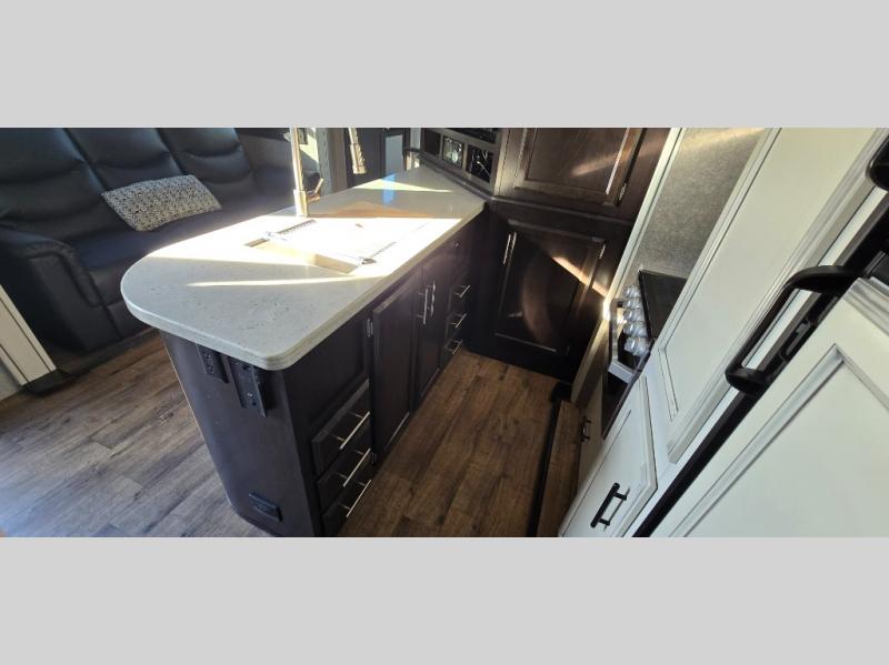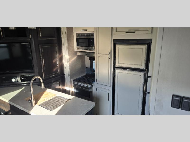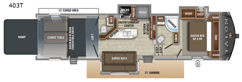 With this Talon toy hauler you can have everything! From the luxurious private bedroom to the packed-out 13' separate garage with an electric queen bunk and convertible sofas, you will find plenty of space for all of your guests to sleep because this unit can sleep nine people each evening. Gathering around the convertible sofas with a cargo table in between for a round of cards or an evening meal will be your family's favorite way to spend the night, and the full kitchen with its 8 cubic foot double-door refrigerator and 3-burner range top will make it easy to whip up all of those meals.