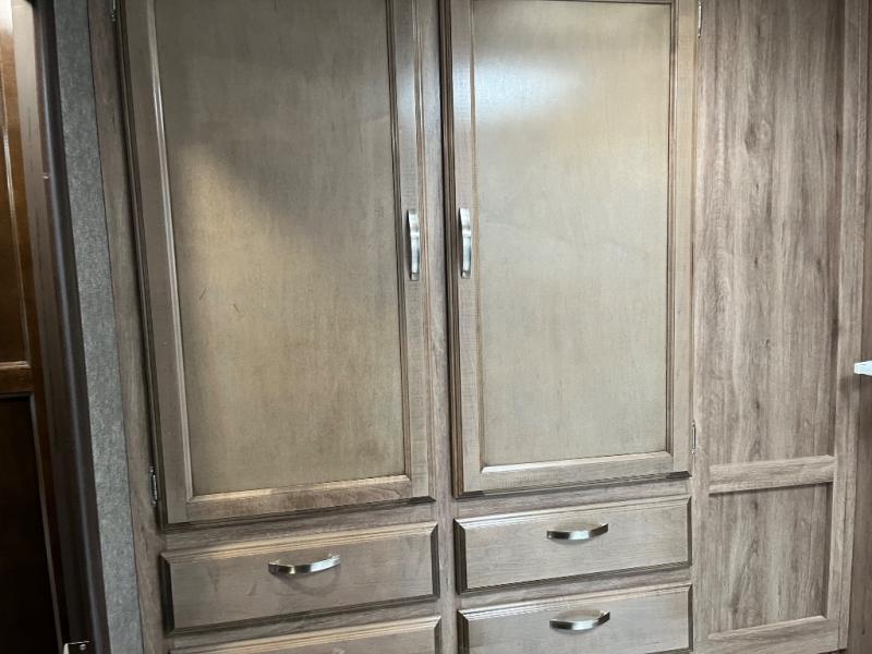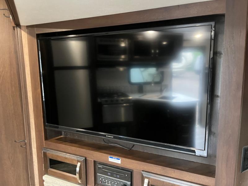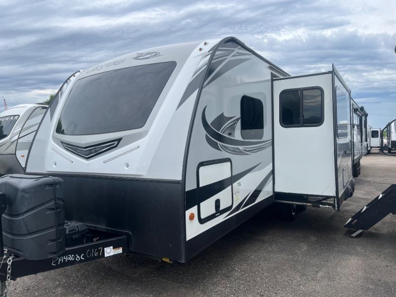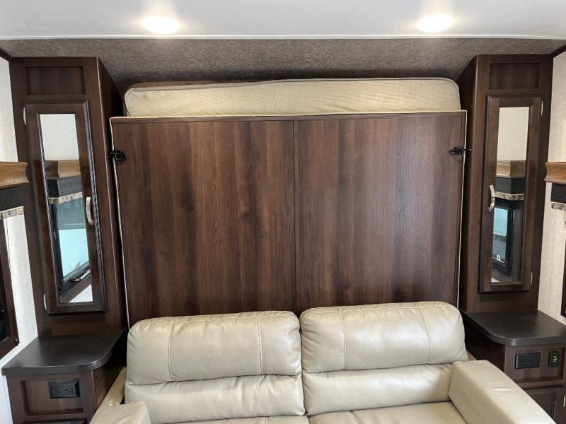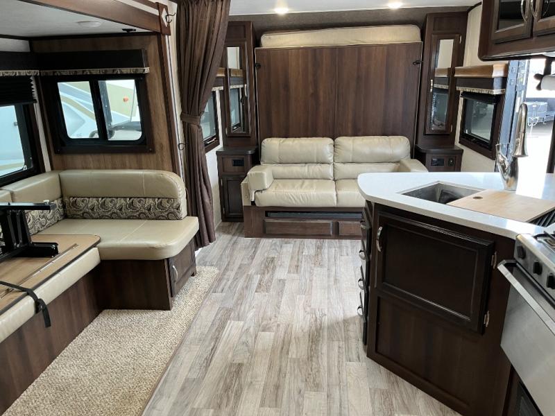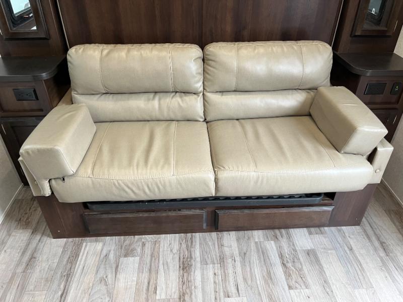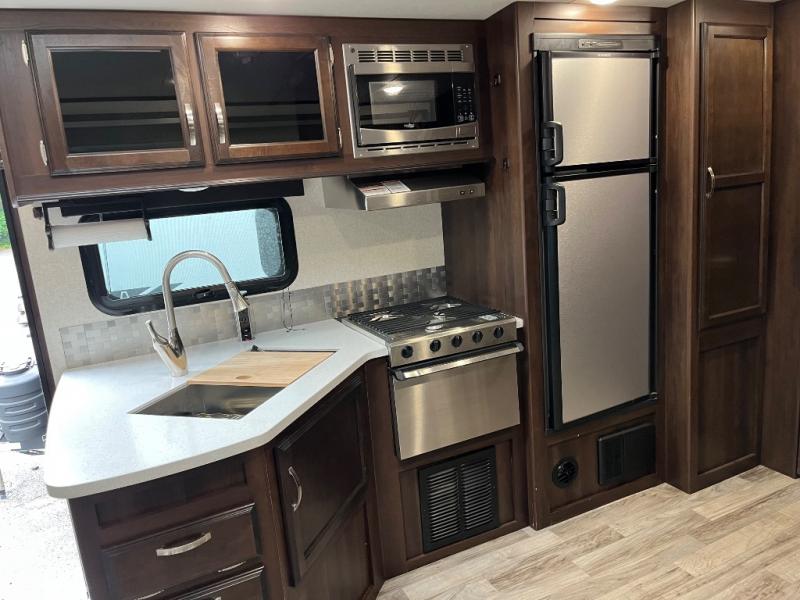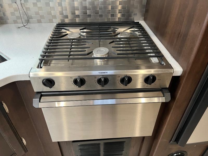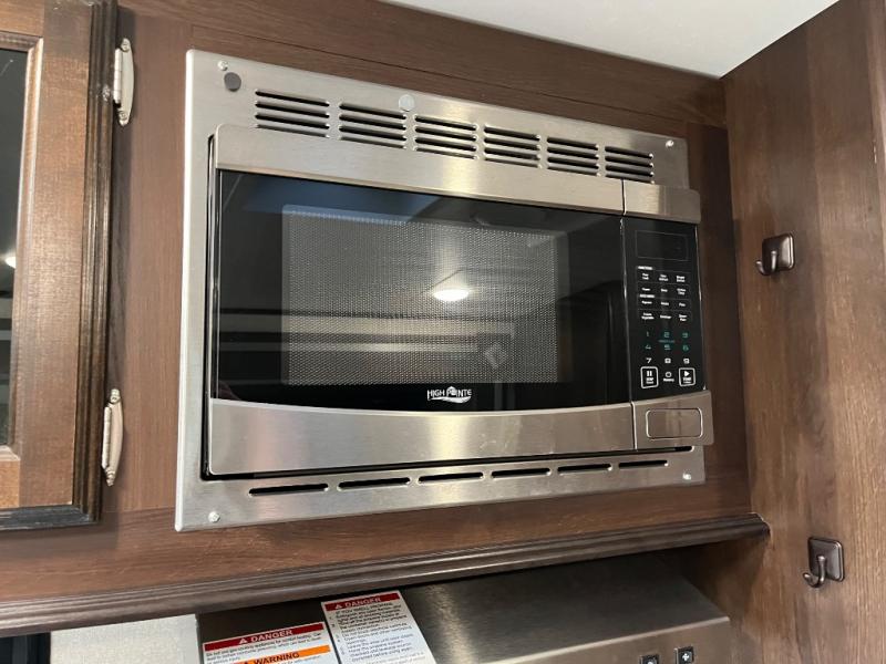 This White Hawk travel trailer is a wonderful addition to any family who is looking for an RV that delivers style and reliability. The stainless steel appliances allow you to cook and store dinner with ease, and in this unit, you aren't restricted to only cooking dinner indoors because you can take the entire party outside of the trailer to the outdoor kitchen. After a long night of fun underneath the 20' electric awning, you can rest comfortably indoors on the Murphy bed that now allows 100% access to the exterior pass-through storage.