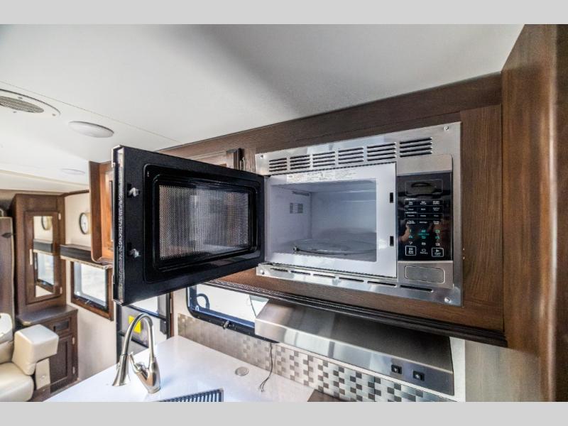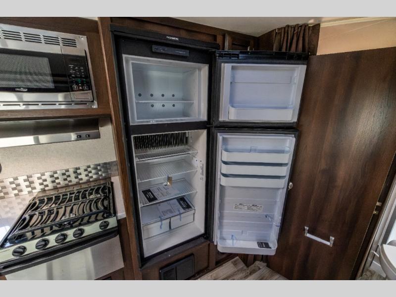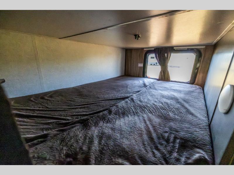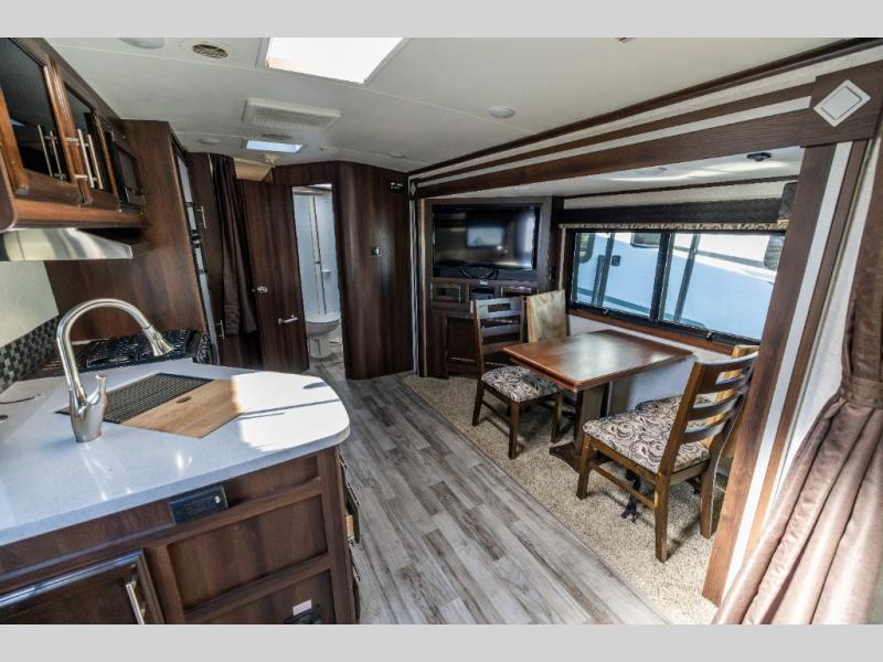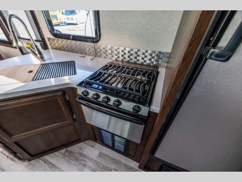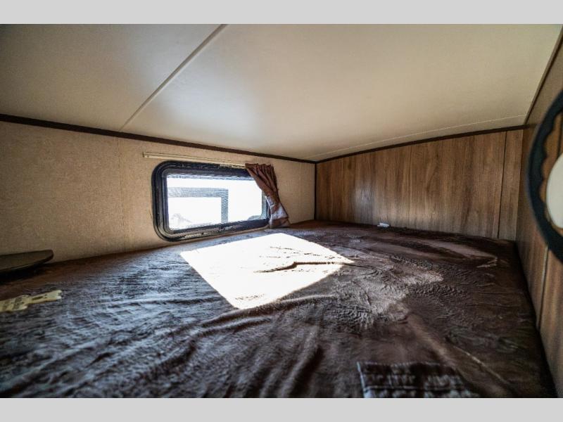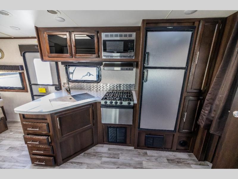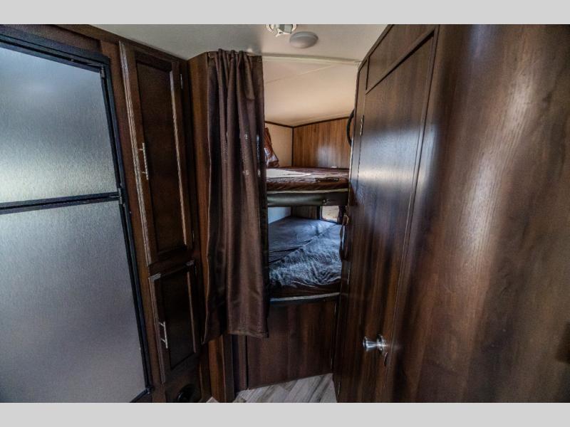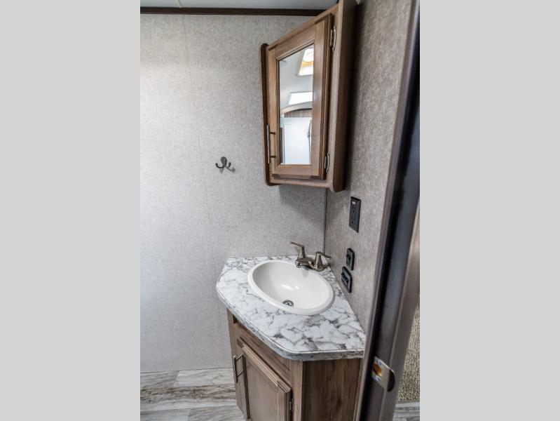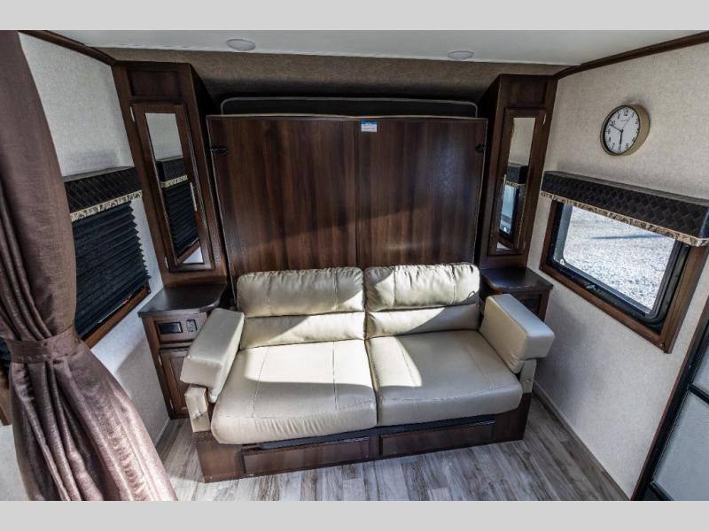 Traveling in this White Hawk travel trailer is like traveling in the lap of luxury. With the addition of the Murphy bed, you can decide whether or not you want the front of the trailer to be used as extra seating for the living area or as a semi-private bedroom. The semi-private bunks give you the space that you need in this model to sleep seven people comfortably. If you get tired of spending every day cooking indoors, then you can take your preparations outside to prepare dinner in the outdoor kitchen, and the bathroom skylight allows some of that outdoor sunshine to brighten up the 34" radius shower.