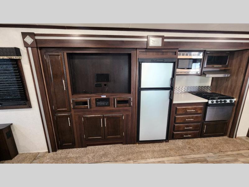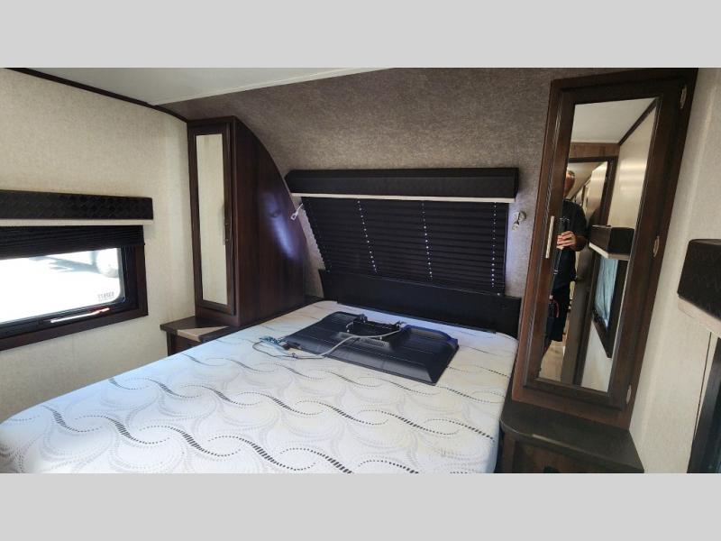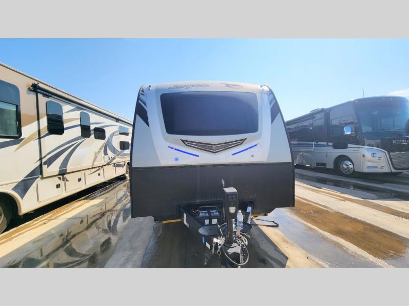 With this White Hawk travel trailer you won't have to sacrifice style for comfort. Every inch of space in this unit has been utilized to get you the most out of your living and storage areas. The inclusion of two slides gives this trailer a beautiful open-concept kitchen and living space that is able to house all of the residential appliances needed for a proper home-cooked dinner. The master suite in the front of this trailer allows you to have the privacy you are accustomed to, and after a restful night's sleep on the Jayco-exclusive Simmons mattress, you will wish you didn't have to get up in the morning.
