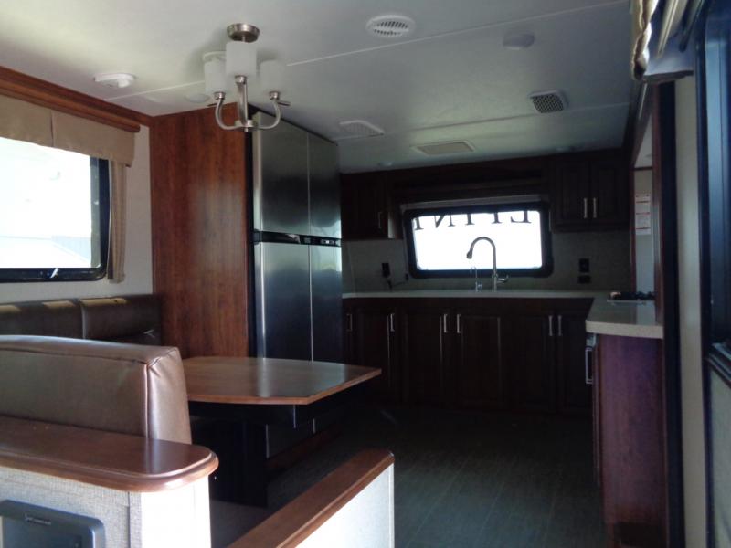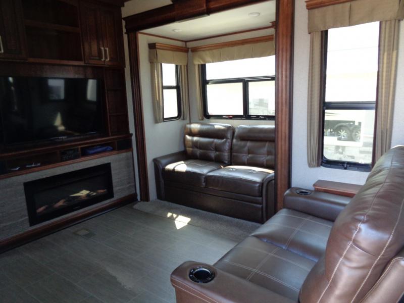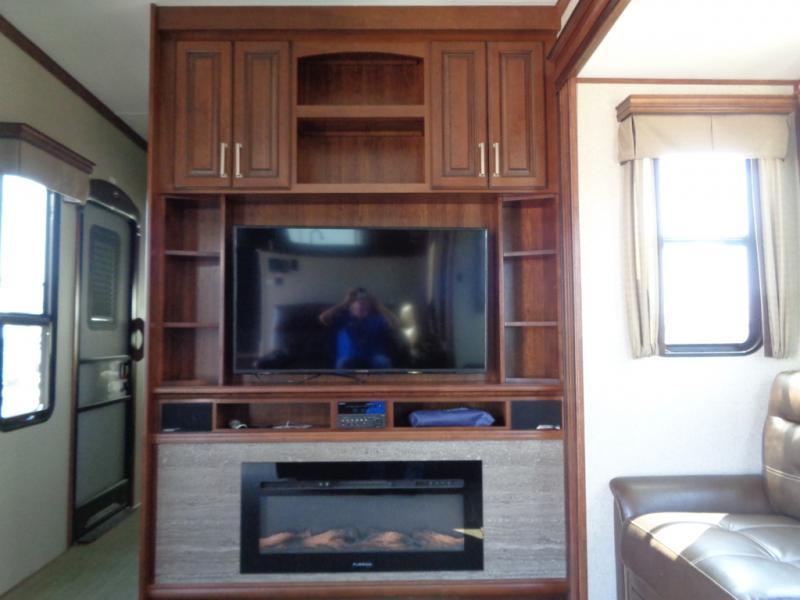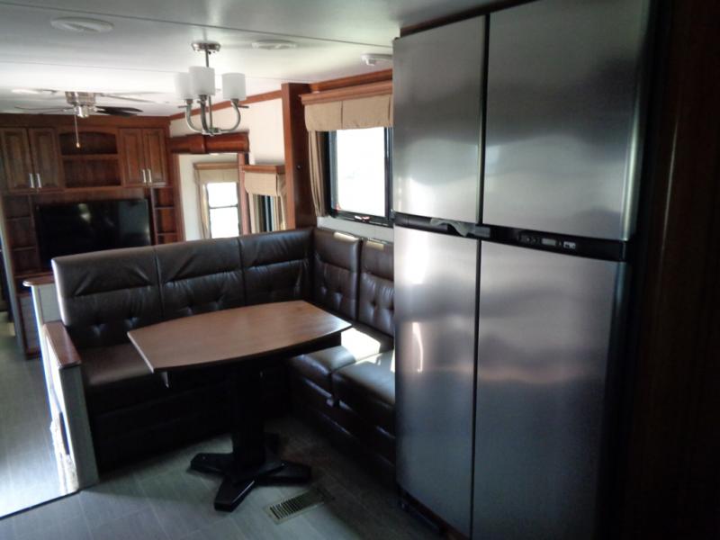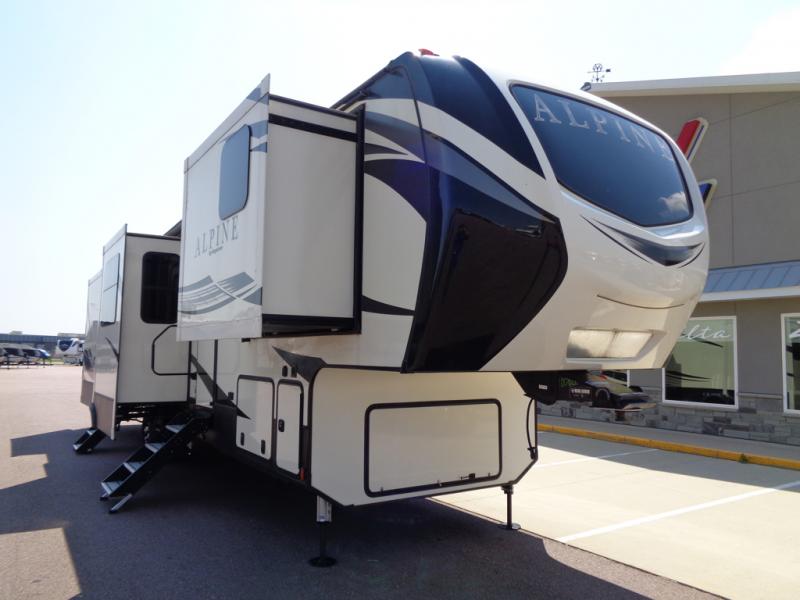 For complete comfort and luxury throughout, choose this Alpine fifth wheel by Keystone RV. You will find a unique front kitchen with an 18 cubic foot refrigerator and convection microwave, and in the spacious living area you will find theater seating, a fireplace, a 50" LED TV, and dual opposing slides with a tri-fold sofa sleeper. When you are ready to rest up for another day of fun, head to the rear private bedroom where there is a king-size bed with plenty of storage underneath.