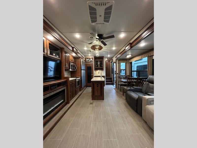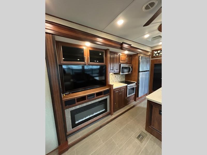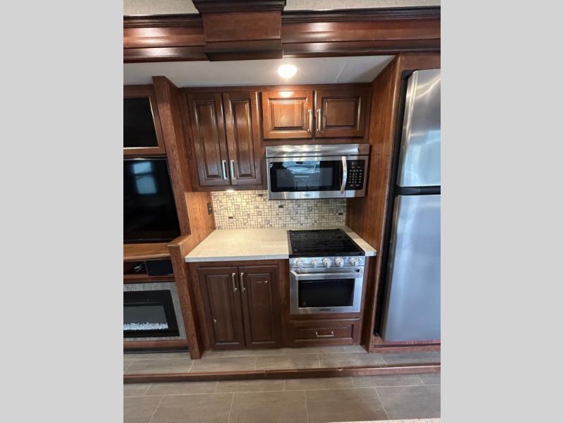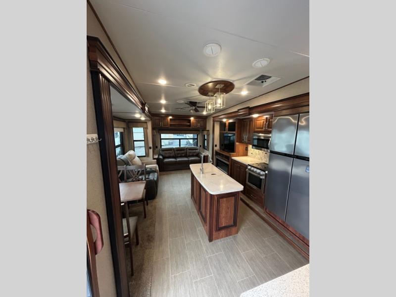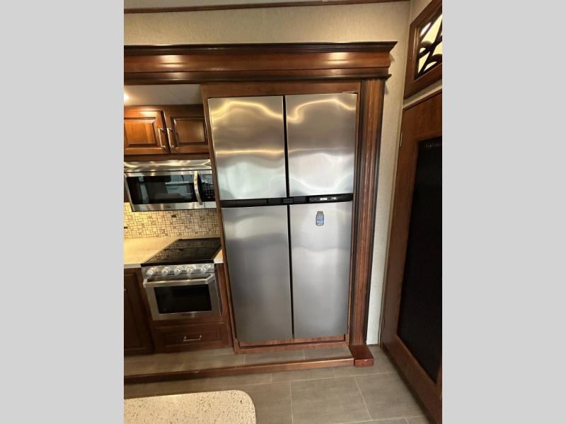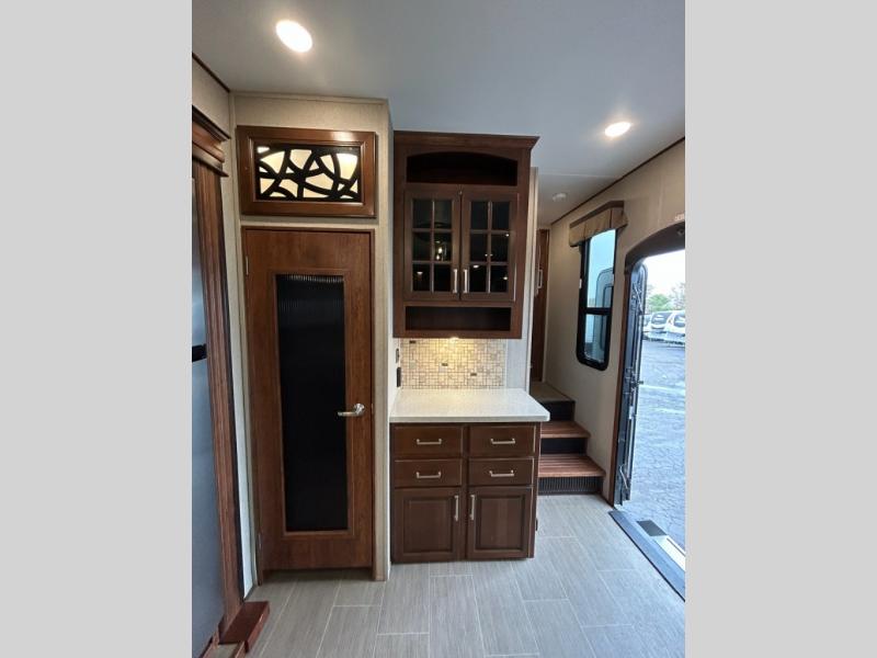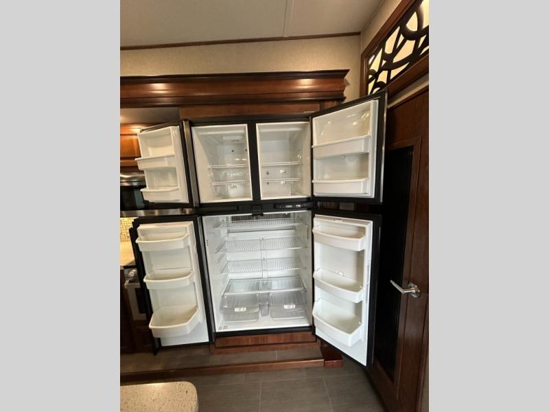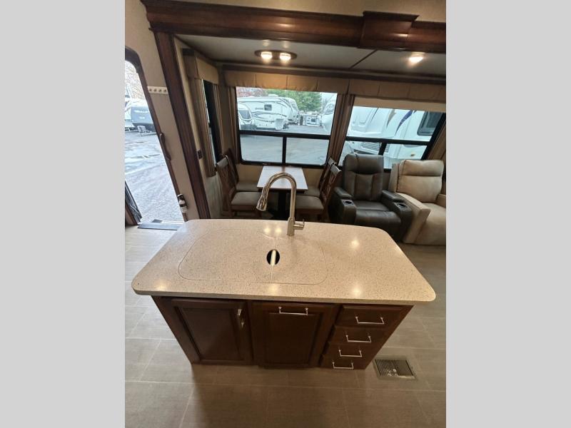 The perfect RV for entertaining and relaxing is this Keystone Avalanche fifth wheel. The combined living and kitchen area includes dual opposing slides for more floor space as you work around the kitchen island and more seating accommodations as you gather together each night on the sofa sleeper, the theater seating featuring heat and massage, or the free-standing table with chairs. This unit also offers a fully loaded kitchen with an 18 cubic foot refrigerator, a three-burner range top, a large pantry, and a curio cabinet.