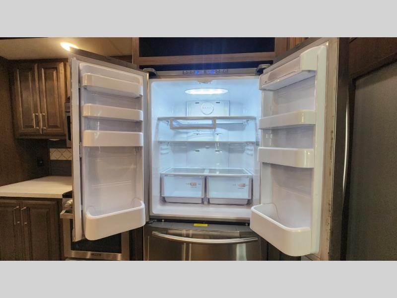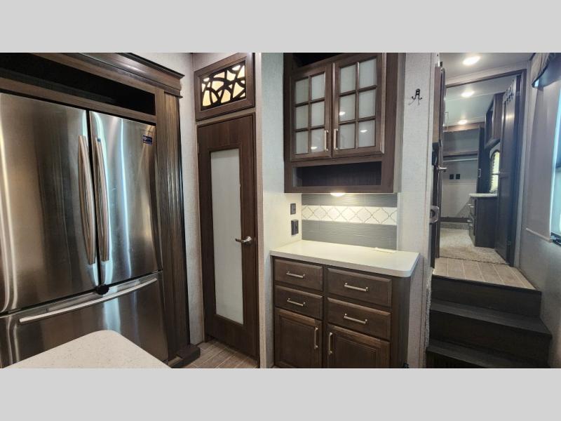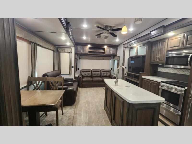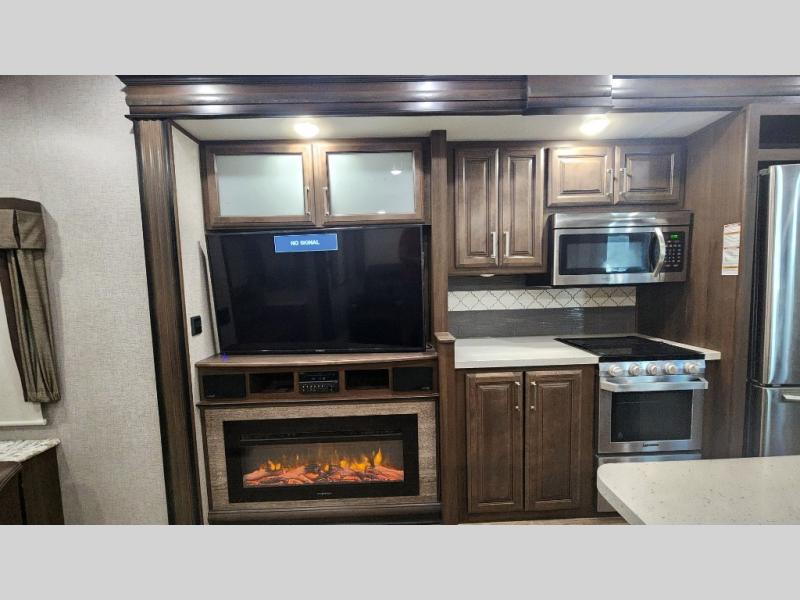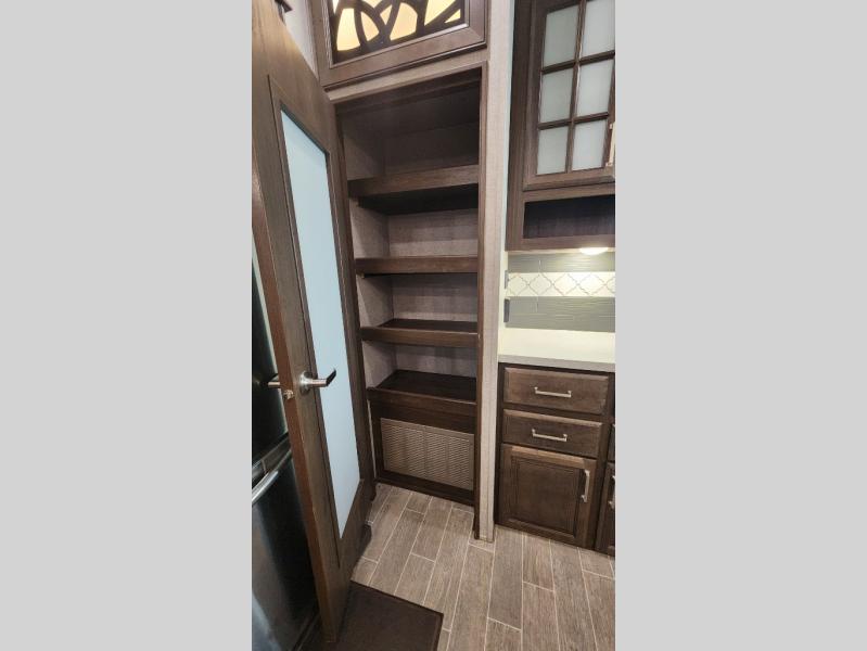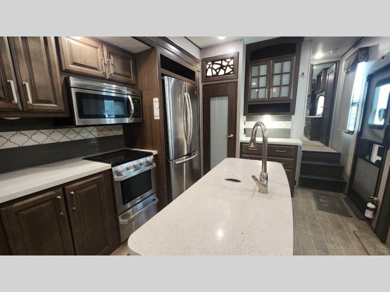 The perfect RV for entertaining and relaxing is this Keystone Avalanche fifth wheel. The combined living and kitchen area includes dual opposing slides for more floor space as you work around the kitchen island and more seating accommodations as you gather together each night on the sofa sleeper, the theater seating featuring heat and massage, or the free-standing table with chairs. This unit also offers a fully loaded kitchen with an 18 cubic foot refrigerator, a three-burner range top, a large pantry, and a curio cabinet.