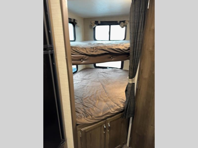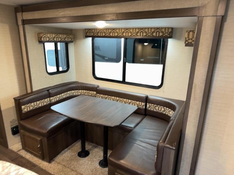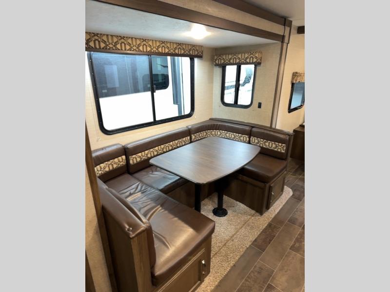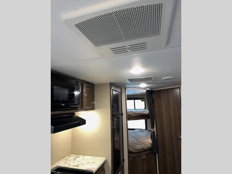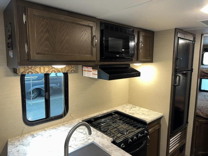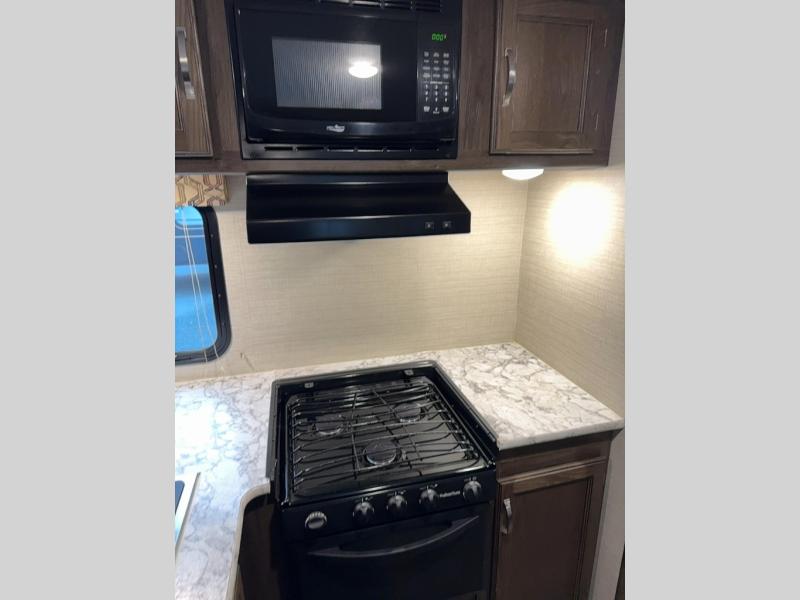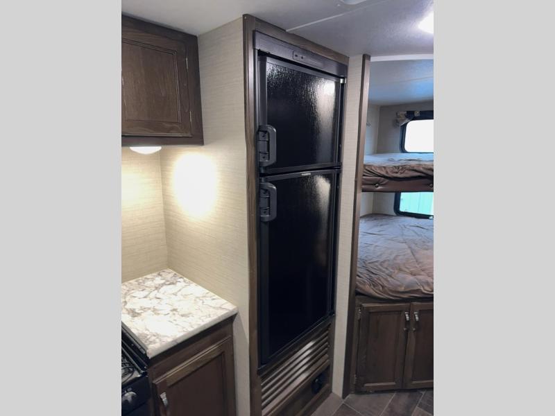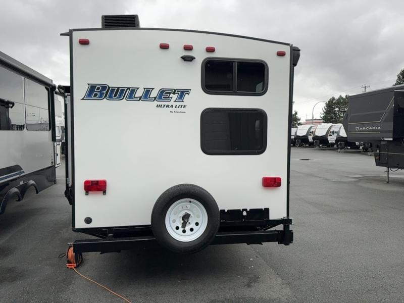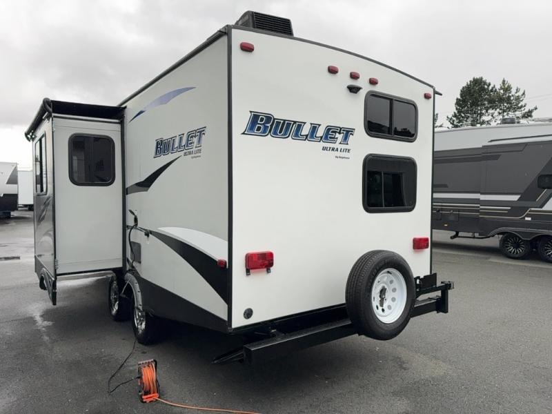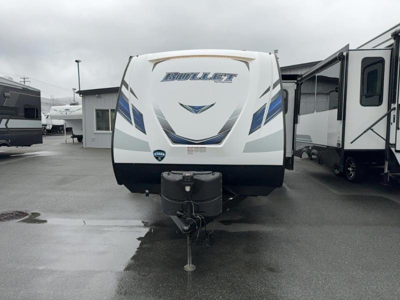 Load up your family and set out to your favorite campground with this single-slide Bullet travel trailer. You will enjoy the privacy that the front, private bedroom delivers, and your kids will love the set of double-size bunks for their ability to make play time unforgettable. The U-shaped dinette will add extra sleeping space each night and will give you the perfect place to gather together as a family for your meals that have been prepared on the three-burner range top in the kitchen.